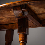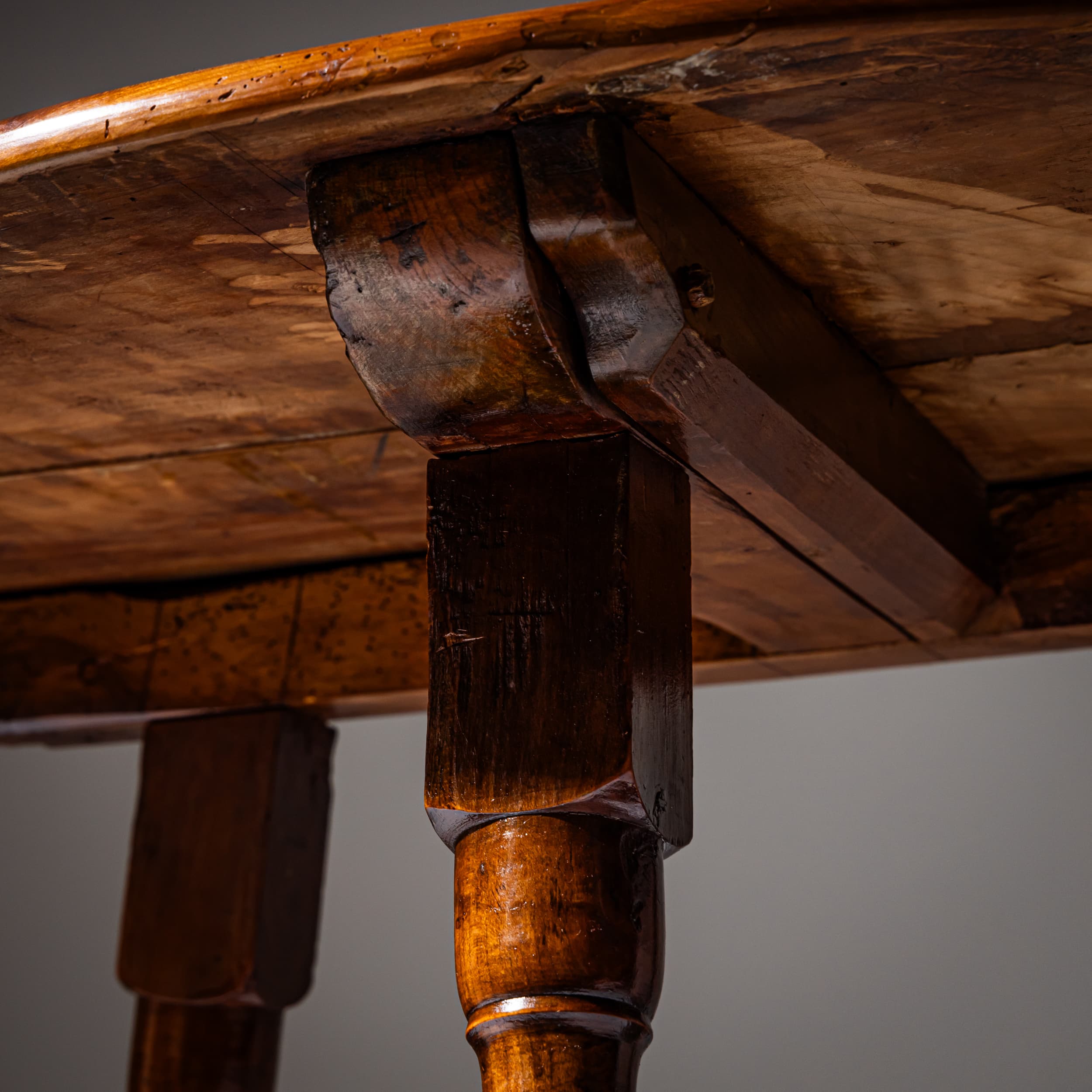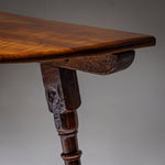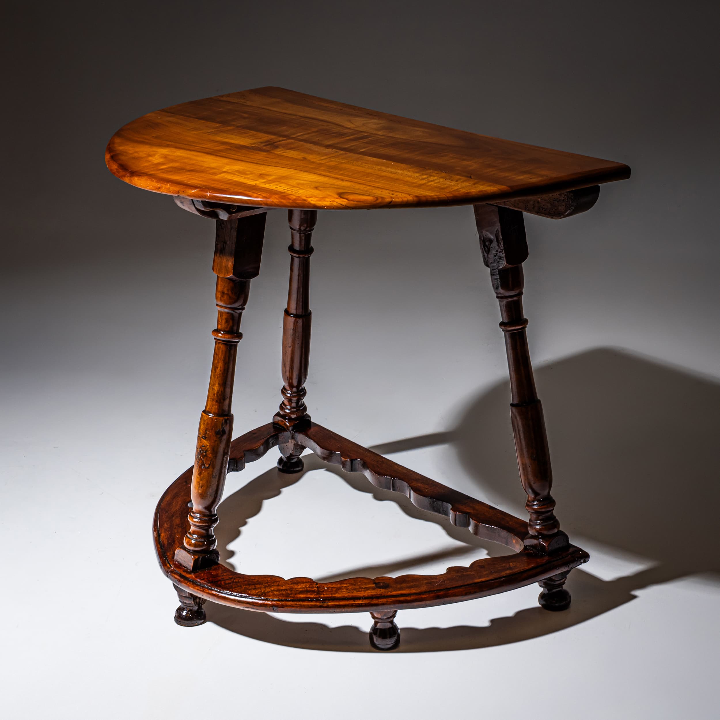 Barocker Konsoltisch mit D-förmiger Tischplatte und drei Balusterbeinen. Der ausgeschnittene Standring ist ebenfalls in Demi-Lune-Form ausgeführt und greift die Kontur der Platte auf. Gefertigt aus massivem Nussbaum, gewachste Oberfläche. Unrestaurierter Zustand.