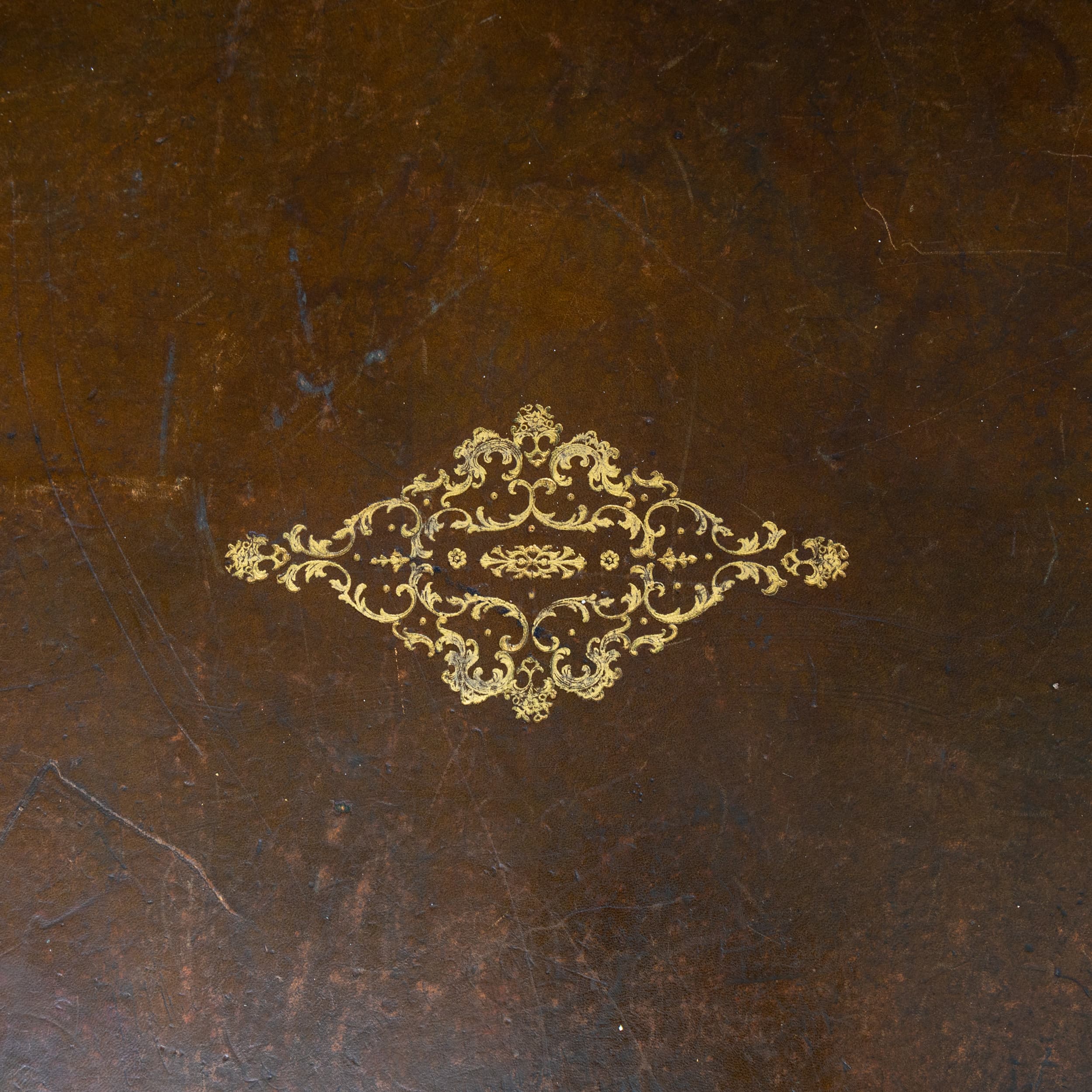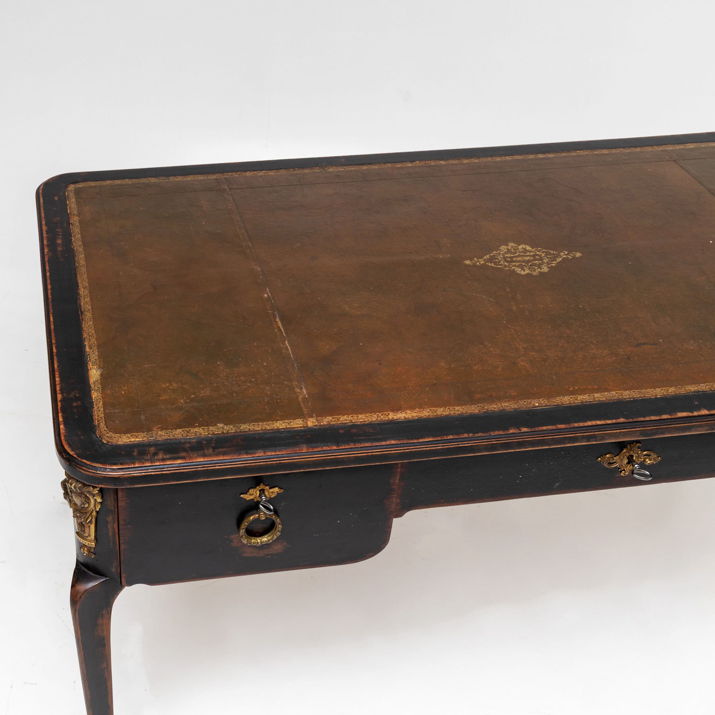 Schreibtisch im Barockstil mit lederbezogener Rechteckplatte und drei Schubladen in der Front. Ausgestattet mit Ringbeschlägen und dekorativen Bronzemontierungen. Geschweifte Beine mit vergoldeten Sabots und schwarz patinierter Oberfläche.