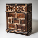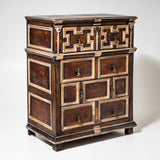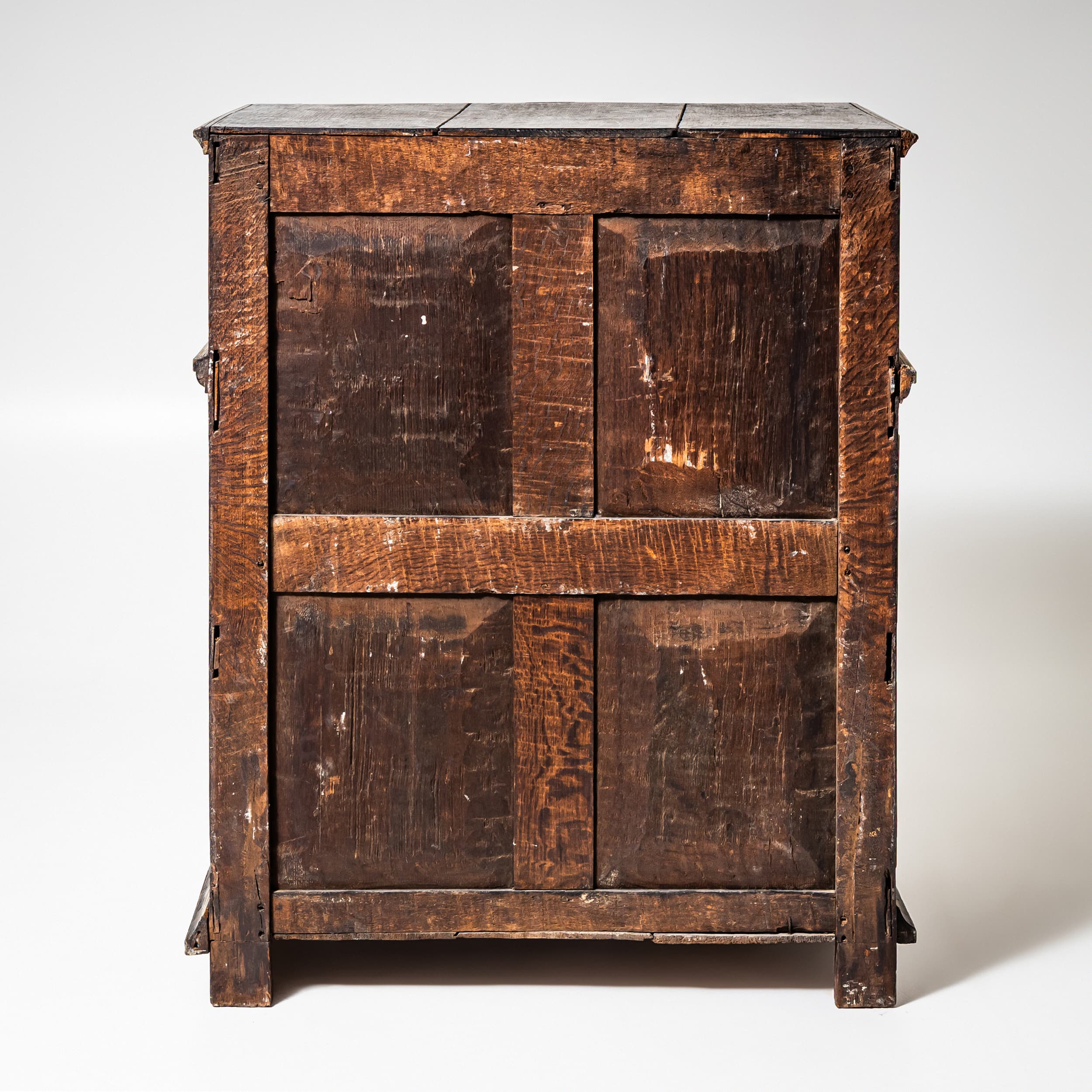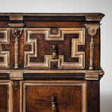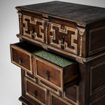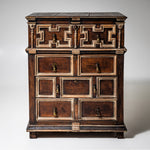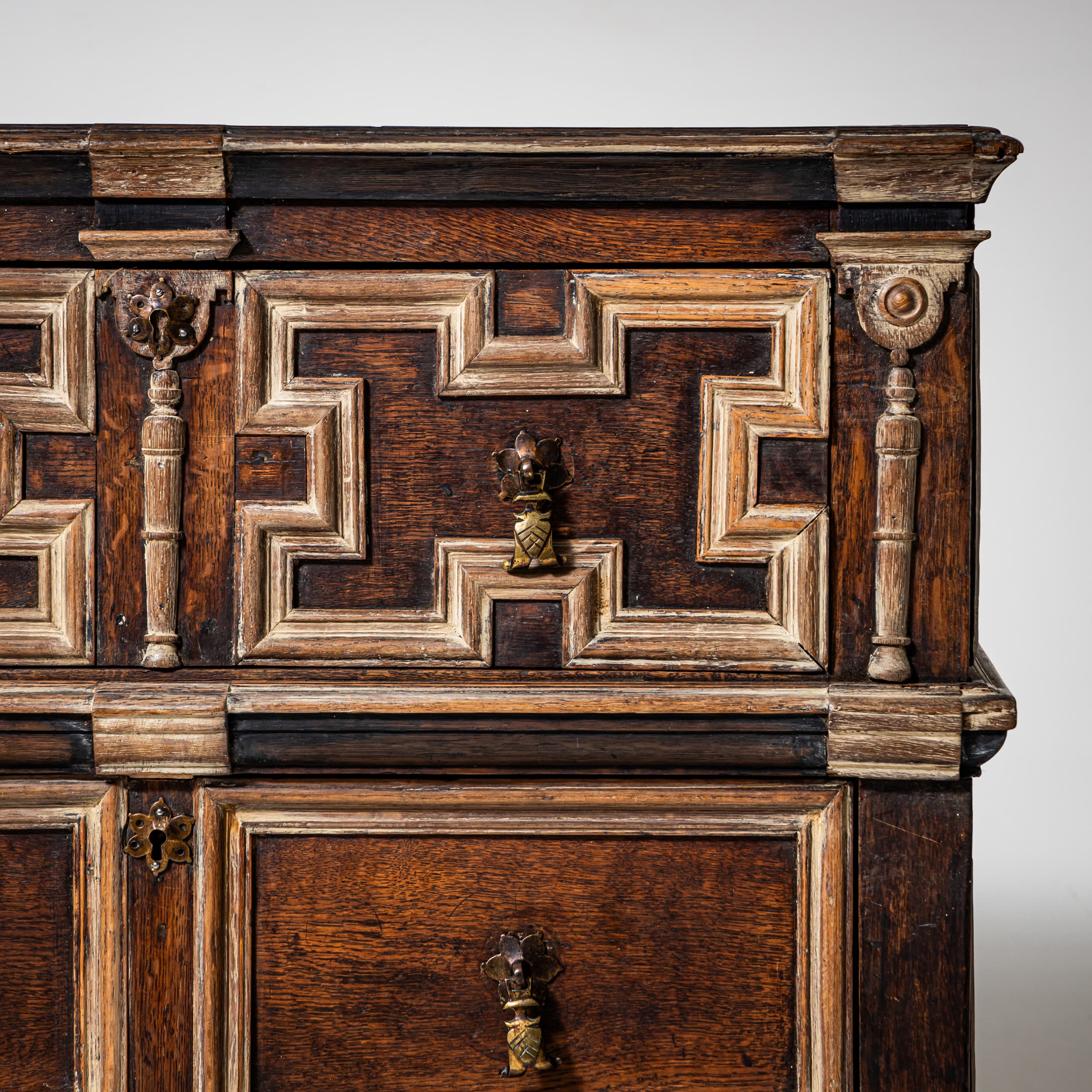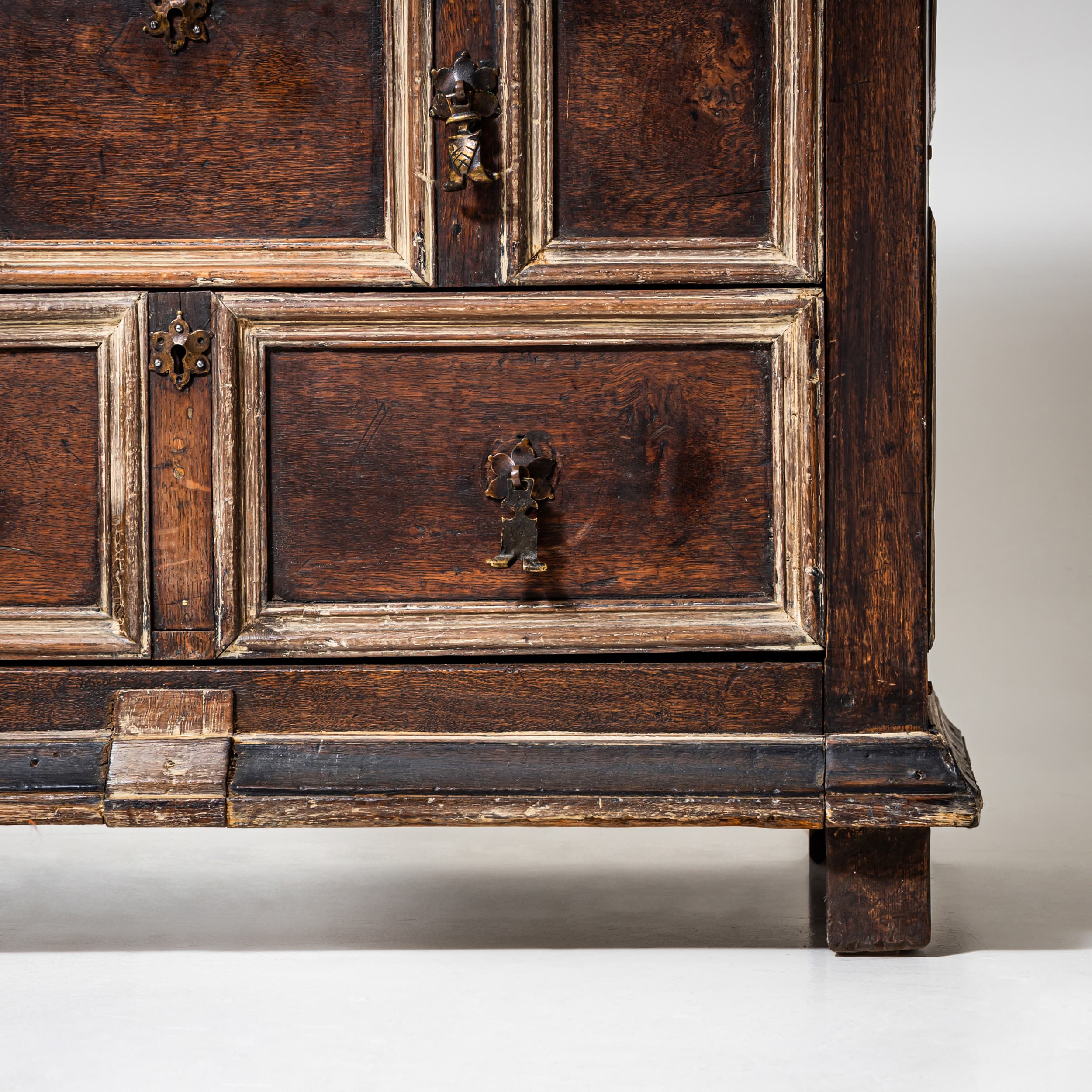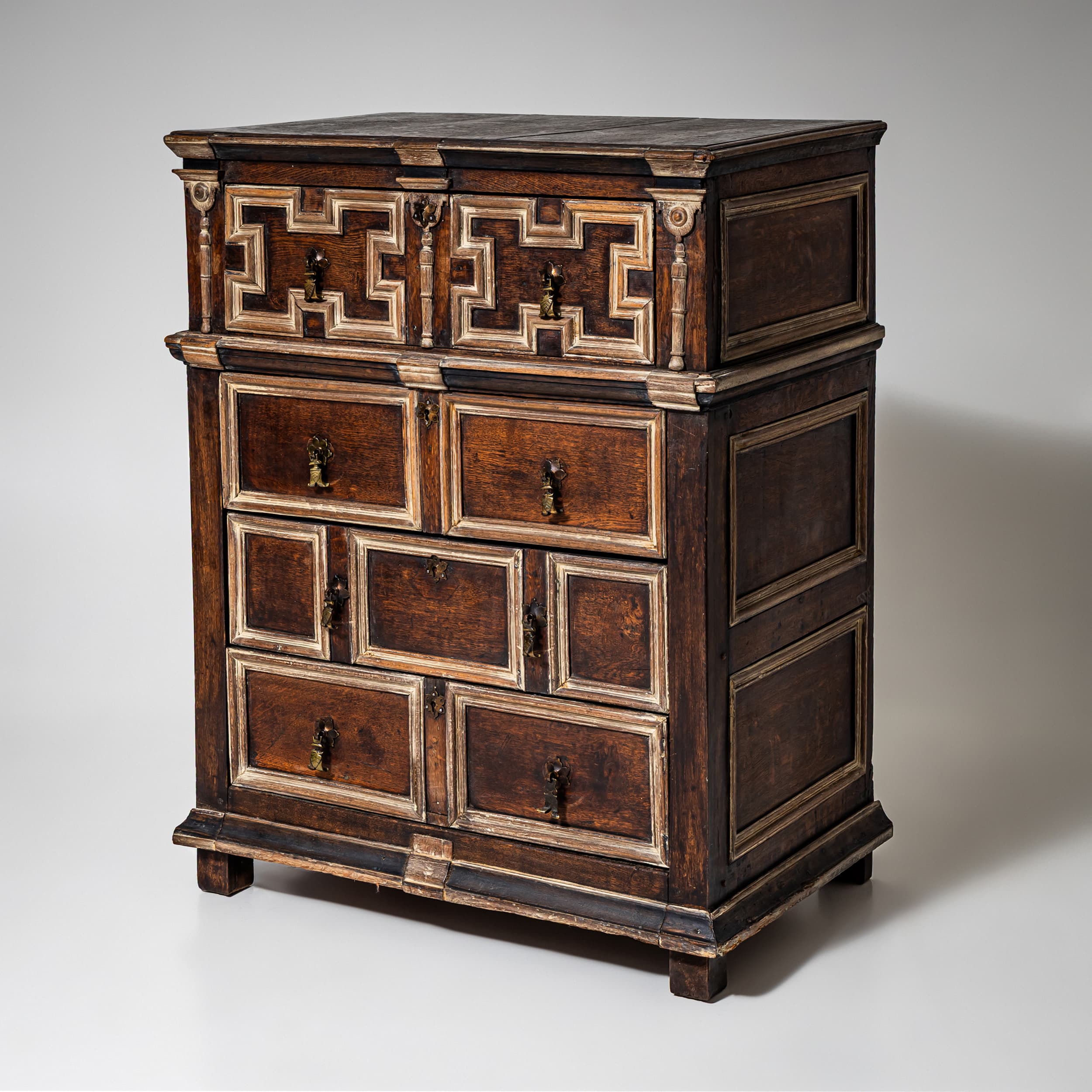 Kommode mit vier Schubladen sowie kassettierten Fronten und Seiten. Die einzelnen Flächen sind durch profilierte Rahmen gegliedert, die durch die gekalkte Oberfläche besonders hervorgehoben werden und der Kommode eine markante Tiefenwirkung verleihen.