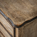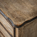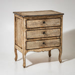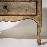 Bemalte Kommode im Barockstil mit drei Schubladen und leicht geschweiftem Untergestell. Die Fronten sind schlicht gerahmt und mit zurückhaltenden Schlüsselschildern aus Metall versehen. Die Oberfläche zeigt eine neue, bewusst ausgearbeitete, vielschichtige Patina mit erdigen Grau- und Beigetönen, die dem Möbel einen authentischen, historisch anmutenden Charakter verleiht. Die geschweiften Beine und die ausgeschnittene Zarge unterstreichen die barocke Formensprache.