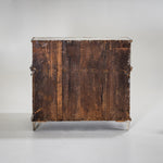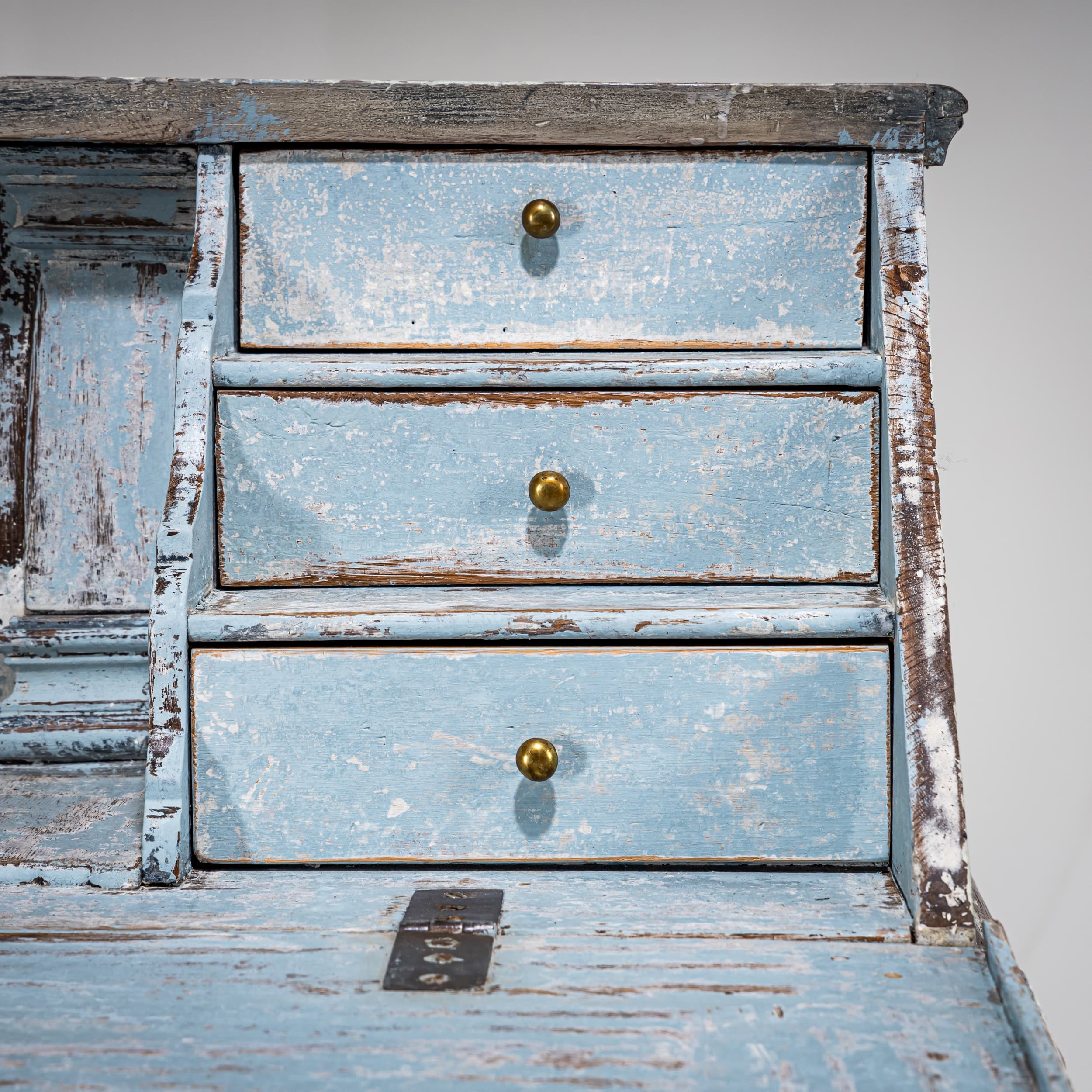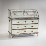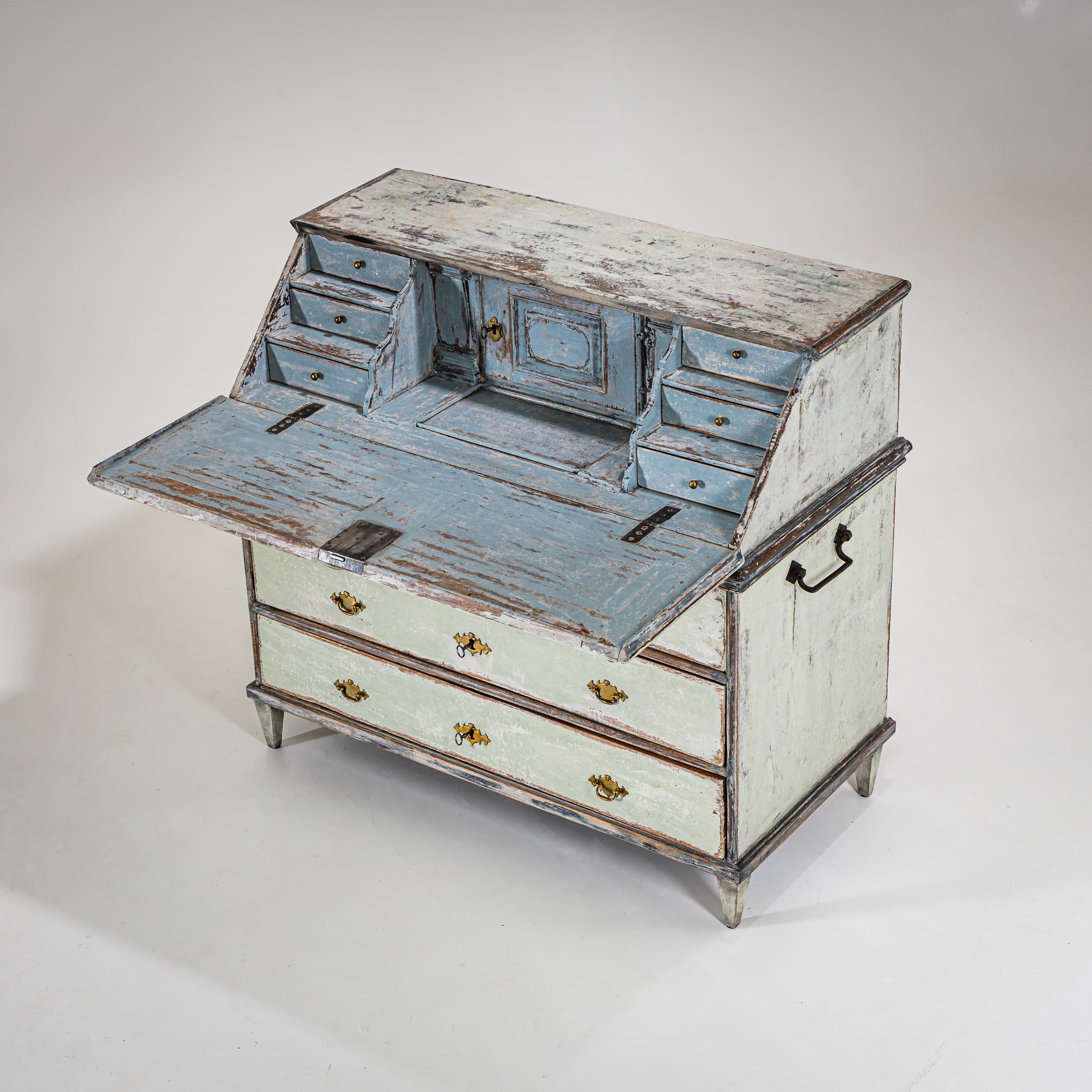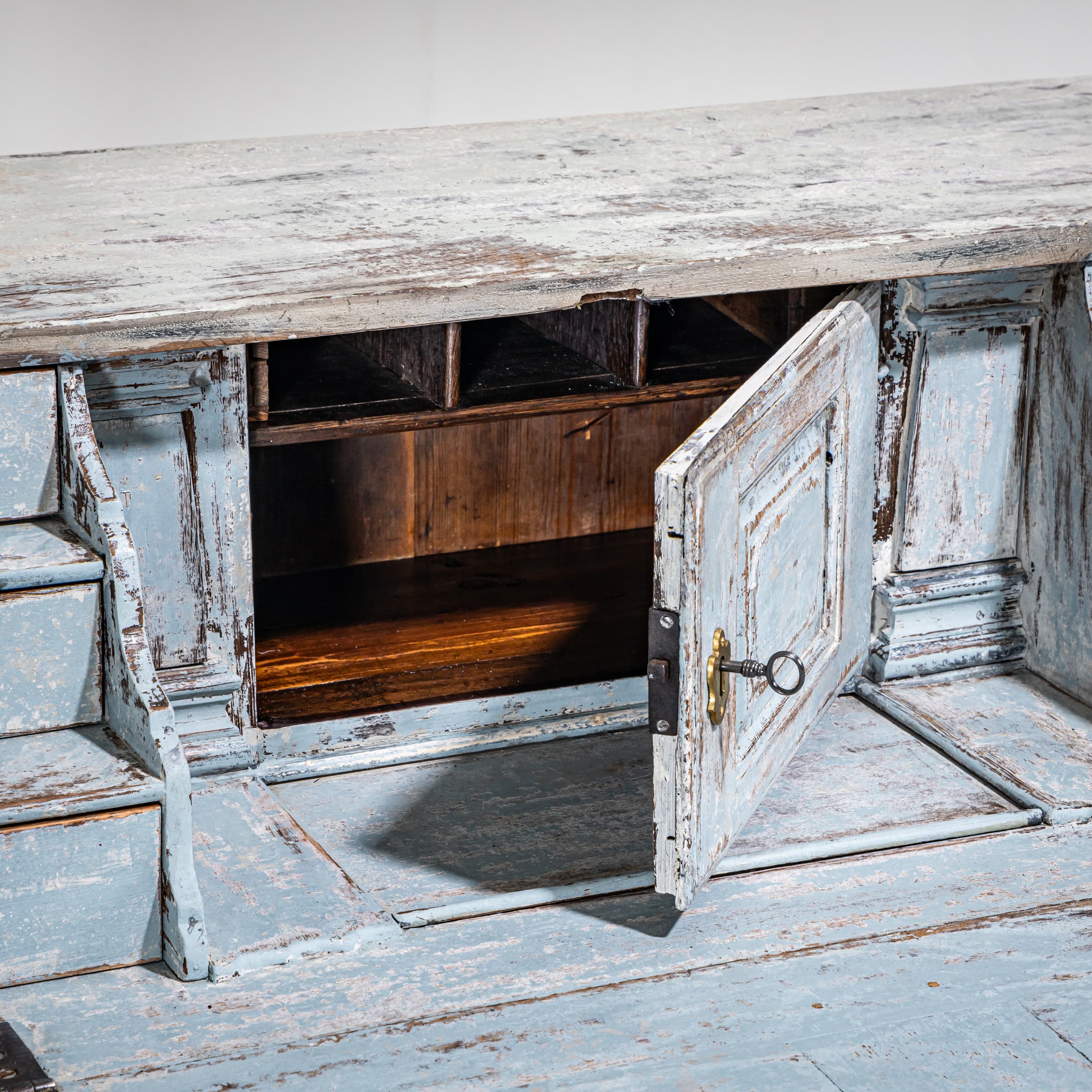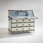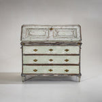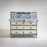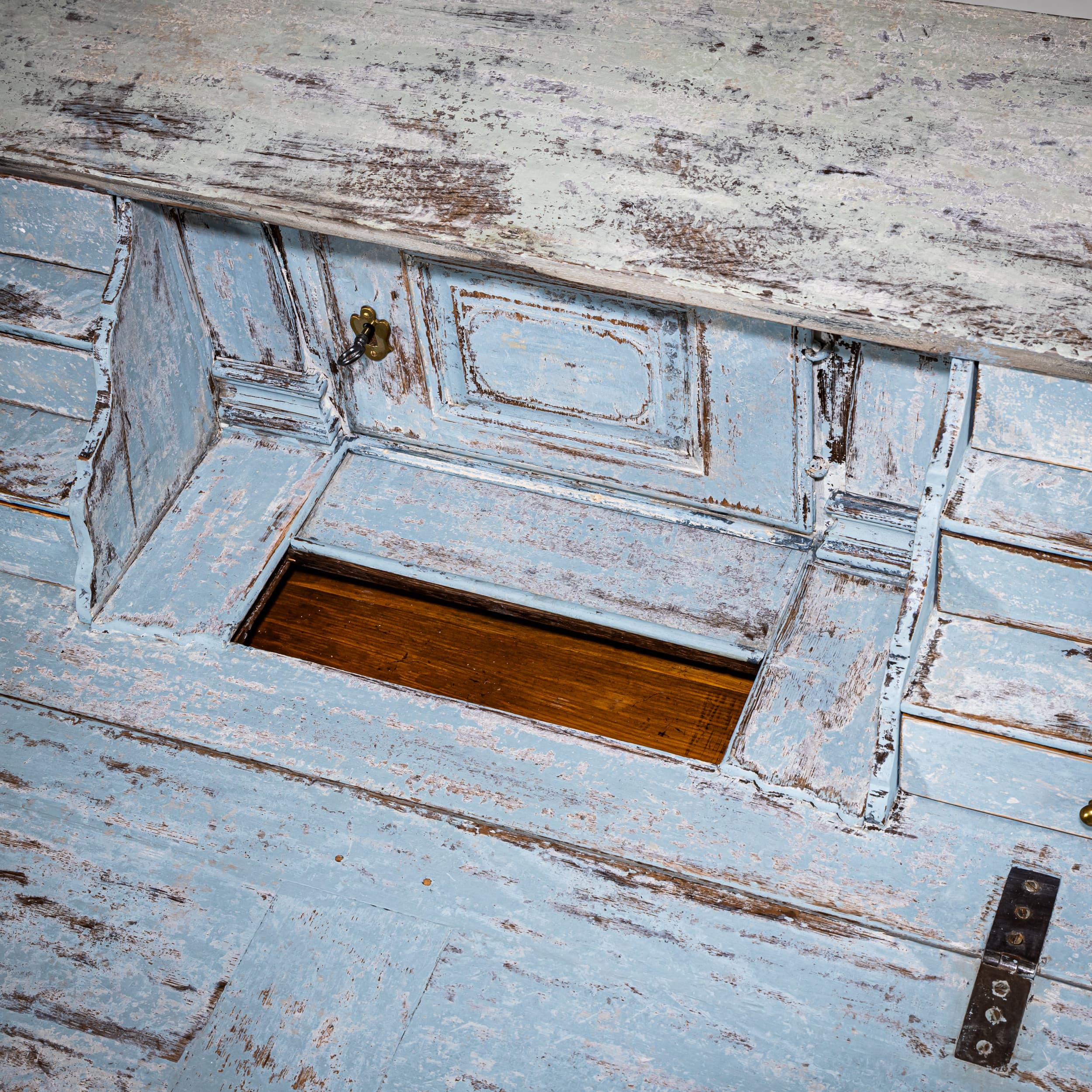 The interior is arranged with small graduated drawers surrounding a central lockable compartment. The light blue-green painted finish is newly executed and antiqued with patina.
