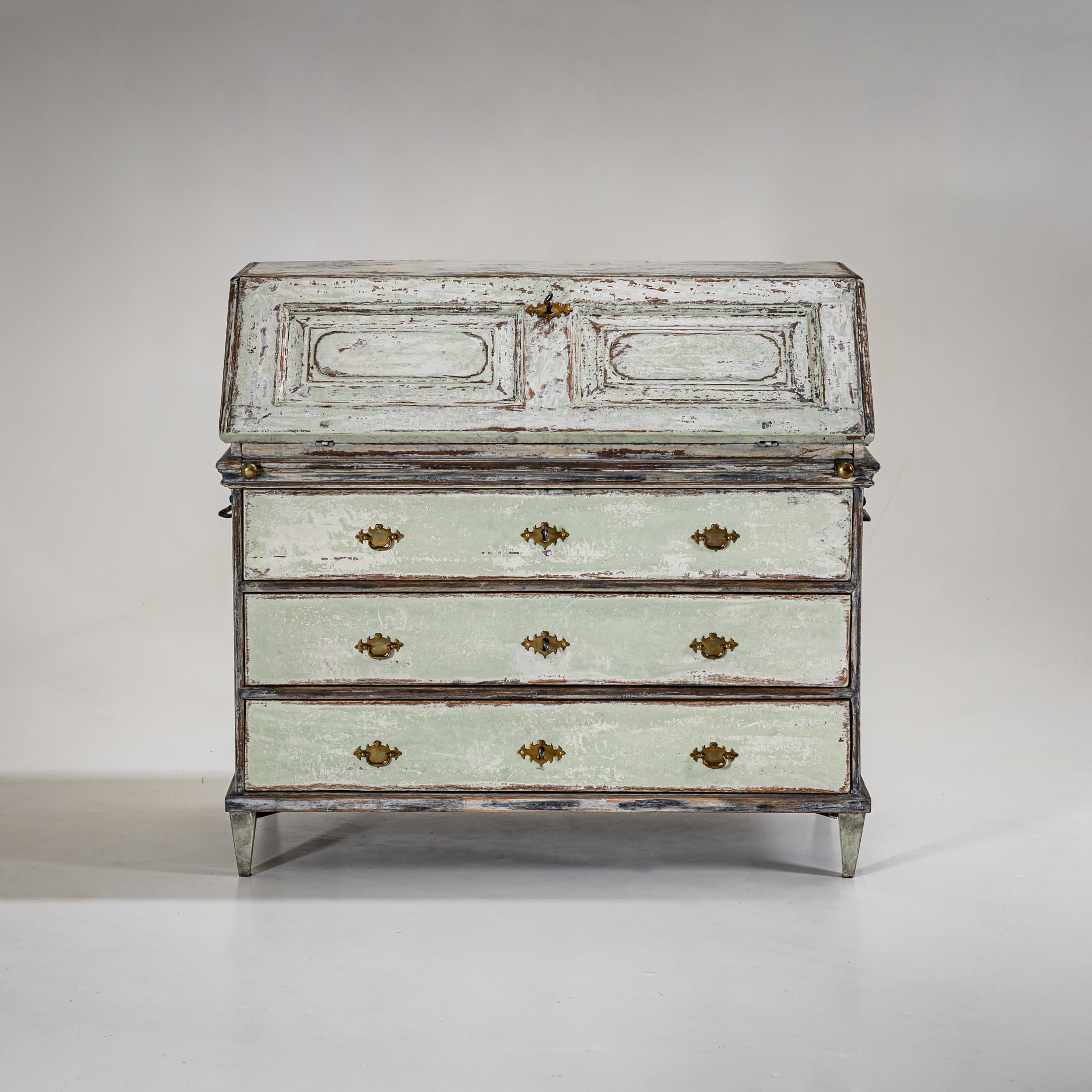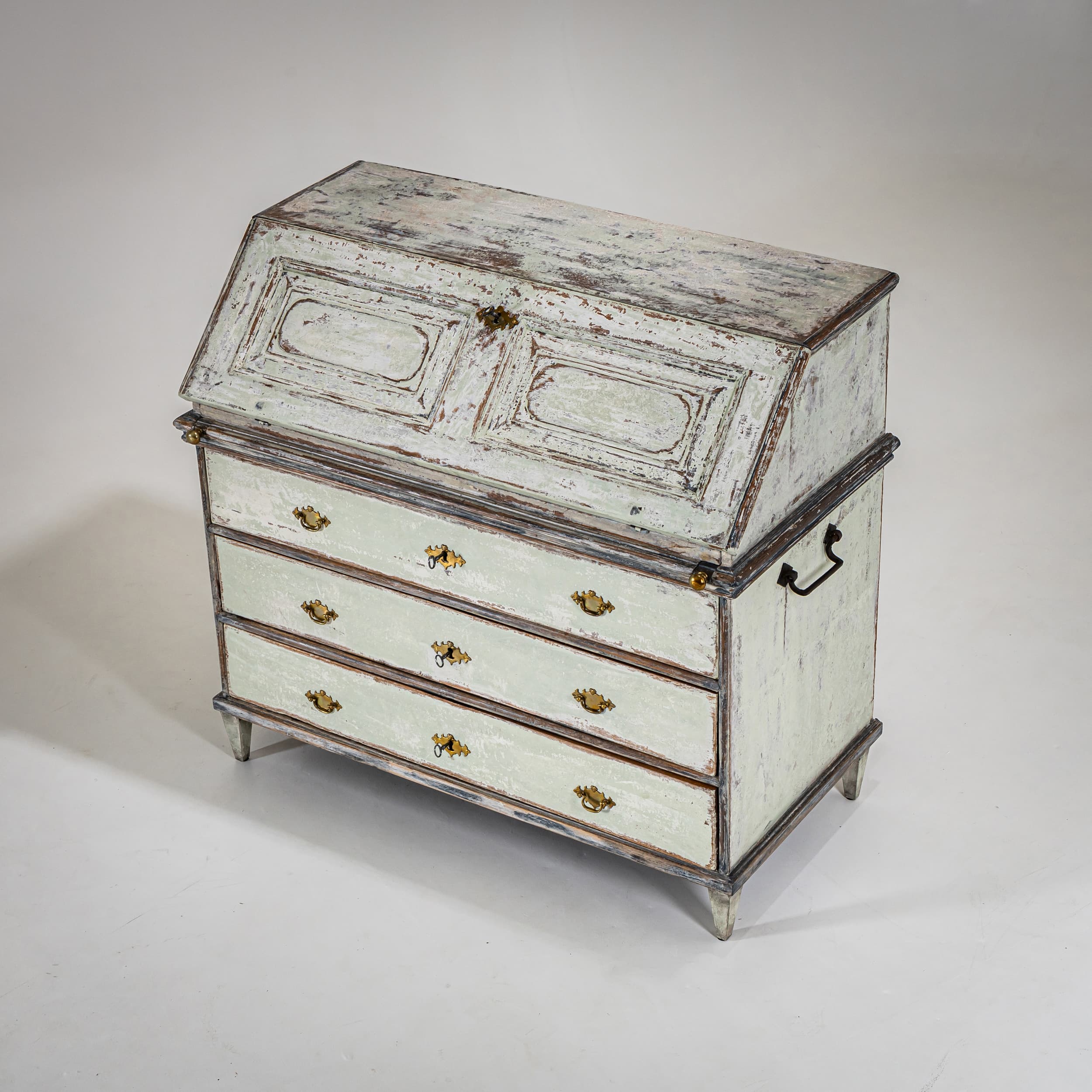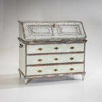 Baroque secretary with three drawers and slant-front writing flap decorated with recessed panels. Fitted with iron side handles and brass mounts. Below the upper section are two pull-out supports for the writing flap.