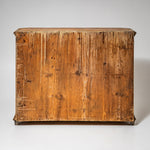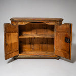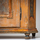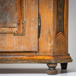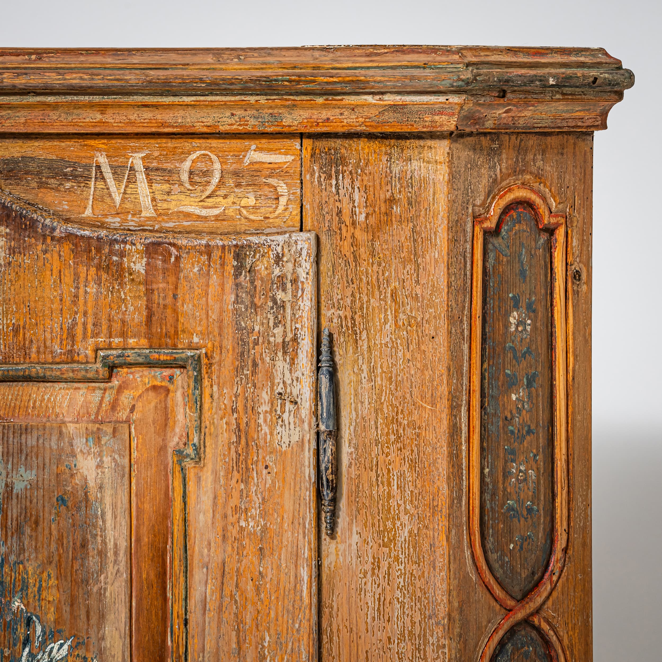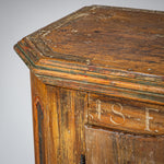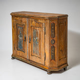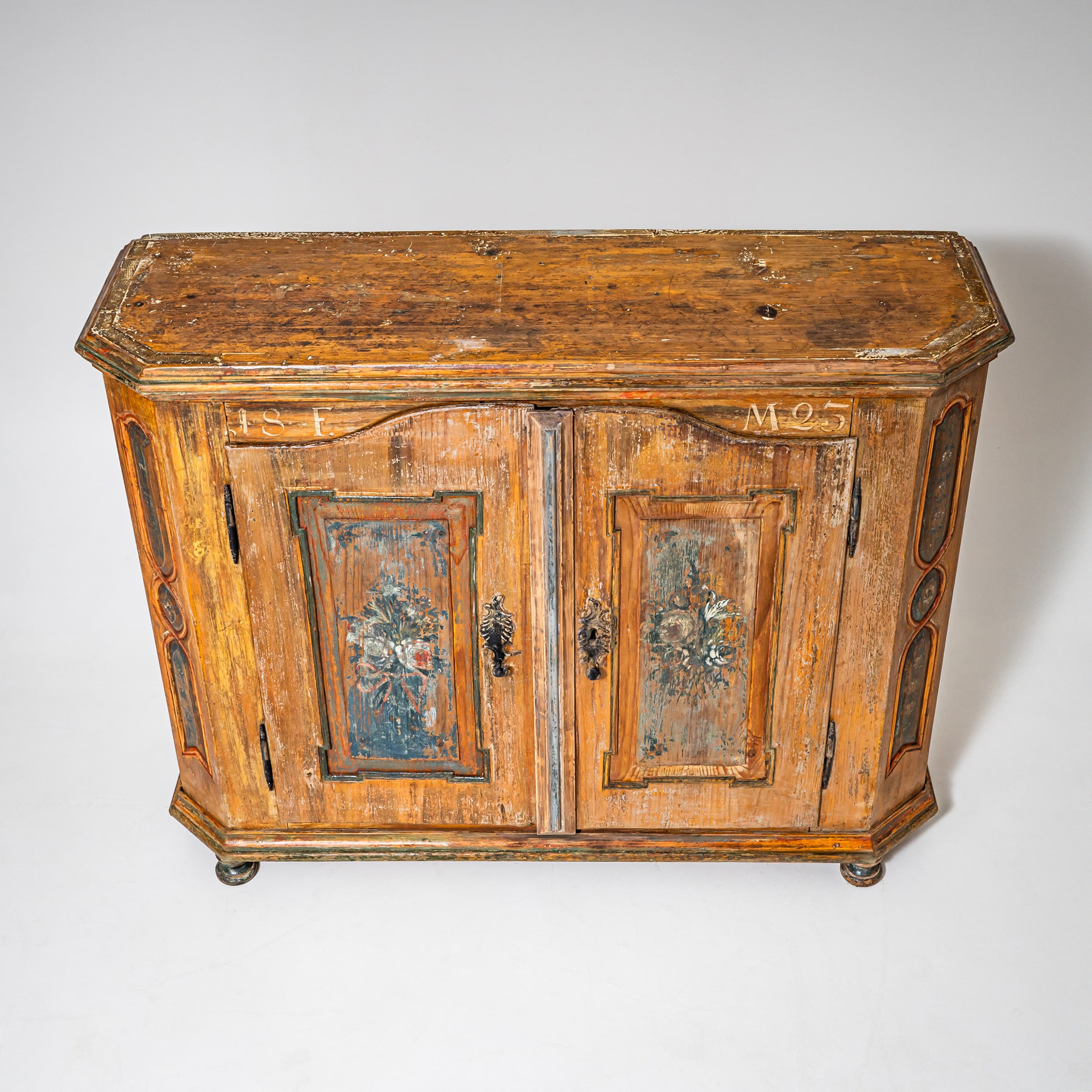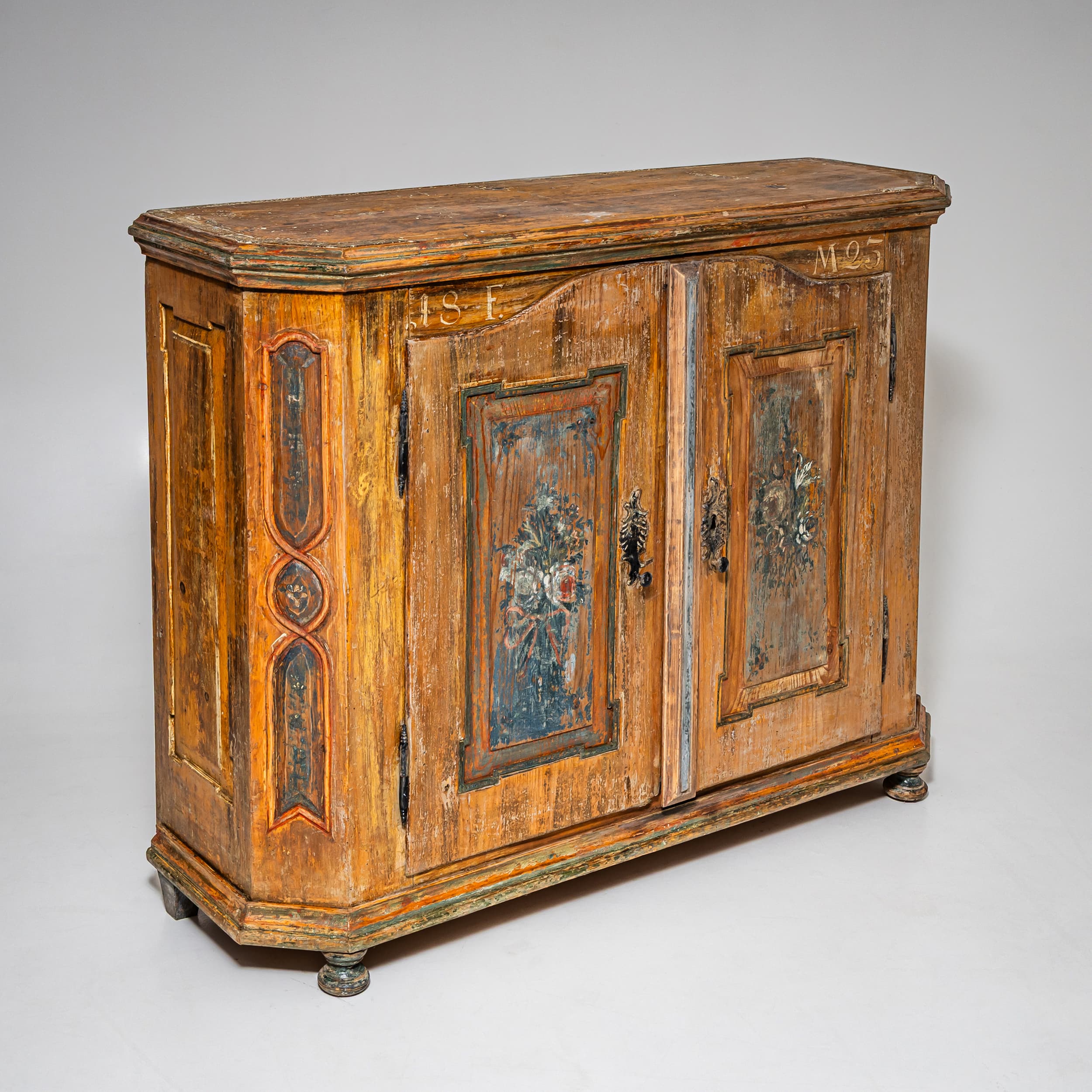 Handbemalter bäuerlicher Halbschrank aus Fichtenholz mit zwei Türen und abgeschrägten Ecken. Die Füllungsfelder der Türen sind mit farbigen Blumenbouquets dekoriert. Über den Türen befinden sich die Datierung „1823“ sowie das Monogramm „F. M.“