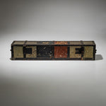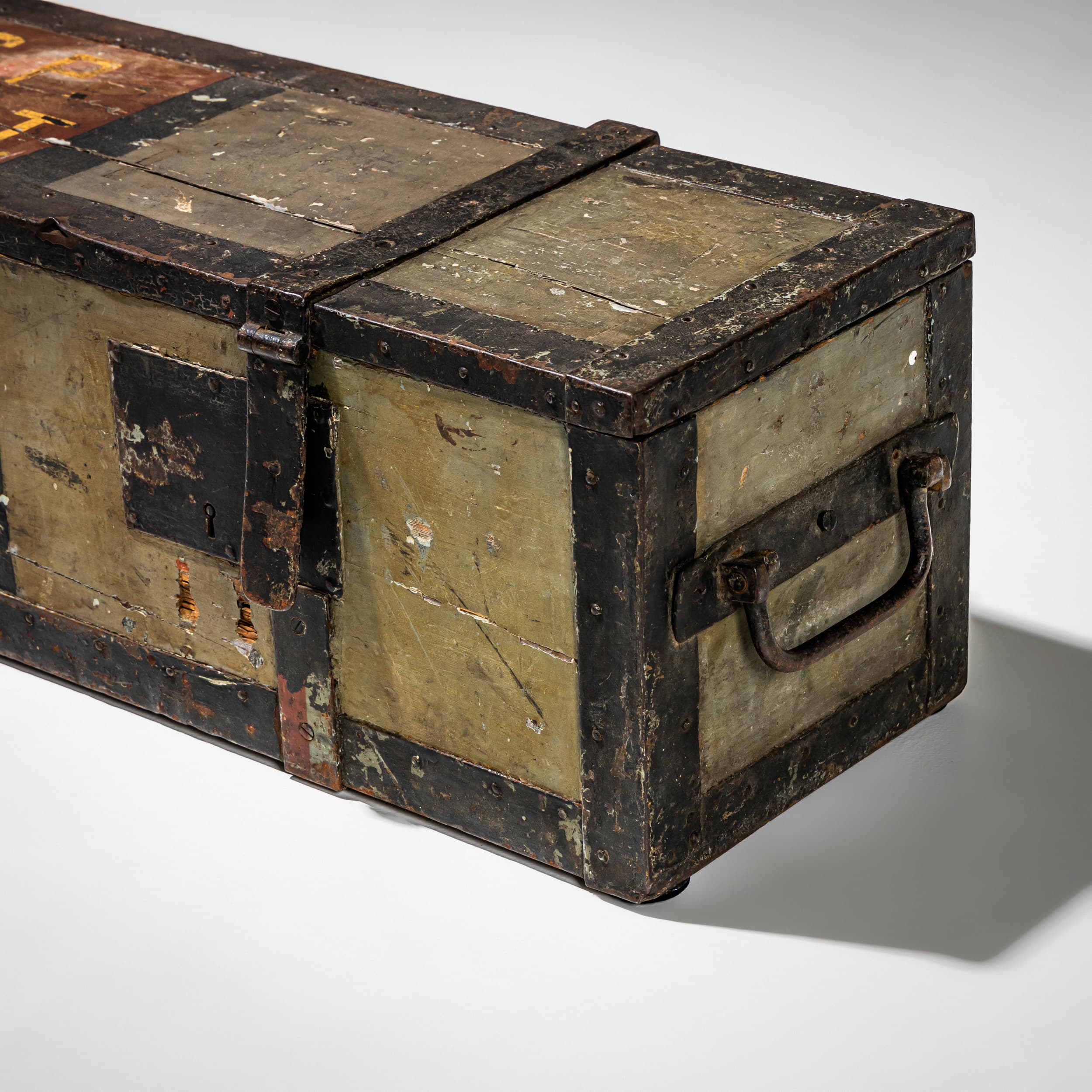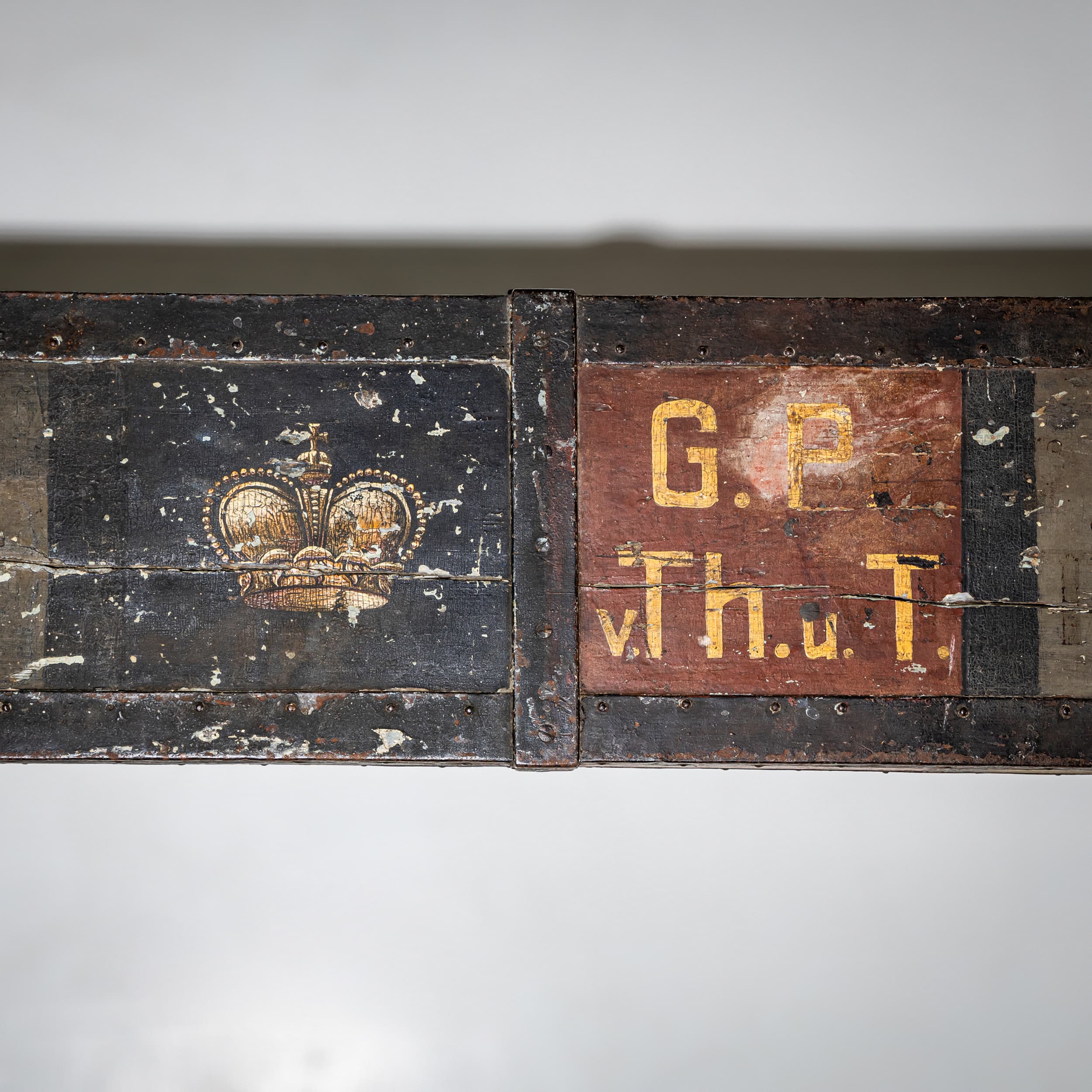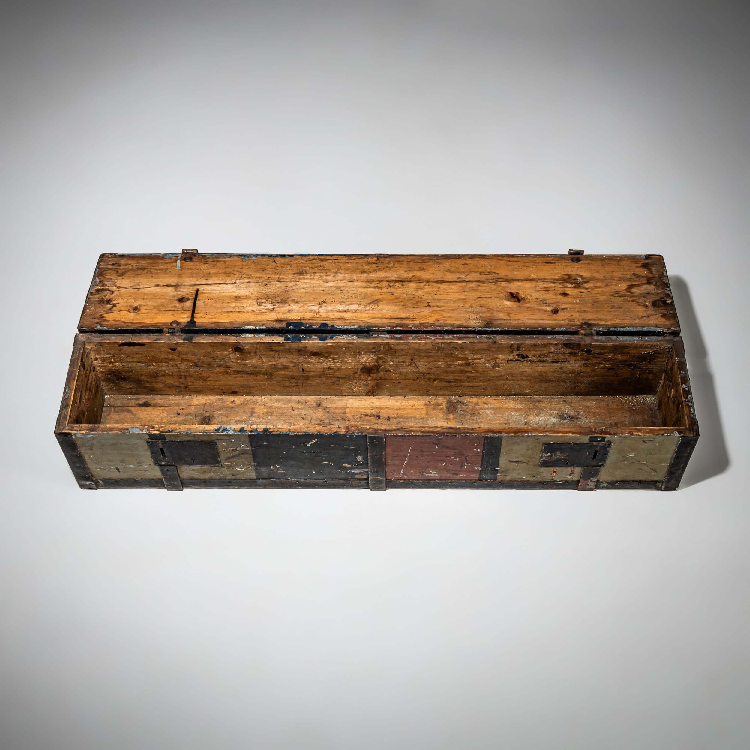 Lange Gewehrtruhe mit Eisenbandbeschlägen und seitlichen Handhaben. Der Deckel ist mit dem Monogramm „G.P.“ sowie „Th. u. T.“ für Thurn & Taxis bezeichnet und von einer Krone begleitet.