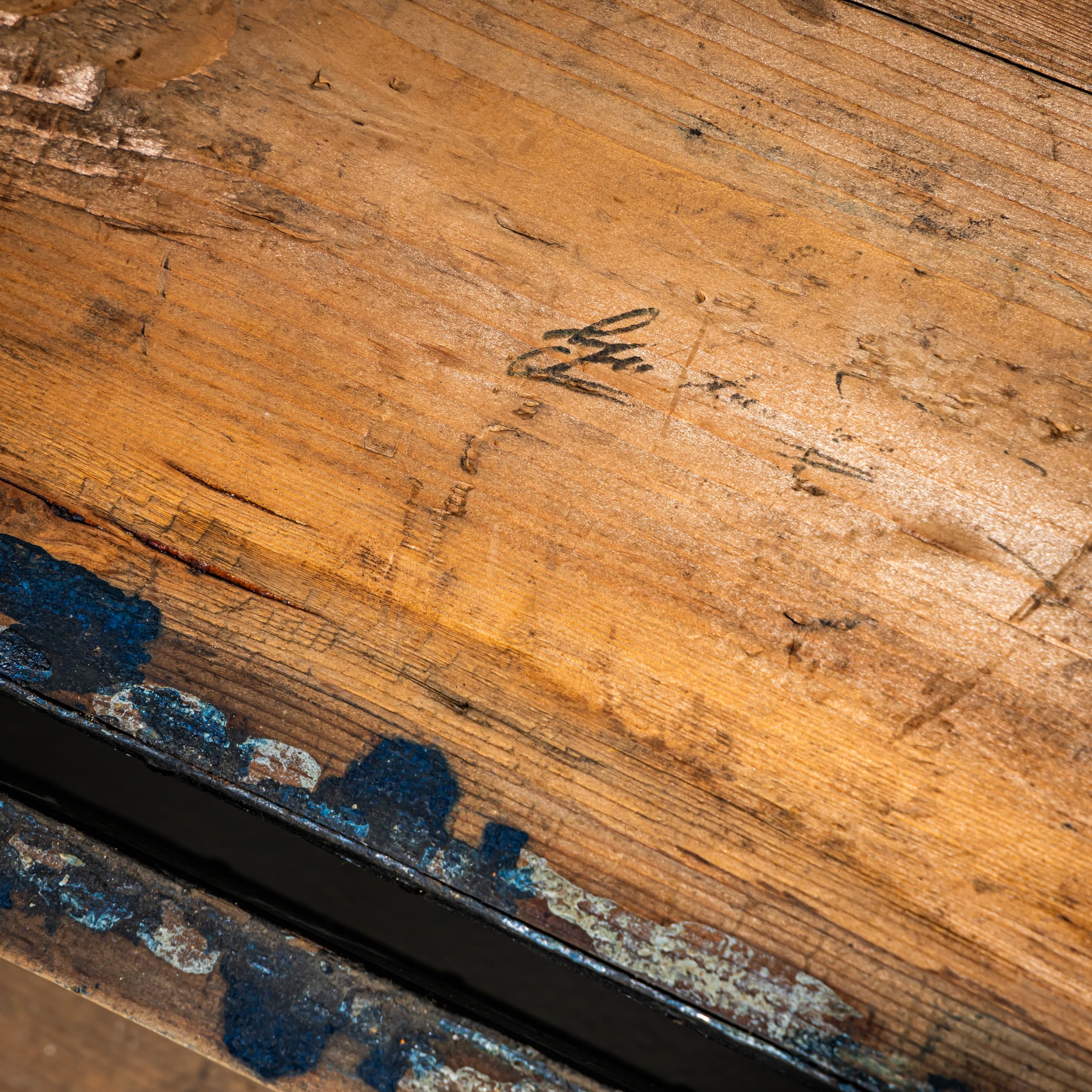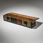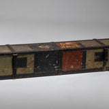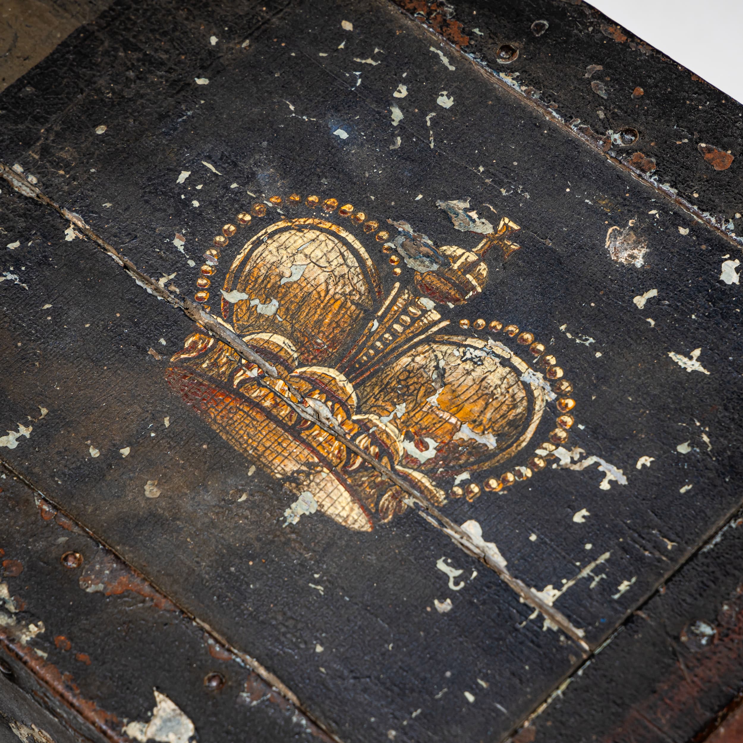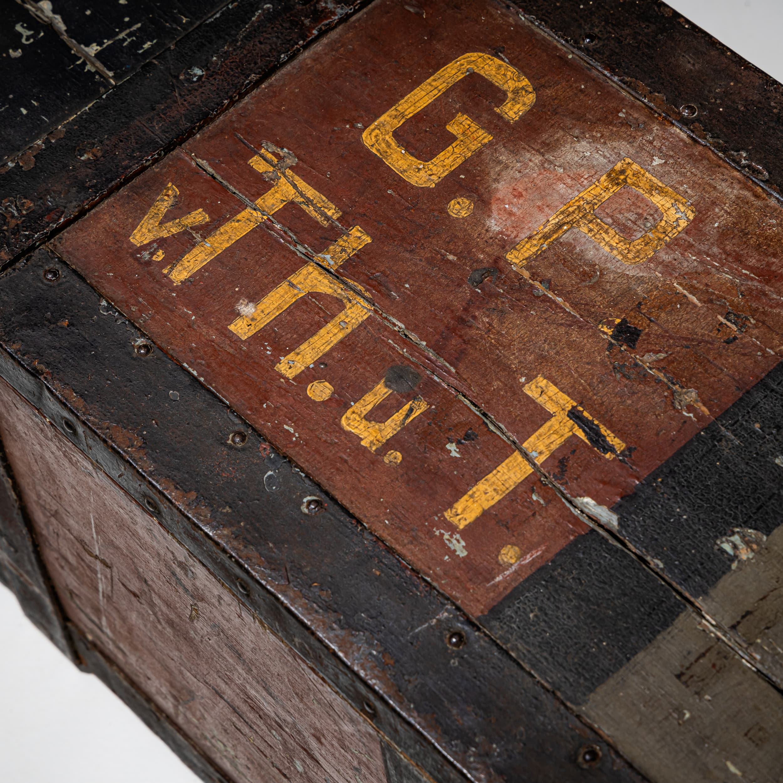 Lange Gewehrtruhe mit Eisenbandbeschlägen und seitlichen Handhaben. Der Deckel ist mit dem Monogramm „G.P.“ sowie „Th. u. T.“ für Thurn & Taxis bezeichnet und von einer Krone begleitet.