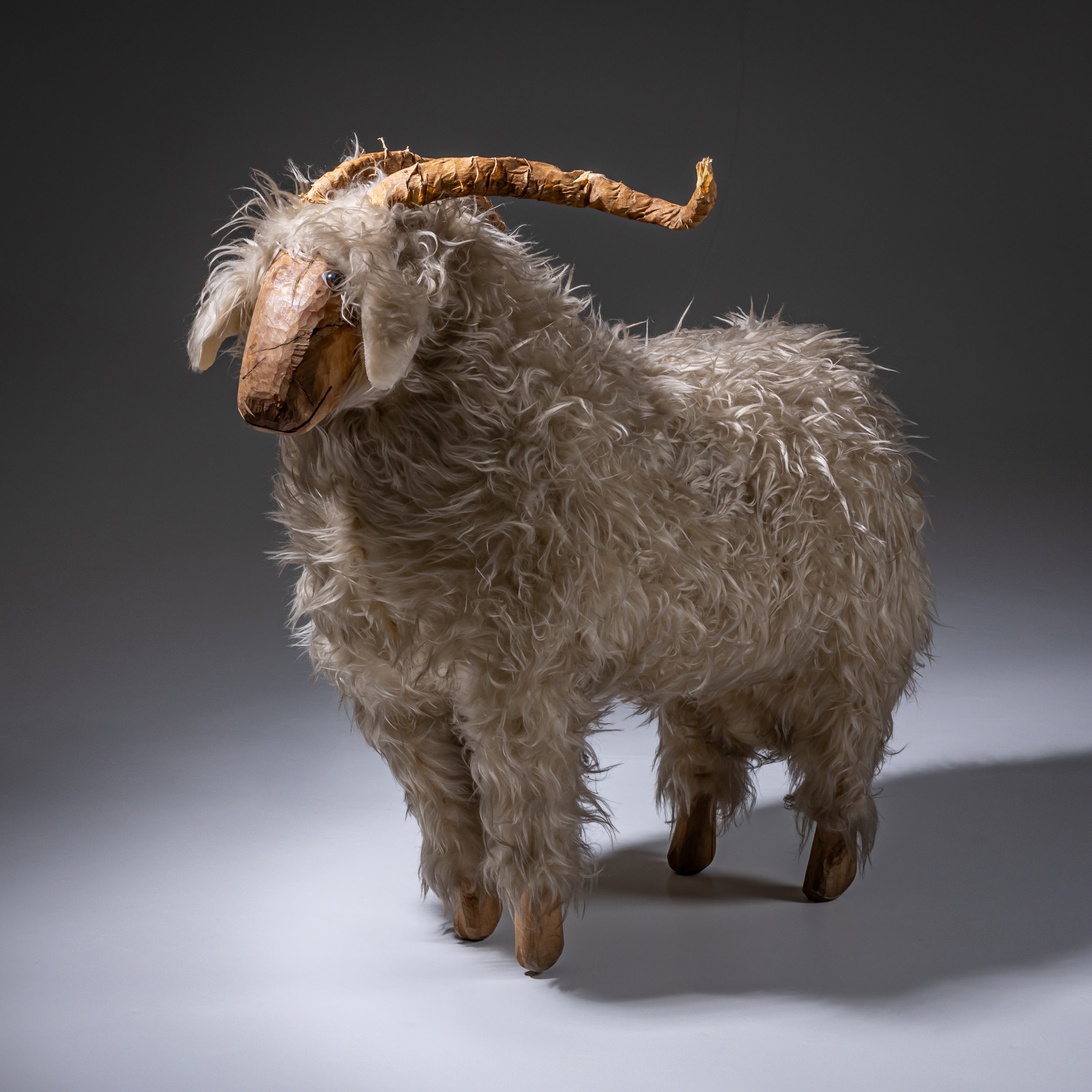Lebensgroße Widder-Skulptur aus geschnitztem Holz mit naturbelassenem Kopf, ausgeprägten Hörnern und eingesetzten Glasaugen, von denen eines fehlt. Der Korpus ist vollständig mit langem, naturfarbenem Schaffell bekleidet, während die Beine in sichtbar belassenen Holzfüßen enden. Das Objekt besitzt einen naiv-volkstümlichen Charakter mit starkem skulpturalem Ausdruck und humorvoll-expressiver Präsenz. Zuschreibung im Stil von Hanns-Peter Krafft.
