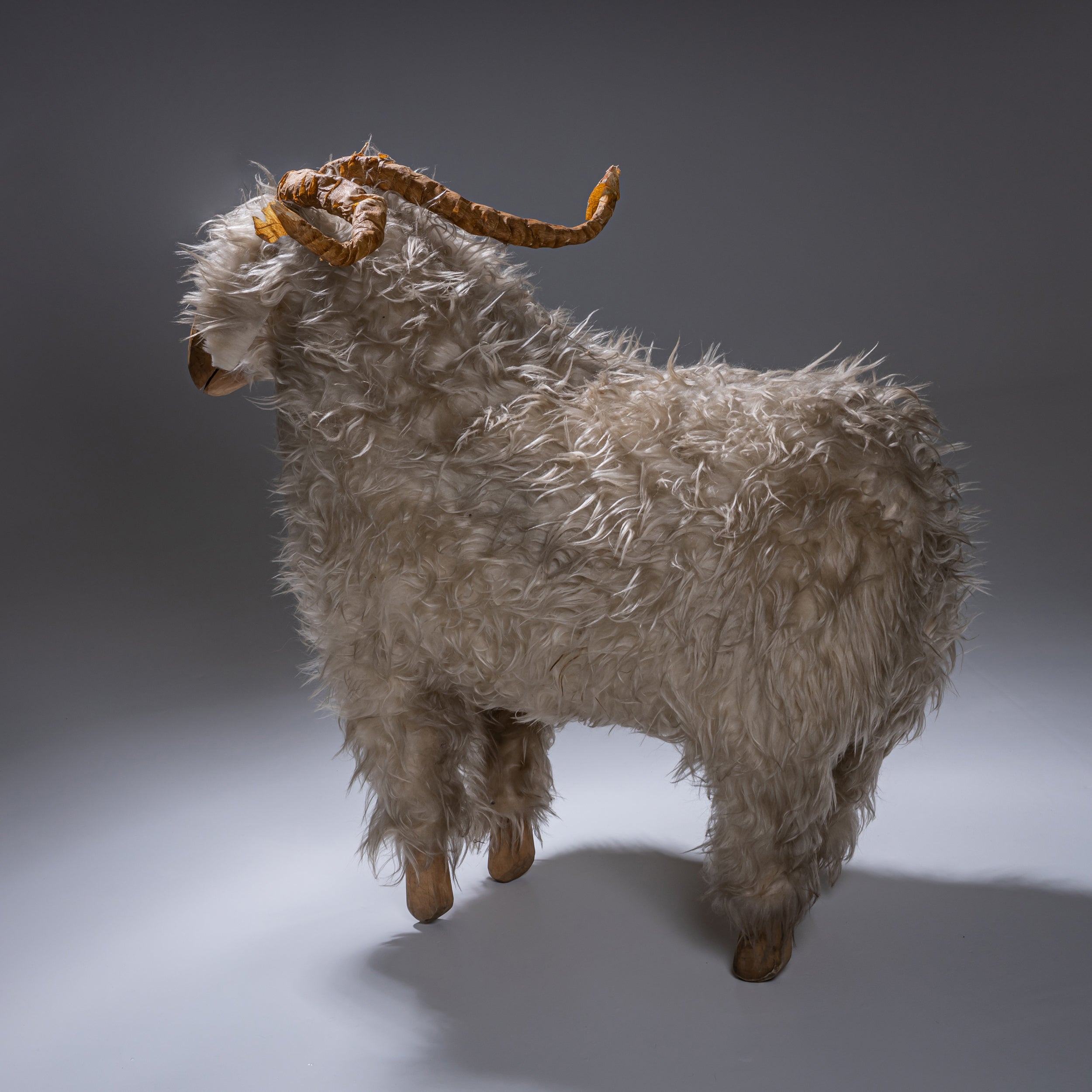 Schafbock mit naturfarbenen Schaffell, im Stil von Hans Peter Krafft, Ende 20. Jahrhundert