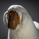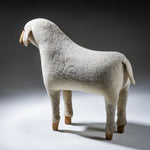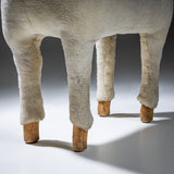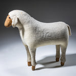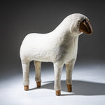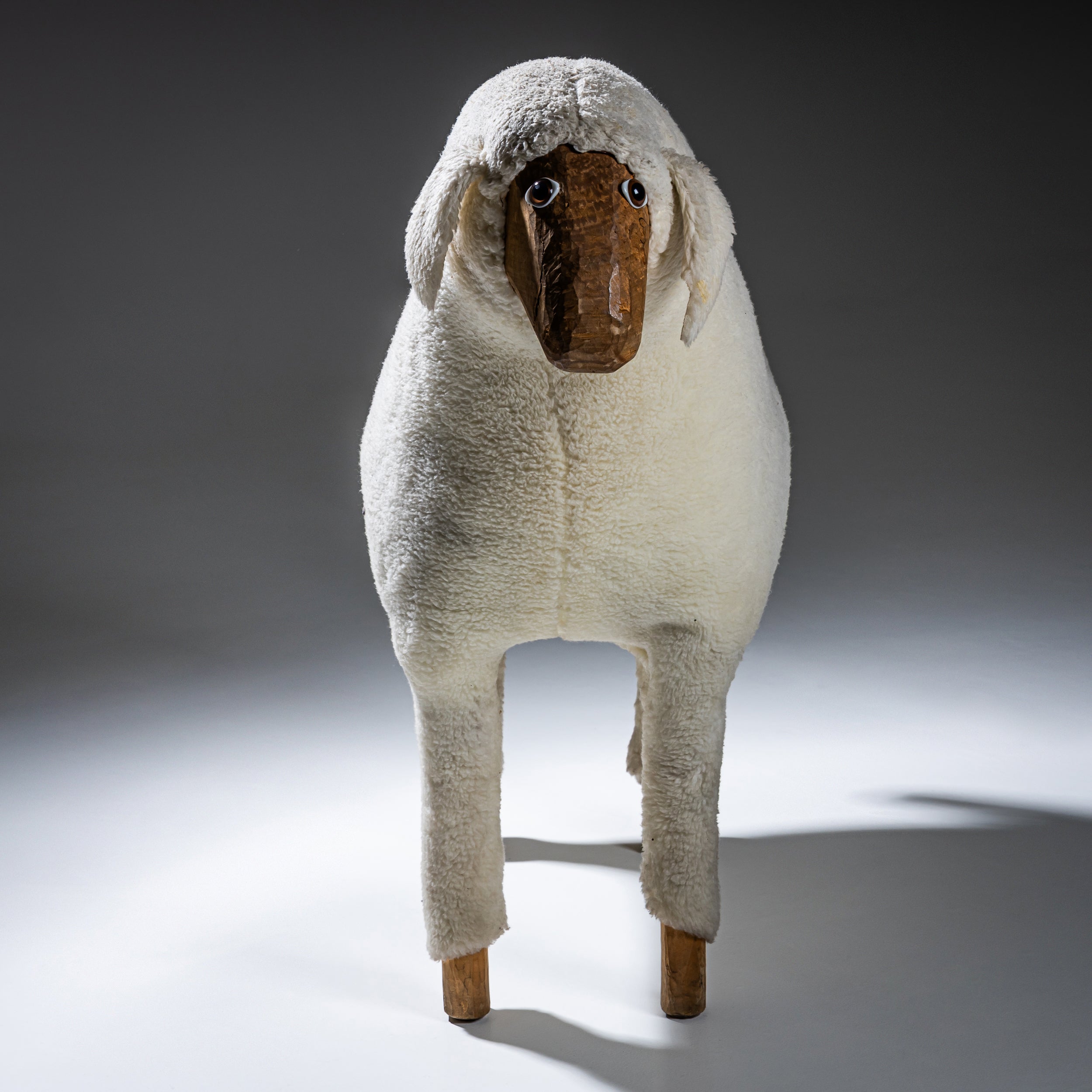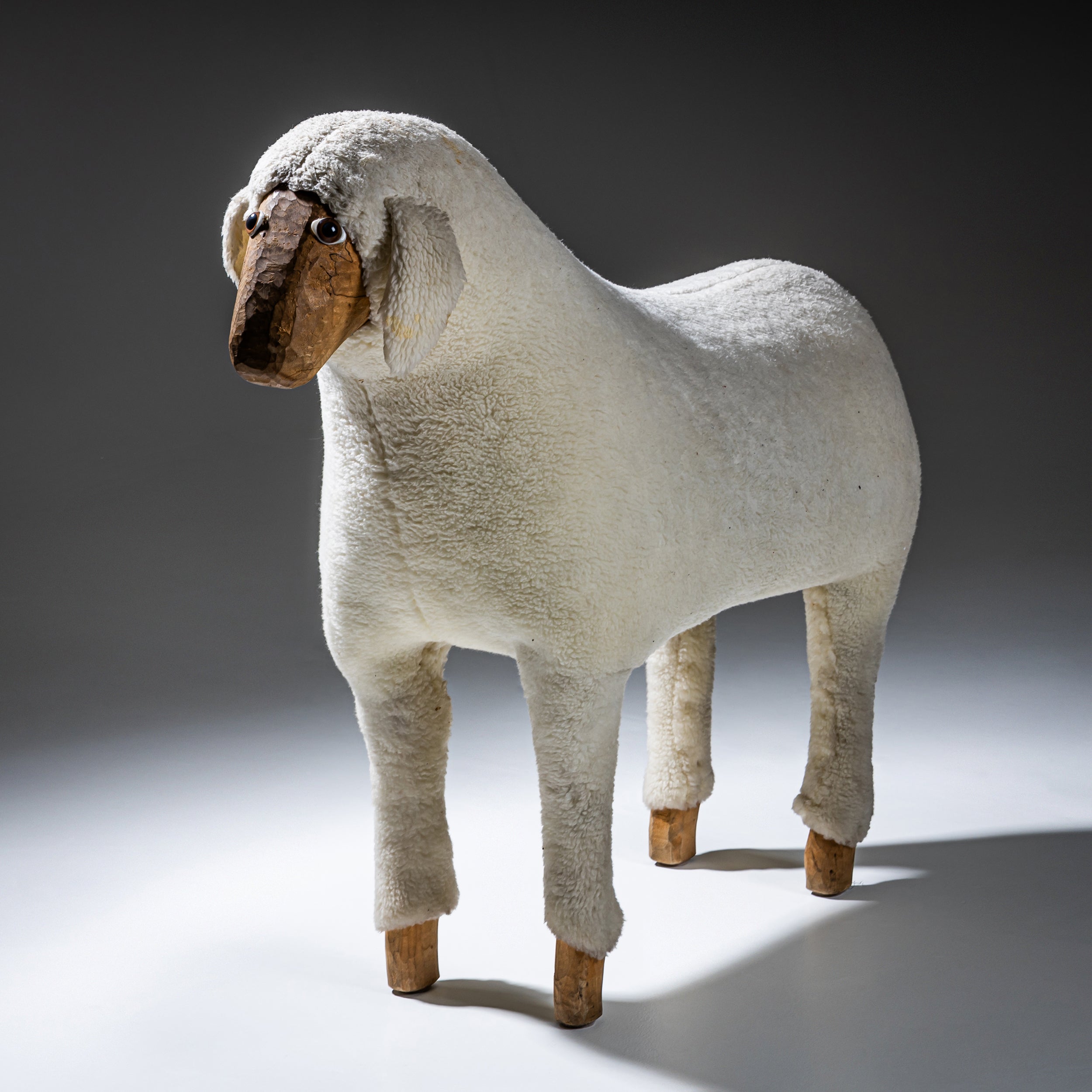 Lebensgroße Schafsskulptur aus geschnitztem Holz mit naturbelassenem Kopf und eingesetzten Glasaugen. Der Korpus ist vollständig mit cremefarbenem Schaffell bekleidet, während die Beine in sichtbar belassenen Holzfüßen enden. Das Objekt besitzt einen naiv-volkstümlichen Charakter mit starkem skulpturalem Ausdruck und humorvoller Präsenz. Zuschreibung im Stil von Hanns-Peter Krafft.