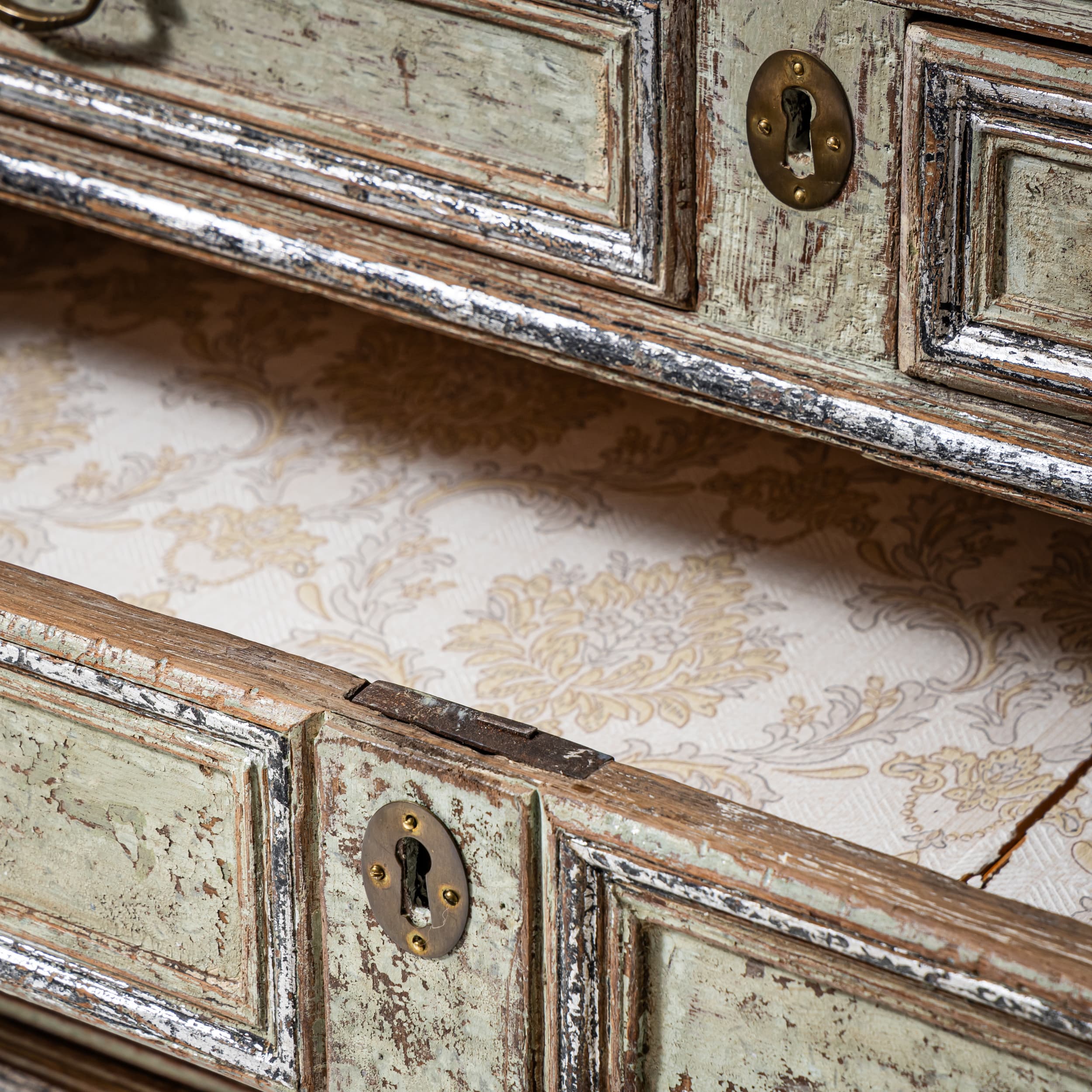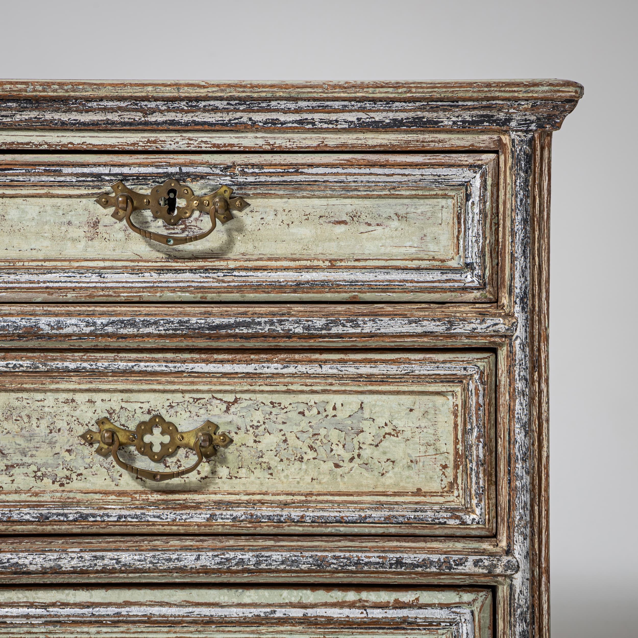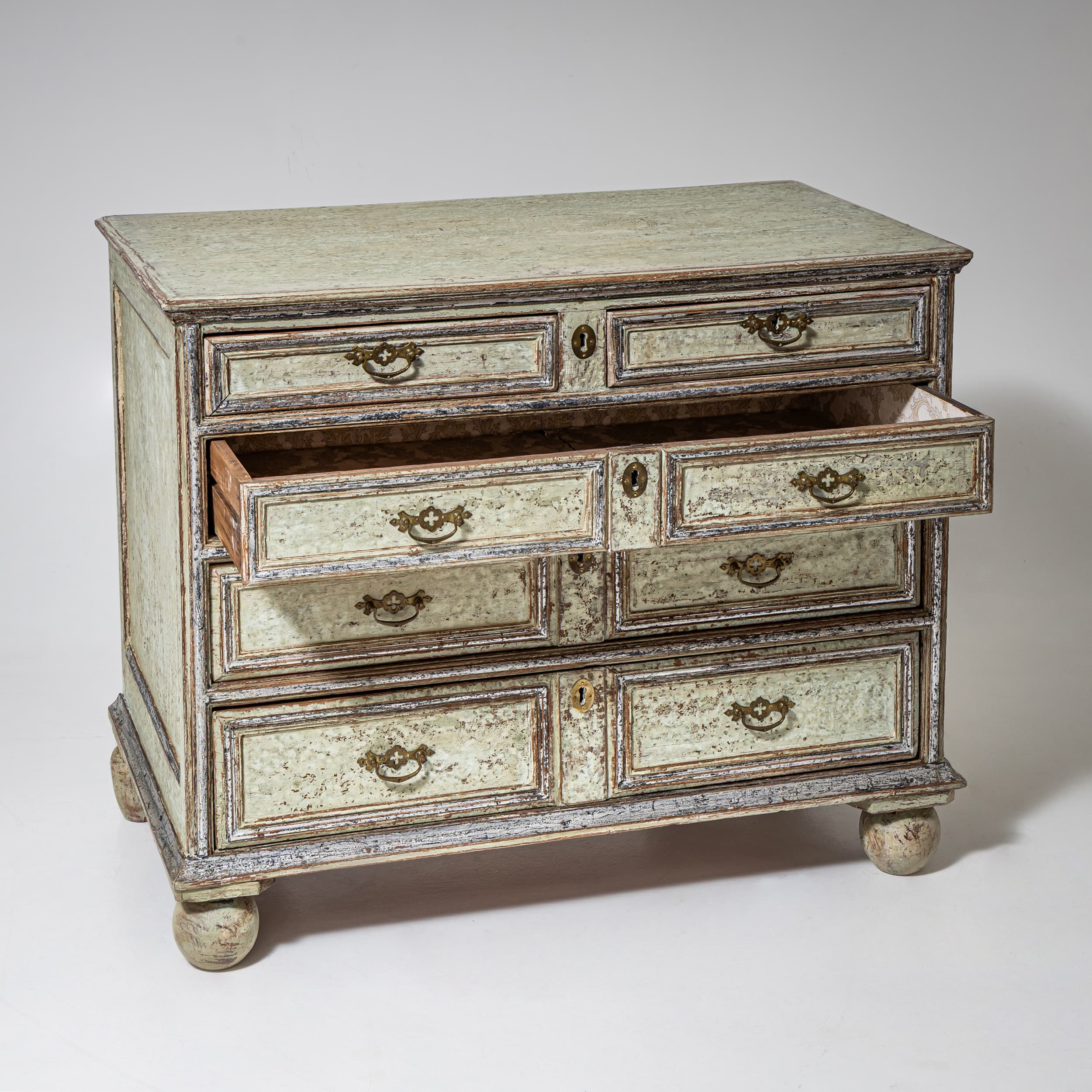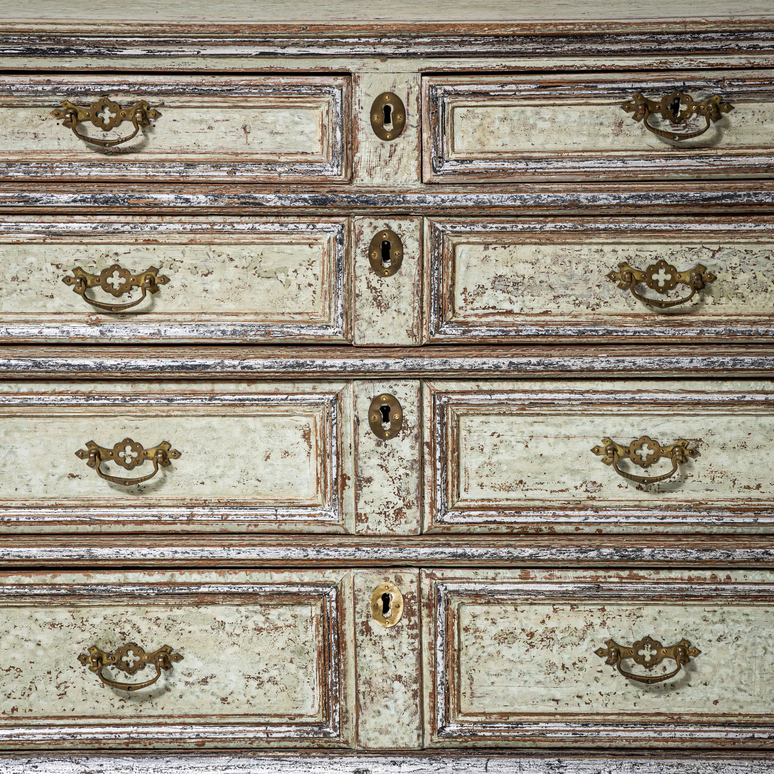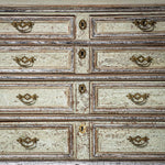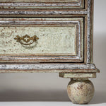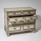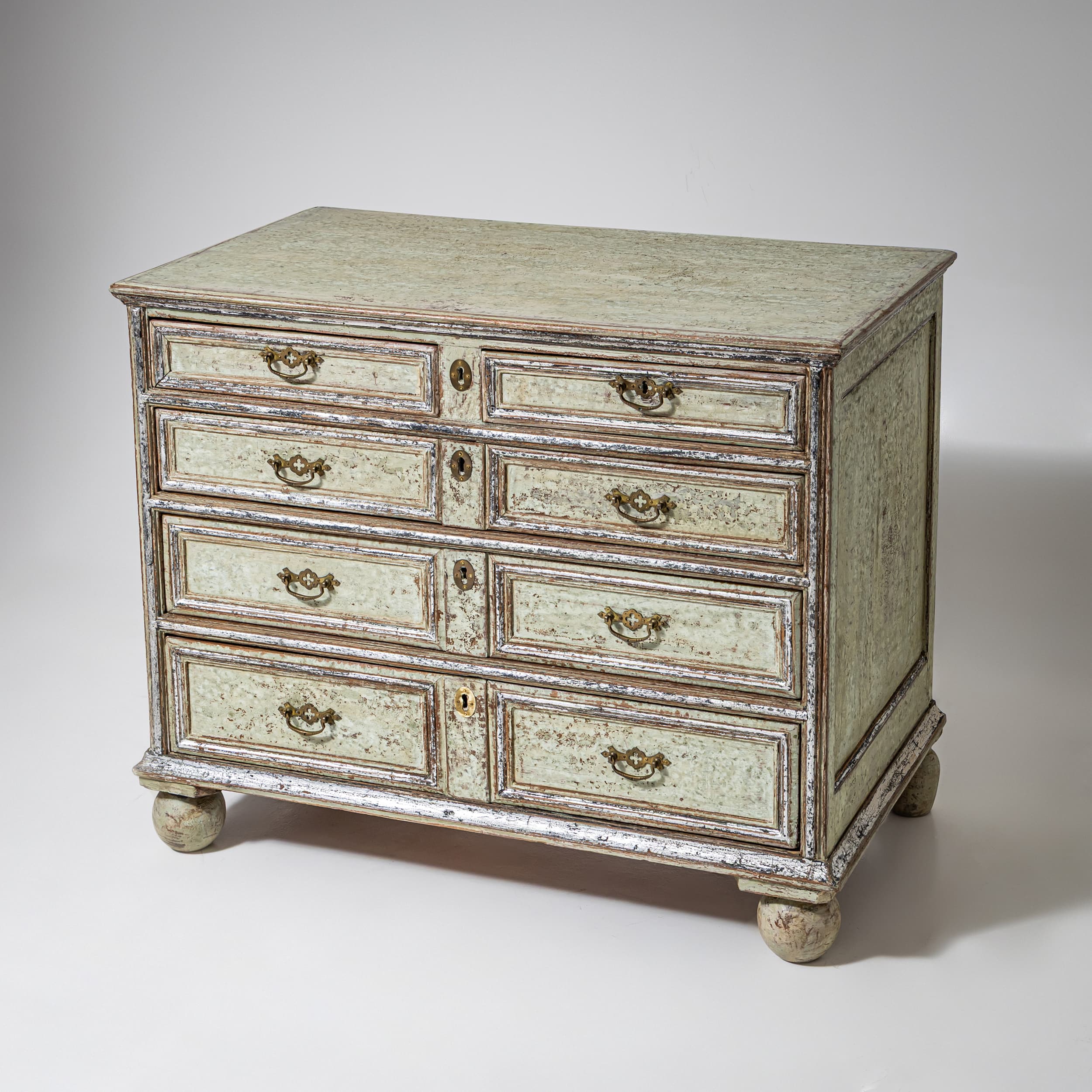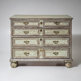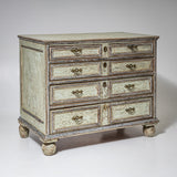 Große Kommode des späten 18. Jahrhunderts mit vier Schubladen und klar gegliedertem, rechteckigem Korpus. Die Schubladenfronten sowie der Korpus sind mit profilierten Rahmen versehen. Die Kommode steht auf Kugelfüßen. Die Oberfläche ist hellgrün gefasst und mit stellenweise versilbert. Die Farbfassung wurde neu nach historischen Vorbildern ausgeführt und anschließend sorgfältig patiniert, wodurch eine historisch wirkende Oberfläche entstanden ist.