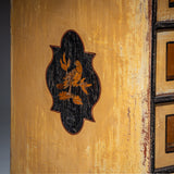 Italienische Barockkommode mit vier Schubladen und facettierter Front. Die bewegten Beschläge sind aus Messing gefertigt. Die Front ist in Ockergelb gefasst, während Korpusoberfläche und Sockel in Braun gehalten sind. Die Schubladenfronten zeigen außen Tiersilhouetten in abgerundeten Kartuschen sowie mittig platzierte weibliche Figuren im antikisierenden Stil.