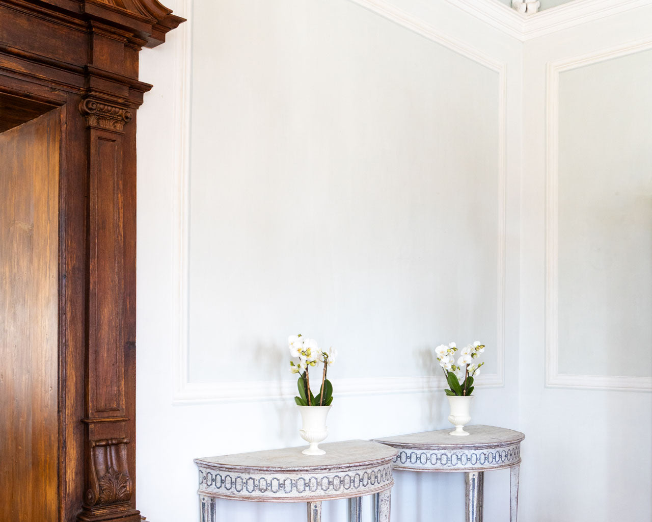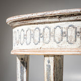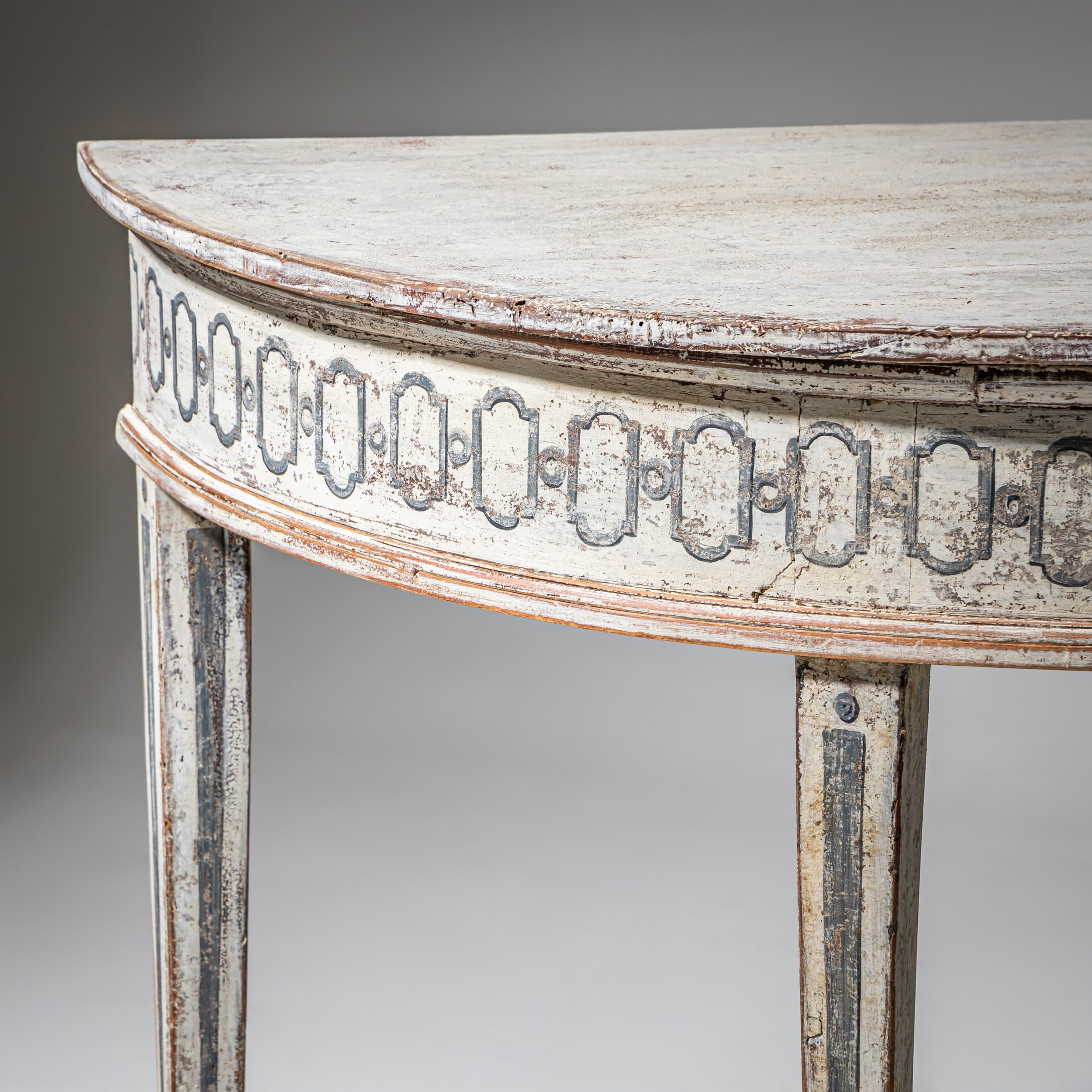 The painted finish has been newly applied: a light blue ground with darker blue decoration inspired by historical models, subsequently enhanced with an antiqued patina.