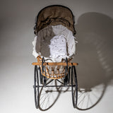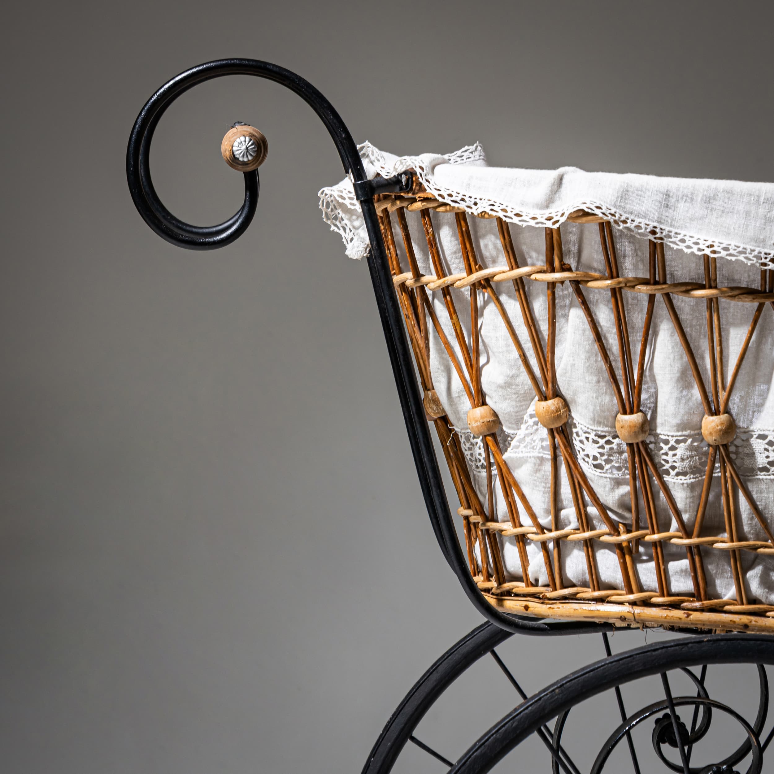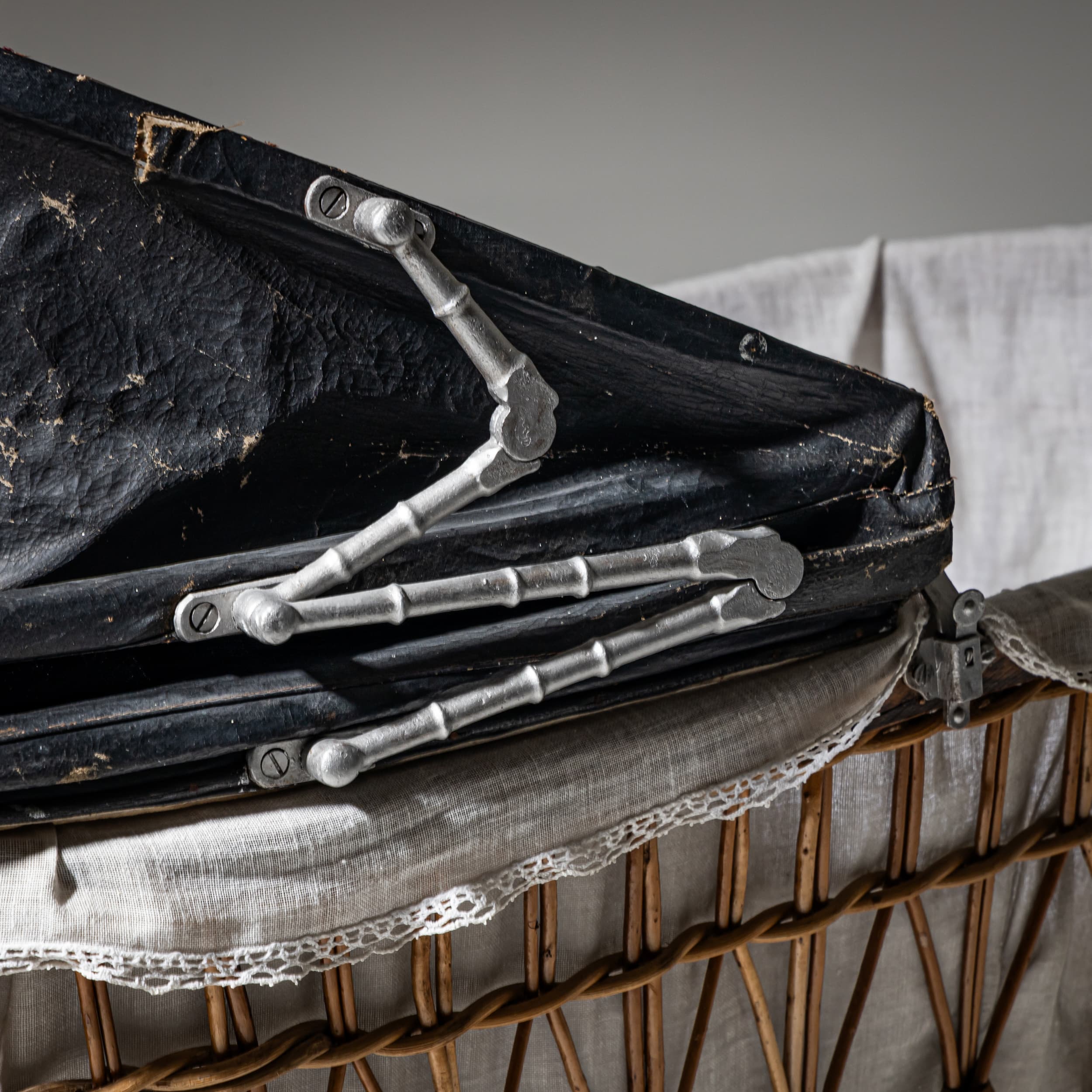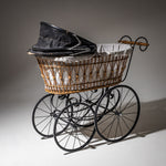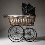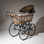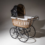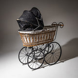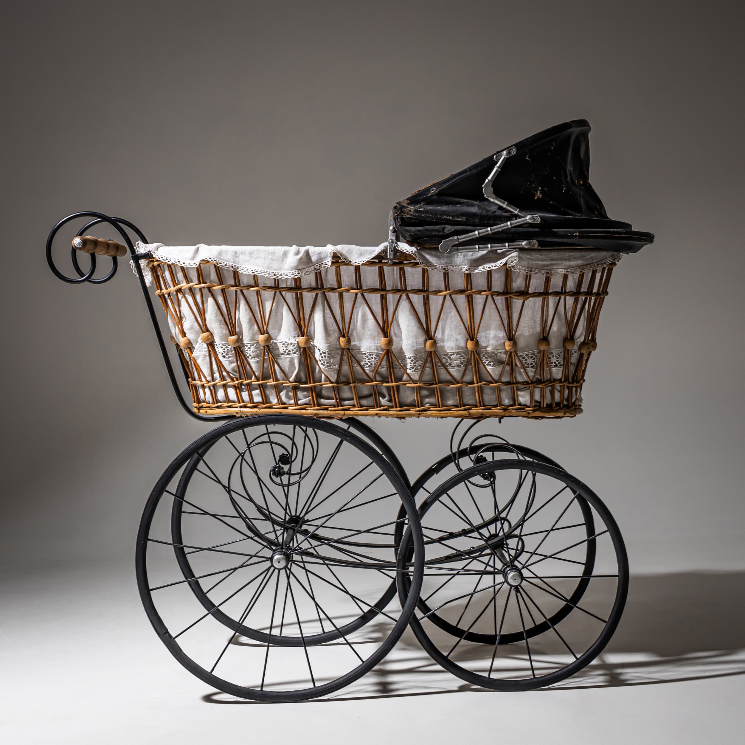 Historischer Kinderwagen mit ovalem, kunstvoll geflochtenem Weidenkorb und faltbarem Sonnenschutz aus schwarzem Tuch. Der Wagen ruht auf einem stabilen Eisengestell mit großen Speichenrädern. Der Korb ist mit einem Leinentuch ausgelegt. Ein charmantes Beispiel frühindustrieller Kinder- und Alltagskultur um 1900.