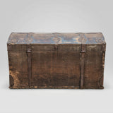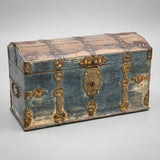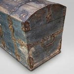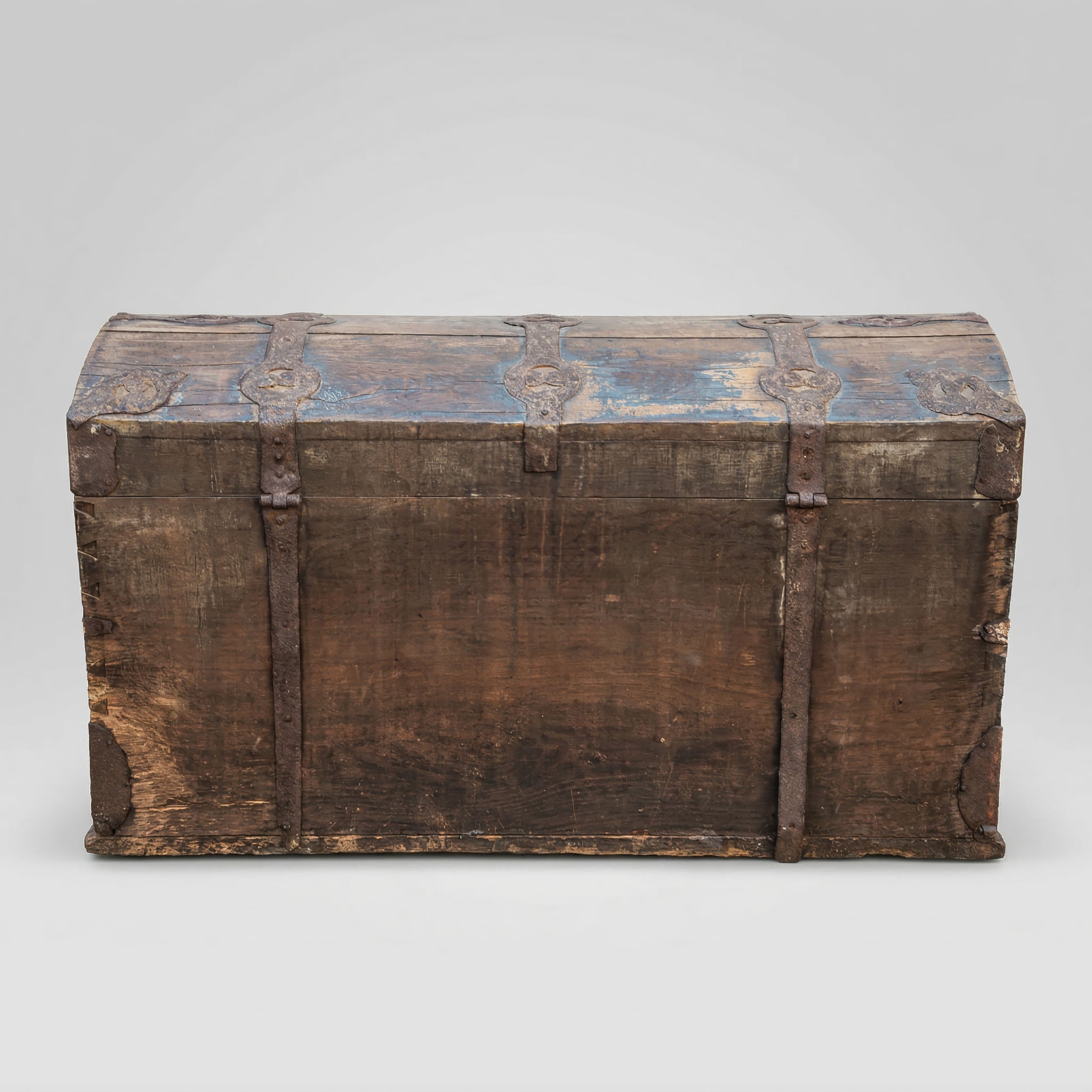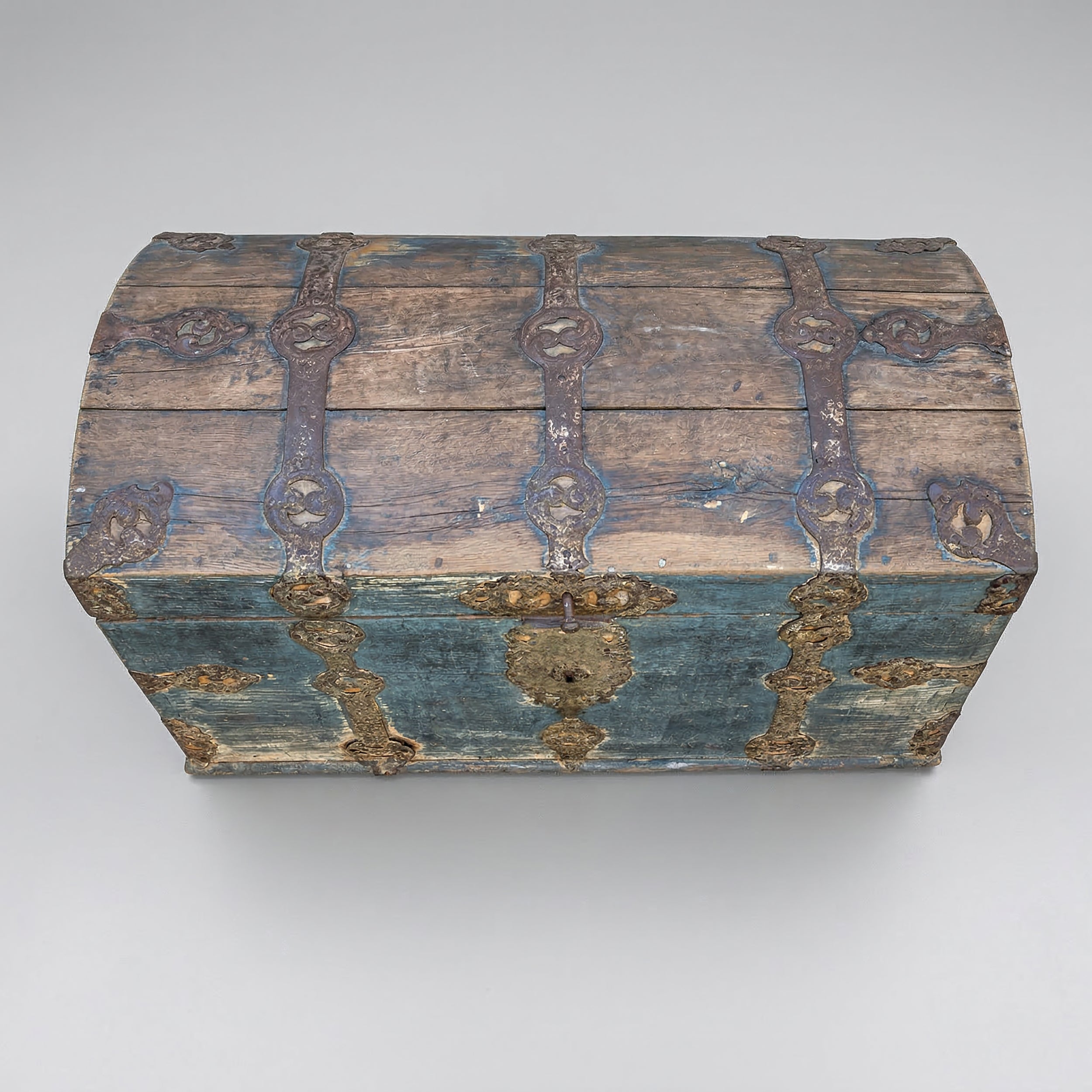 Large round lid chest with iron bands and existing key. The frame is blue patina.