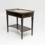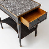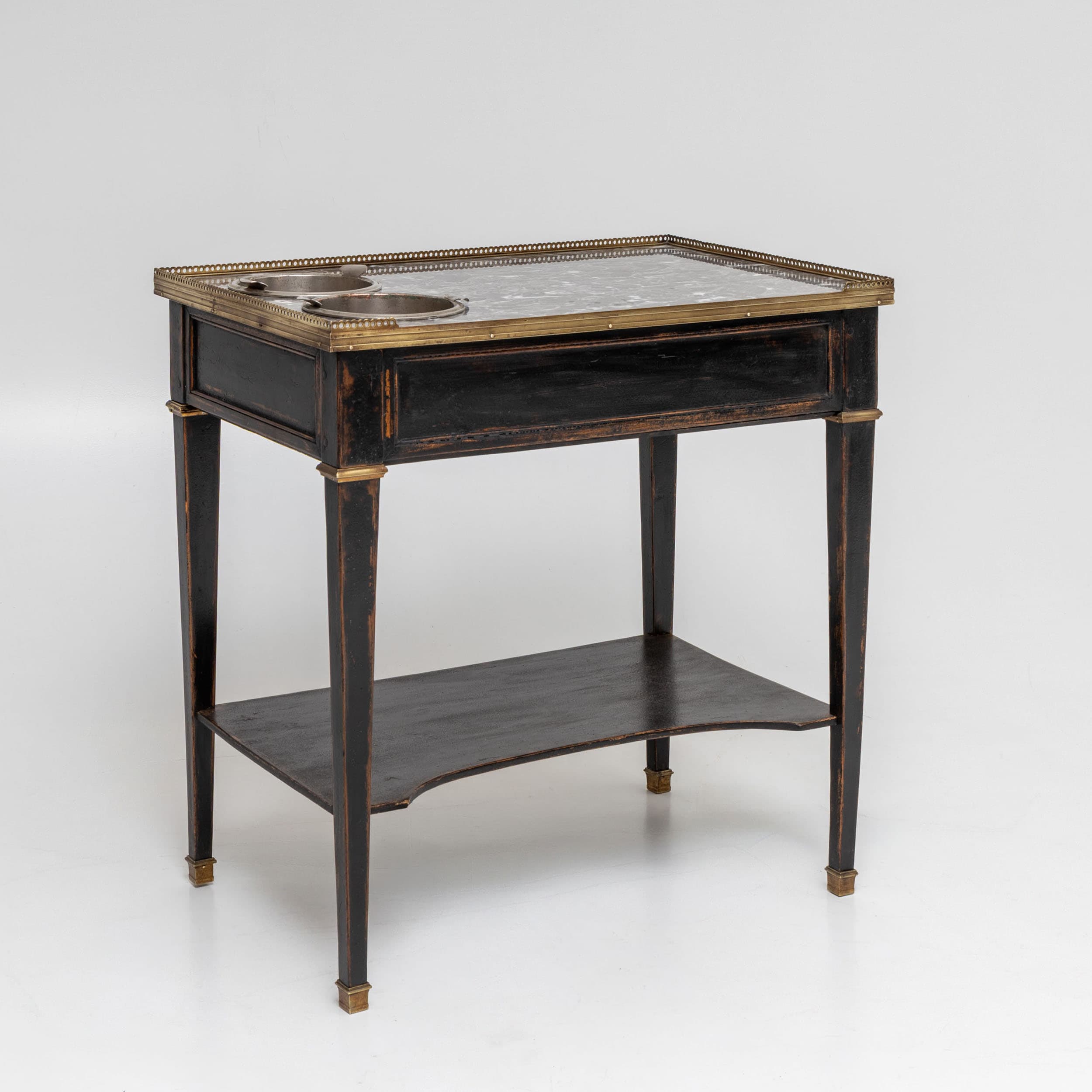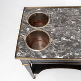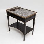 Schlanker Beistelltisch mit rechteckiger Form und einer Marmorplatte mit Galerie. Die Platte besitzt zwei runde Ausschnitte für Sekt- oder Flaschenkühler. Das Gestell ist dunkel gefasst und steht auf vier geraden Beinen mit Messingfüßen. Eine kleine Schublade sowie eine geschweifte Ablageplatte im unteren Bereich ergänzen das Möbel.