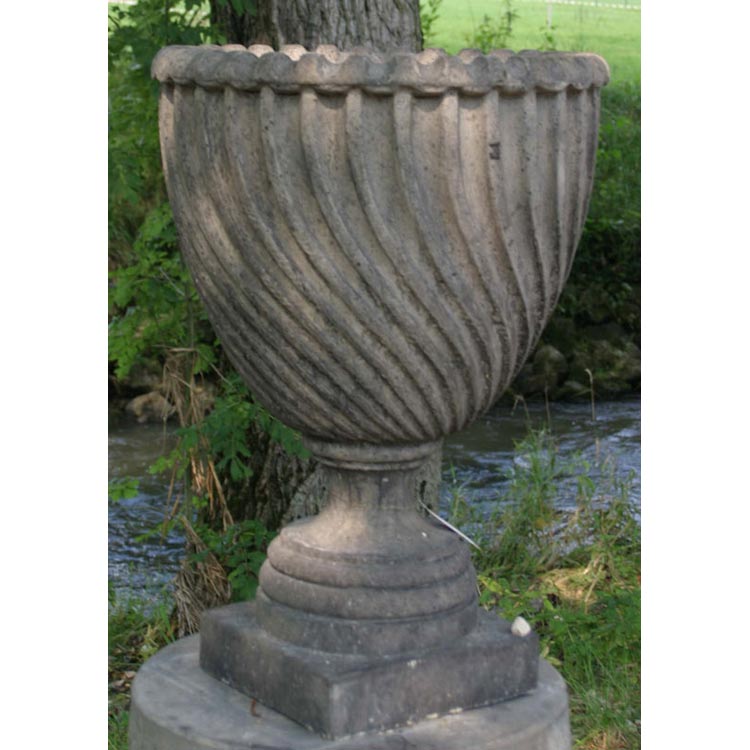 Diese elegante Gartenvase zeichnet sich durch ein gedrehtes, geriffeltes Design und eine anmutig geschwungene Form aus. Der abgerundete Sockel sorgt für Stabilität und macht sie zu einem dekorativen Highlight in jeder Gartenlandschaft.