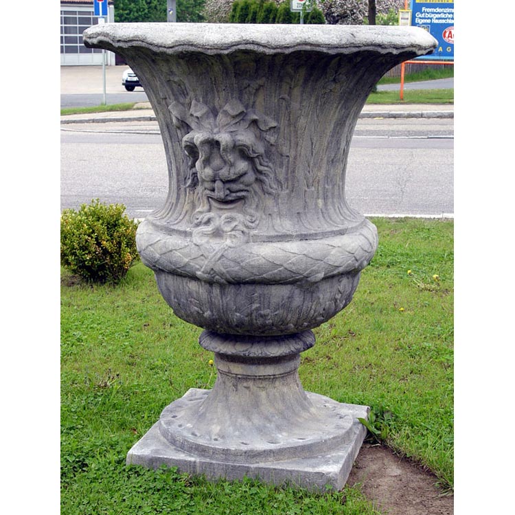 Diese monumentale Garten- oder Parkvase besticht durch ihre beeindruckenden Ausmaße und ihre detaillierte Verarbeitung. Der gedrehte Sockel mündet in einen voluminösen Körper, der mit einem modellierten Maskaron - einem stilisierten Gesicht - verziert ist und dem Stück einen markanten, klassischen Charakter verleiht. Die breite, ausgestellte Lippe verleiht ihm zusätzliche Eleganz. Dieses außergewöhnliche Stück aus Stein mit natürlicher Patina eignet sich hervorragend als zentrales Element in weitläufigen Außenbereichen.