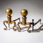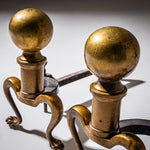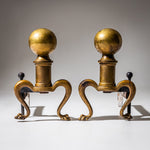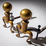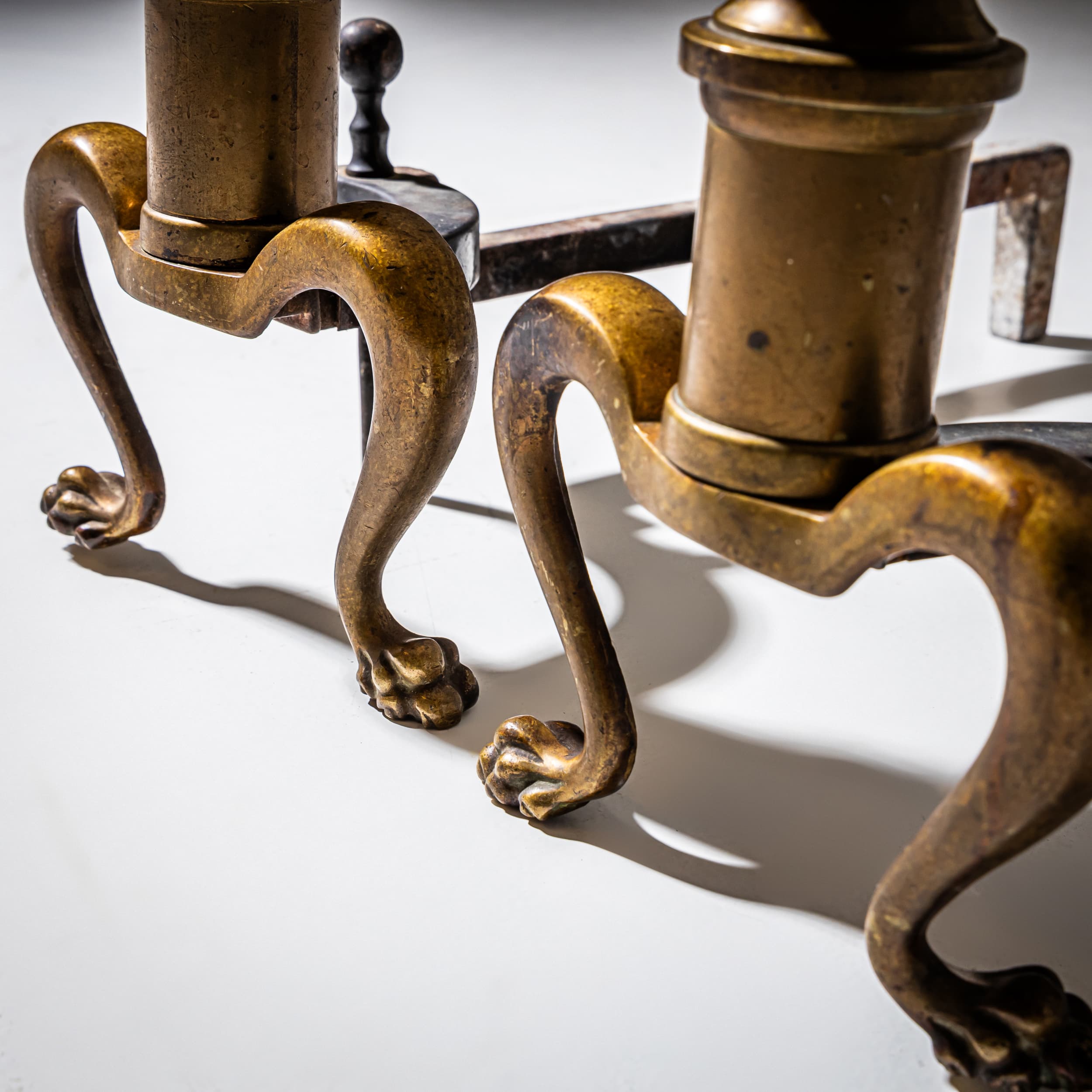 A decorative fireplace set comprising two andirons with a grate (35 × 29 × 17 cm) and a four-piece set of fireplace tools. The tools include tongs (70 × 10 × 3 cm), a shovel (70 × 14 × 8 cm), a poker, and a roasting spit (each 70 × 3 cm). The handles are ornamented with intricate rocaille motifs, reflecting the ornate style of the late 19th century.