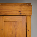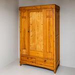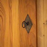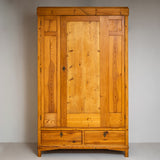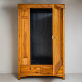 Single-door softwood wardrobe with two drawers and a clean, linear body. The diamond-shaped brass escutcheons add a decorative touch. The interior is painted black and suitable for use as a wardrobe.