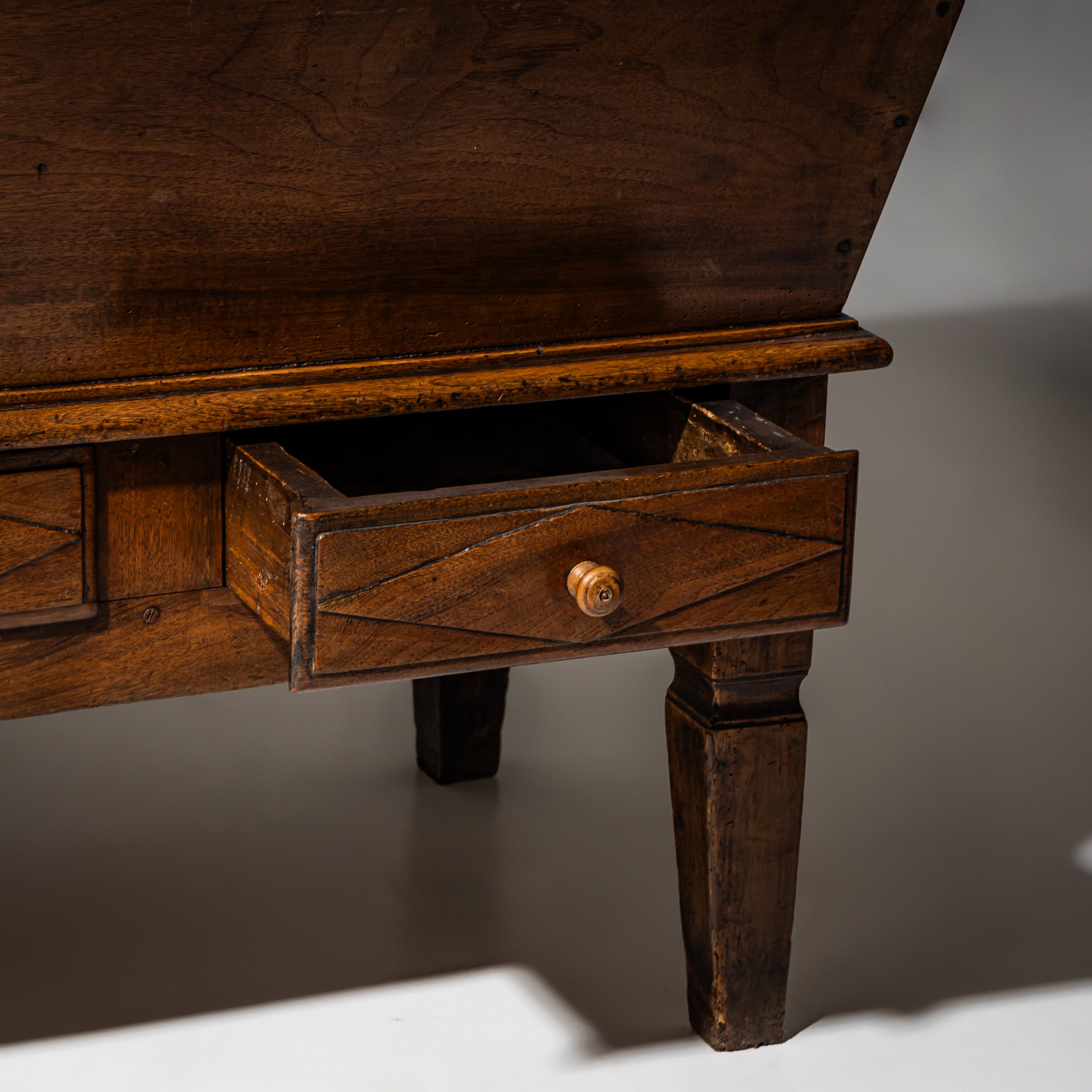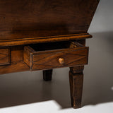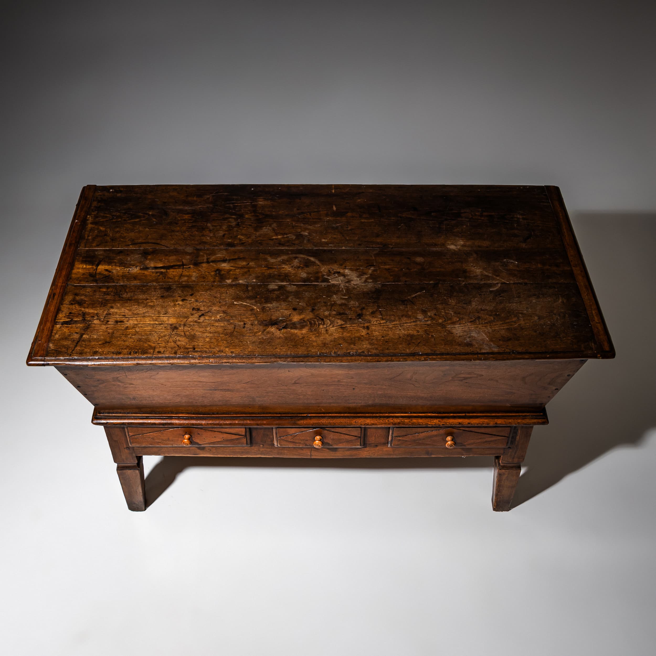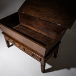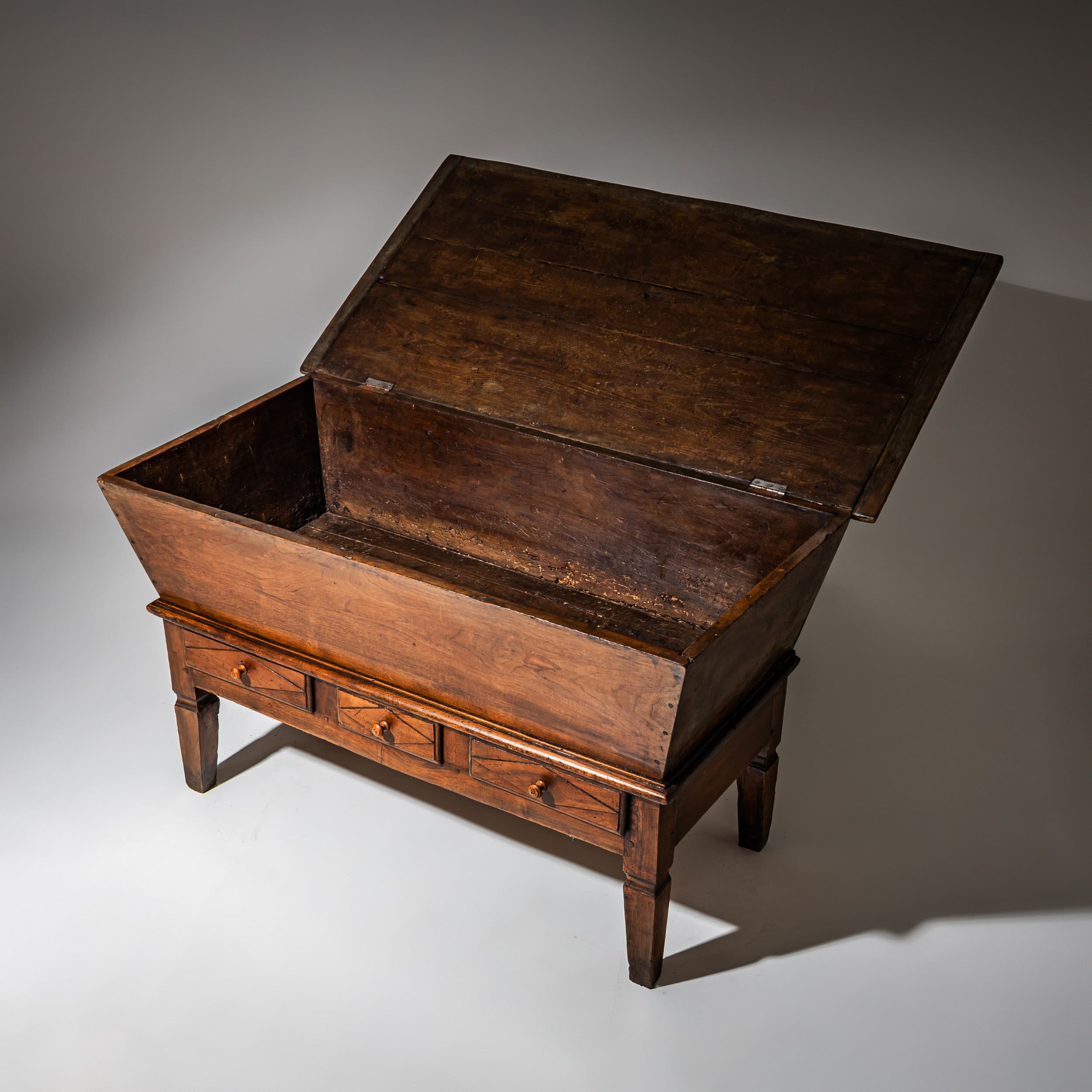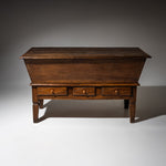Large baker’s dough chest crafted from solid walnut, featuring a trapezoidal storage compartment concealed beneath a hinged tabletop. The lower section includes three drawers for added storage. Raised on tapered square legs, the piece retains a beautifully authentic, naturally aged patina.