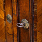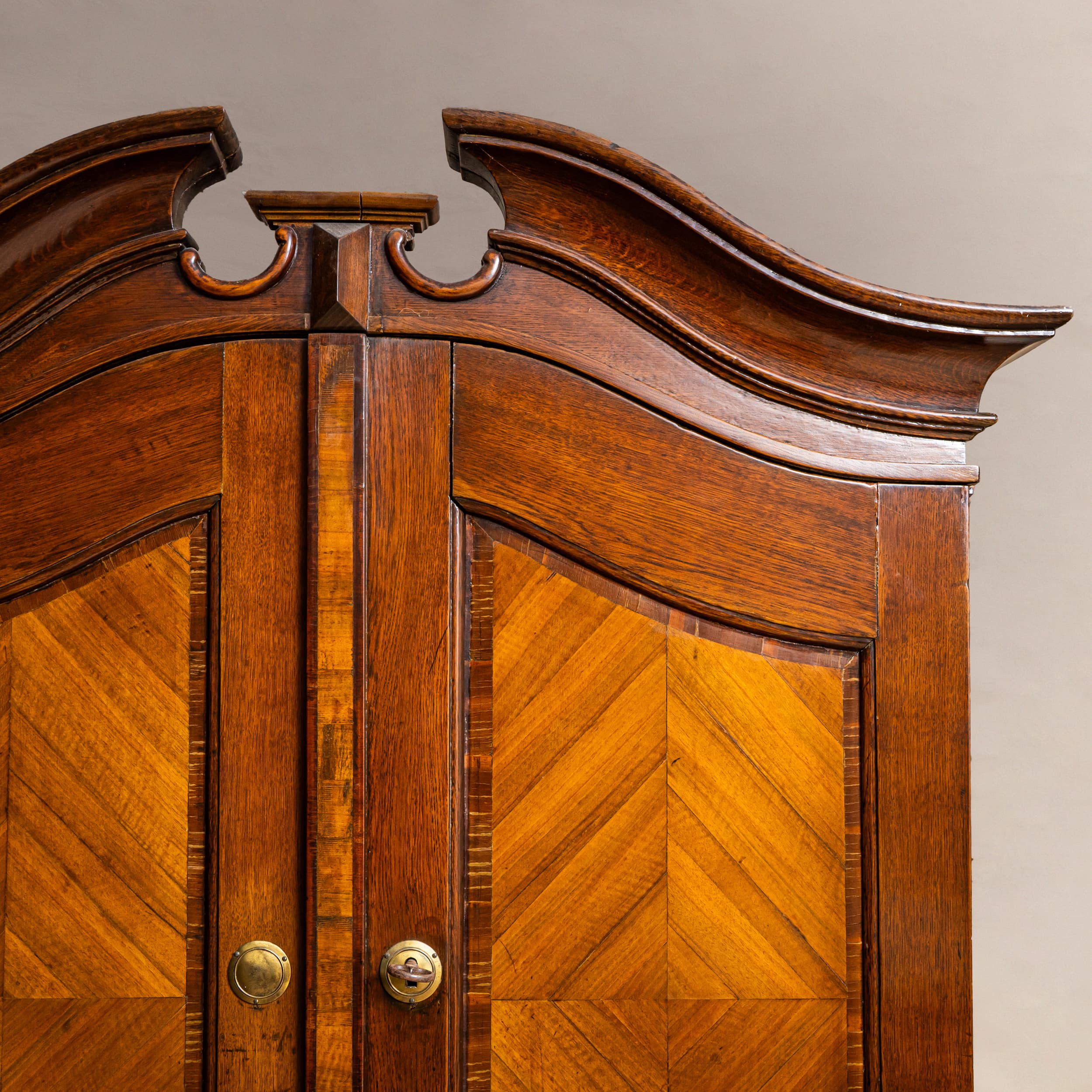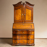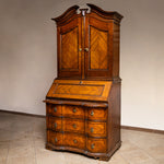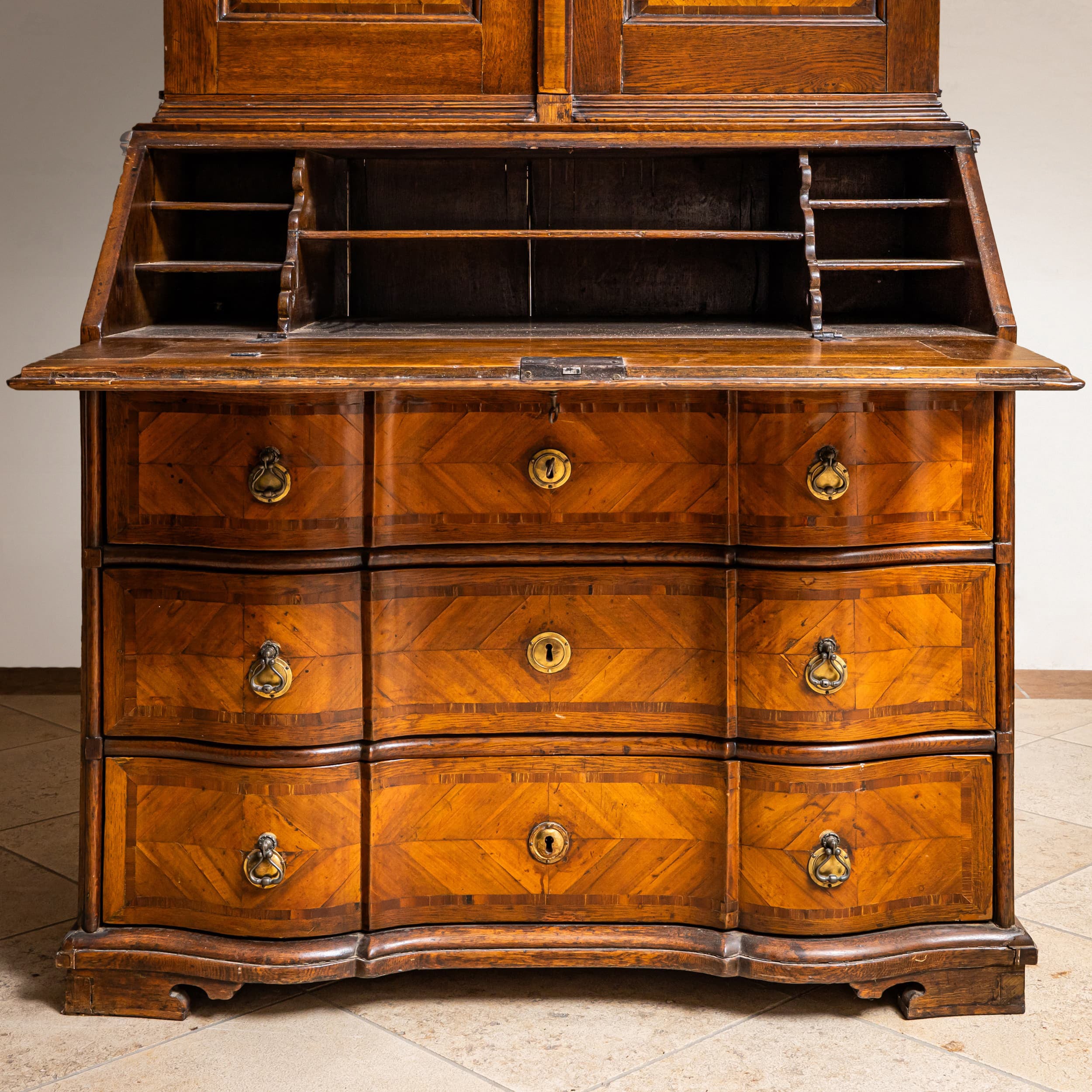 Baroque slant-front secretary desk crafted from oak and cherry, featuring a three-drawer lower chest with a serpentine front and shaped apron feet. Above is a fall-front writing section with compartmented interior. The upper section is completed by a two-door cabinet with a broken pediment. The hardware is made of brass, and the drawer fronts and doors are decorated with parquetry. The desk remains in unrestored original condition, retaining its authentic patina.