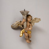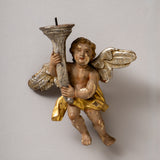 Small polychrome-painted winged putto in Baroque style, holding a cornucopia-shaped candle holder. The wings are finished in decorative silvering.