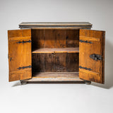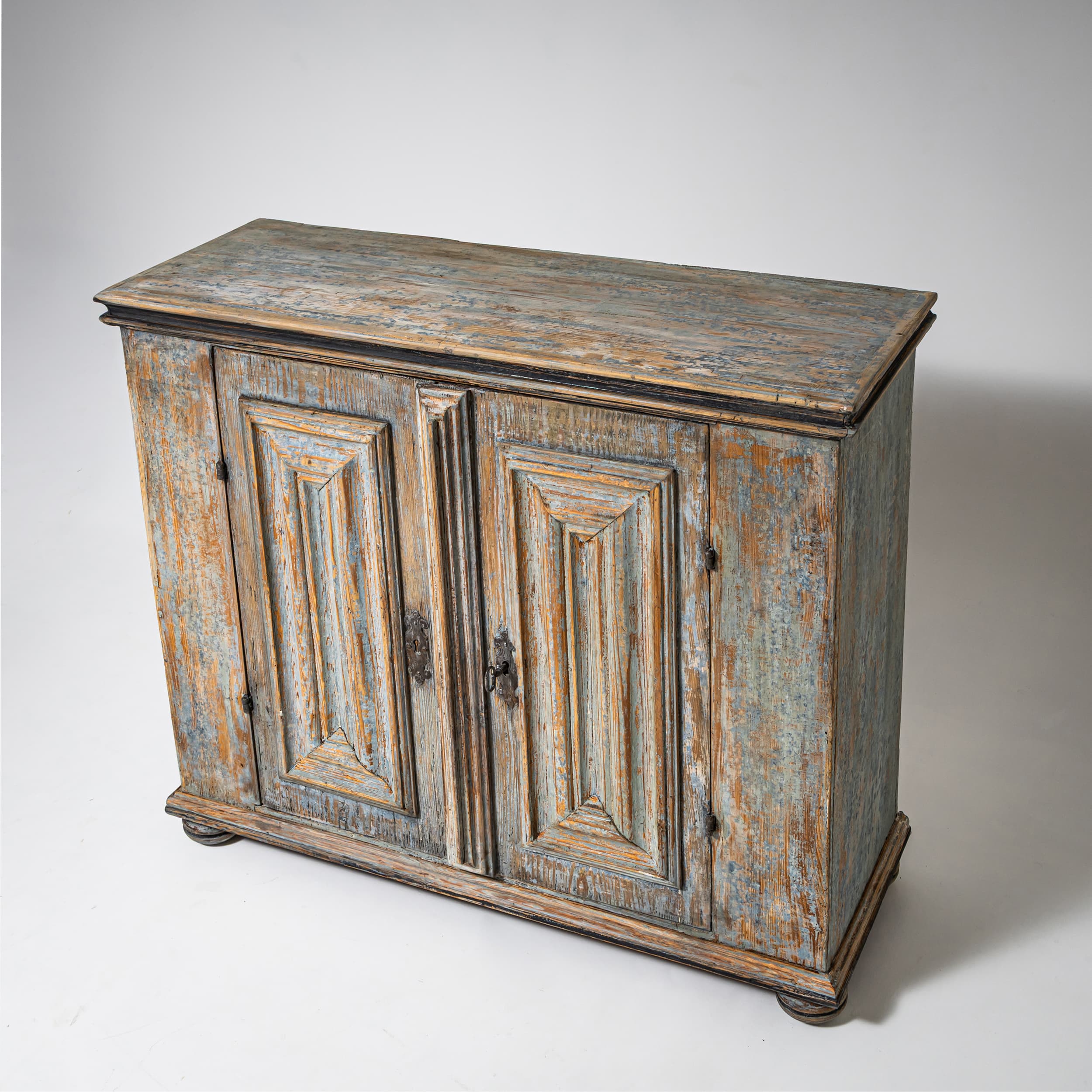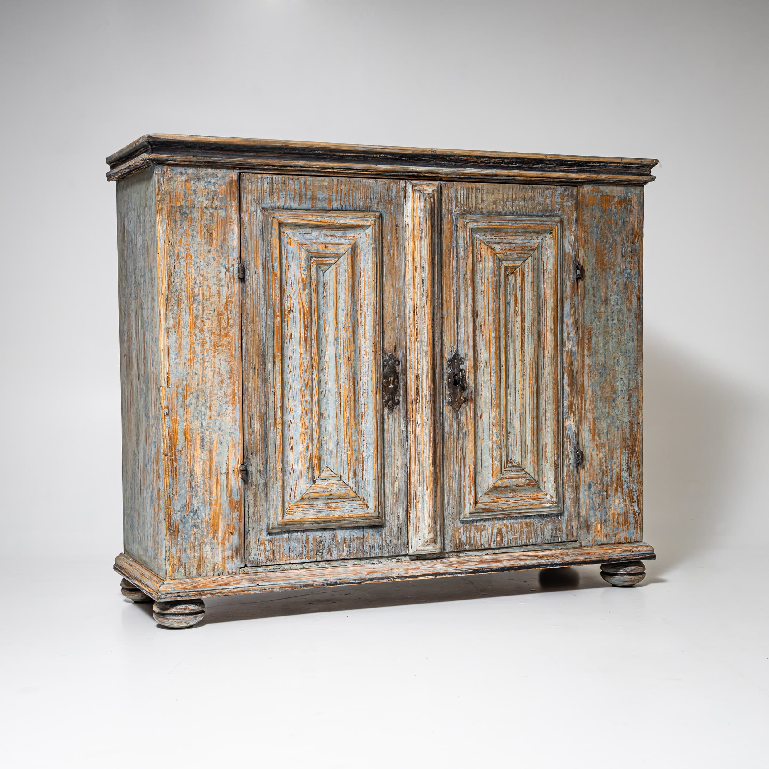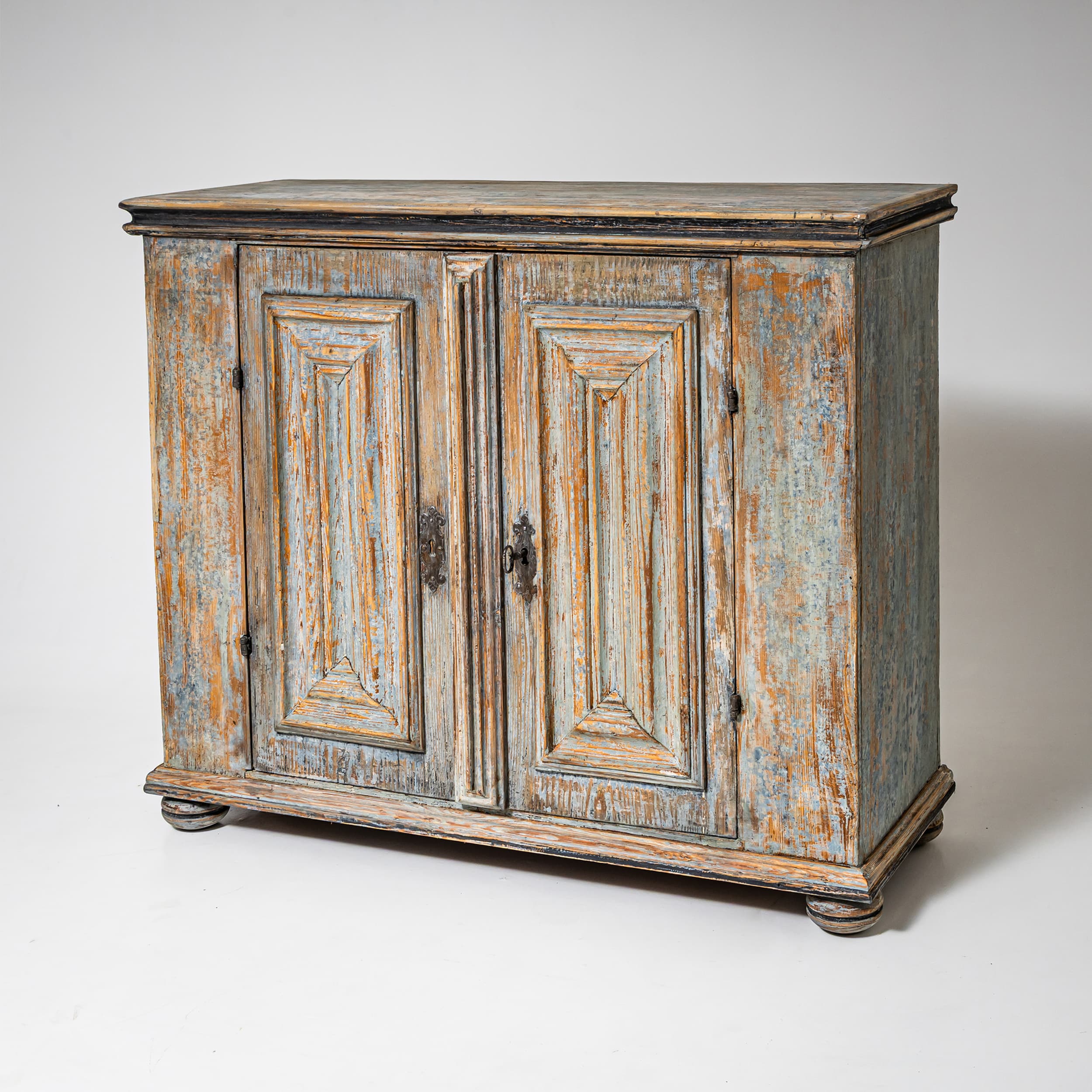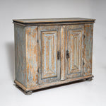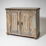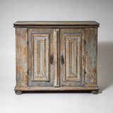 Baroque half-height cabinet with profiled panel doors, molded center stile, and iron fittings. The light blue paint finish is newly applied and given an antique patina. The interior is fitted with a single shelf.
