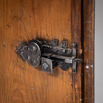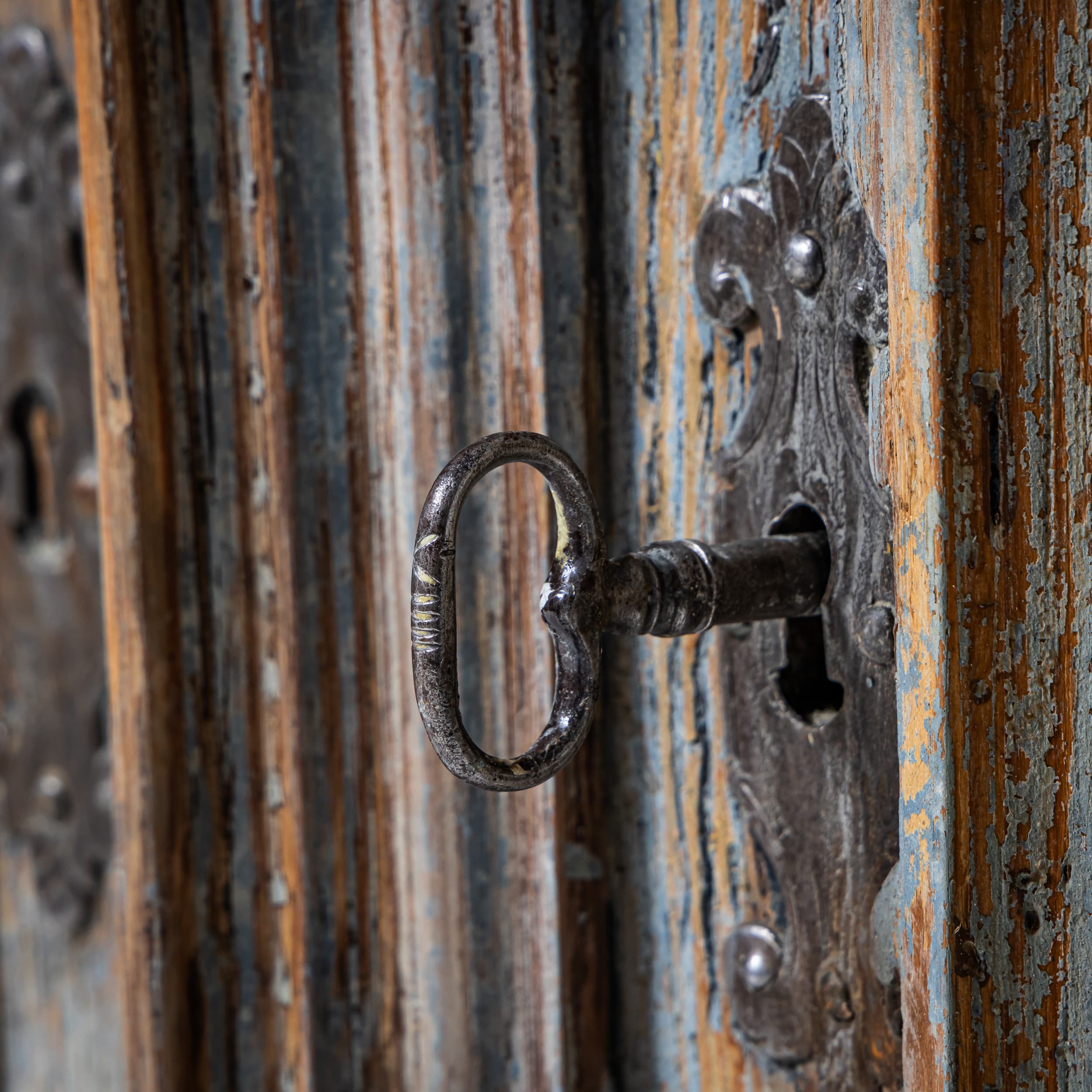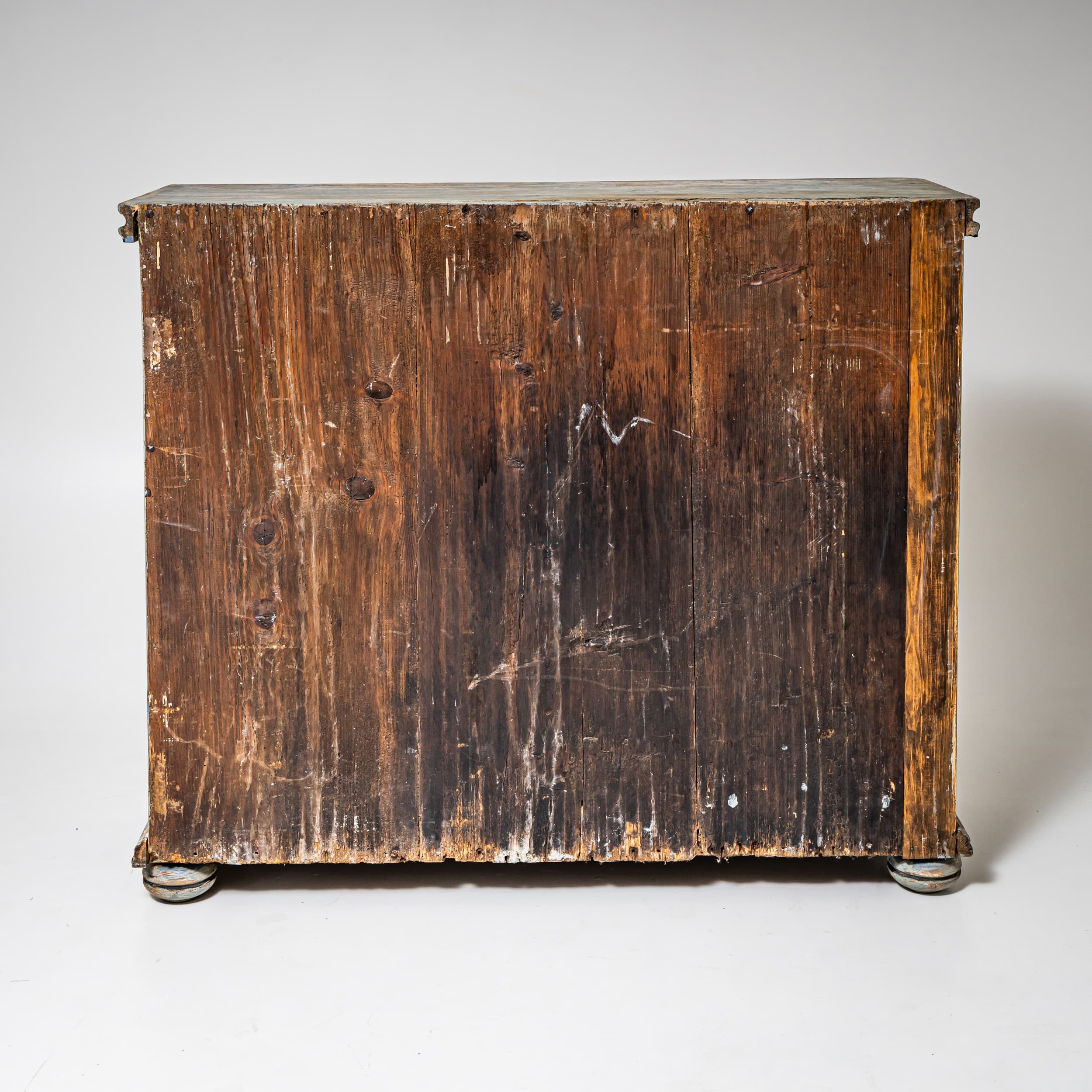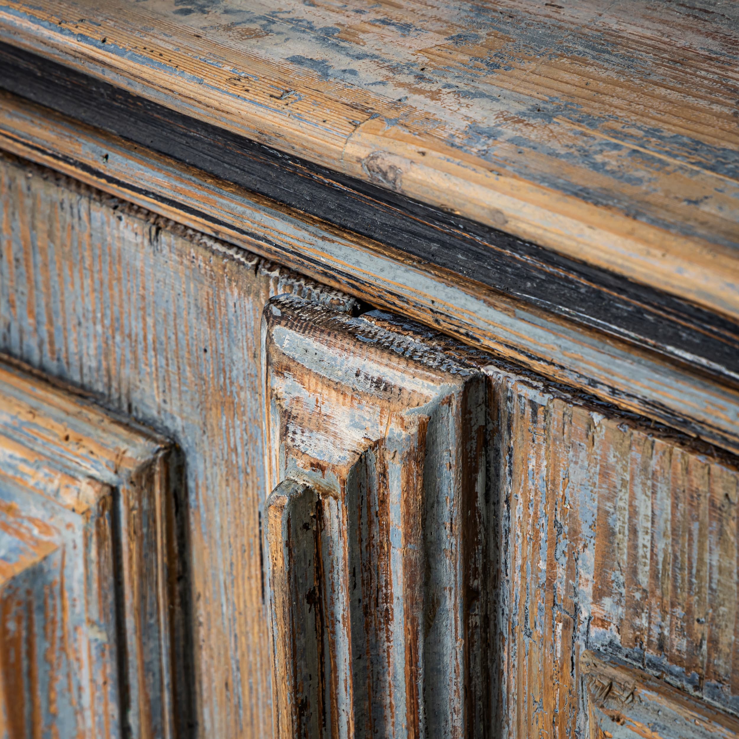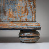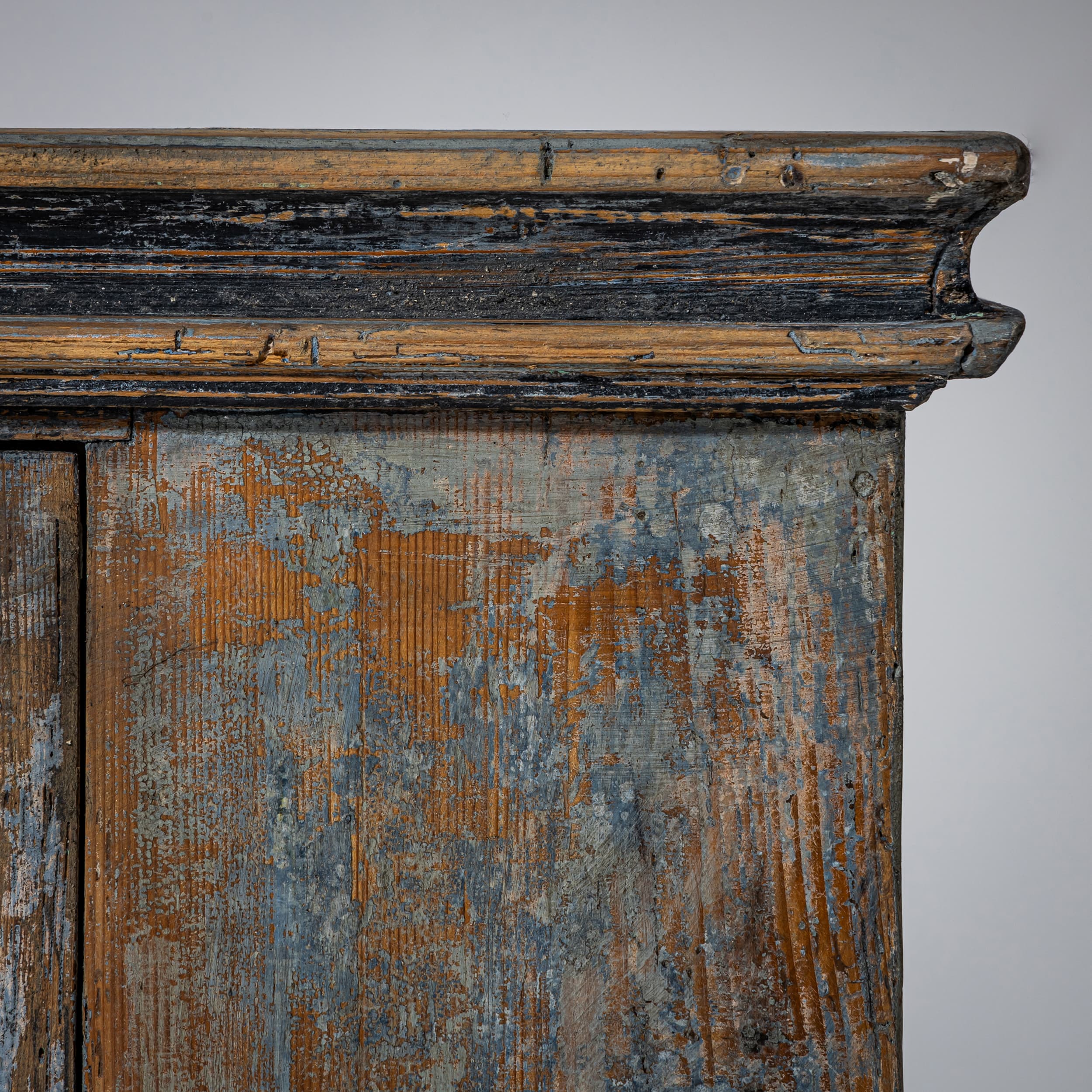 Baroque half-height cabinet with profiled panel doors, molded center stile, and iron fittings. The light blue paint finish is newly applied and given an antique patina. The interior is fitted with a single shelf.
