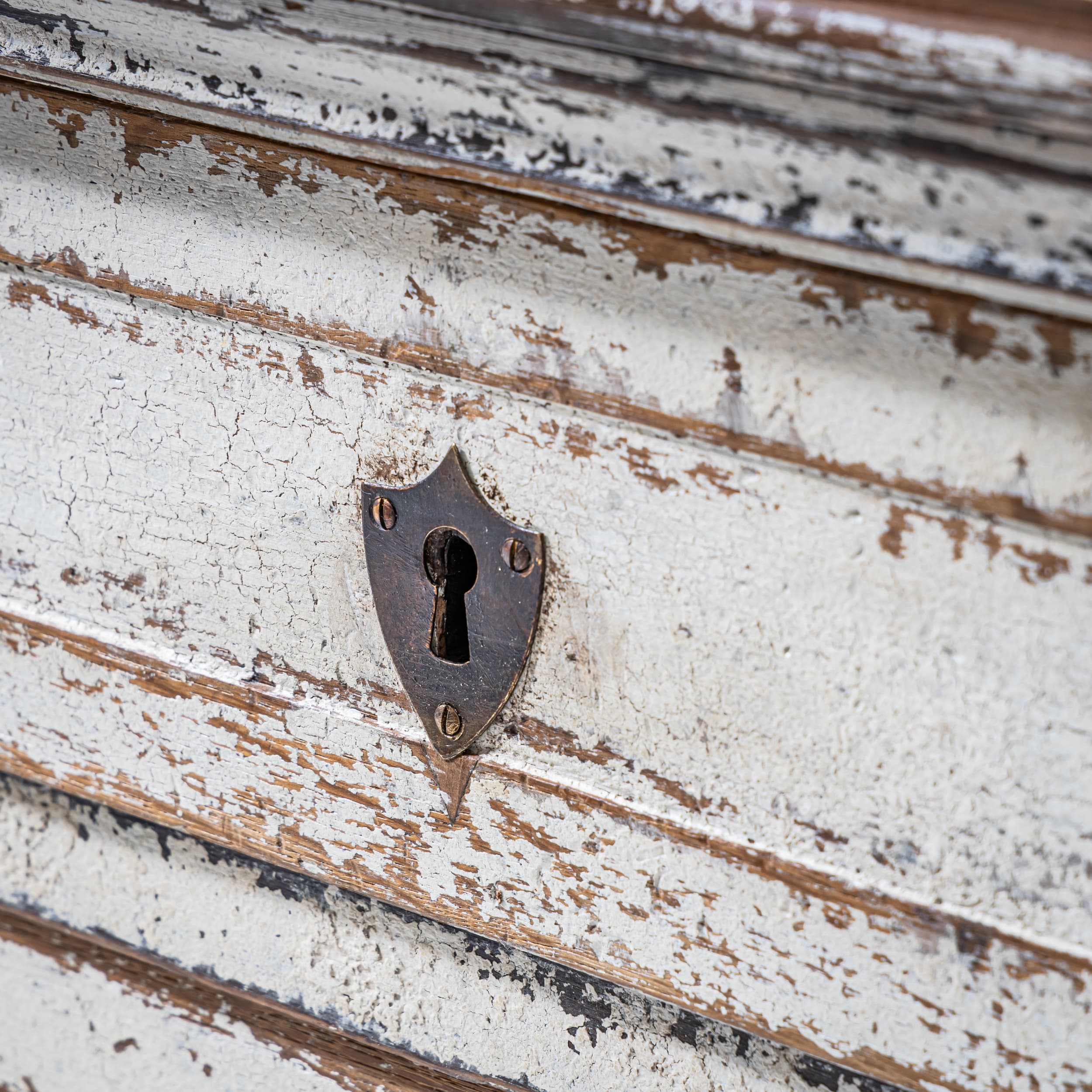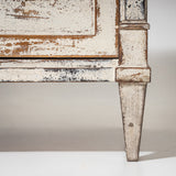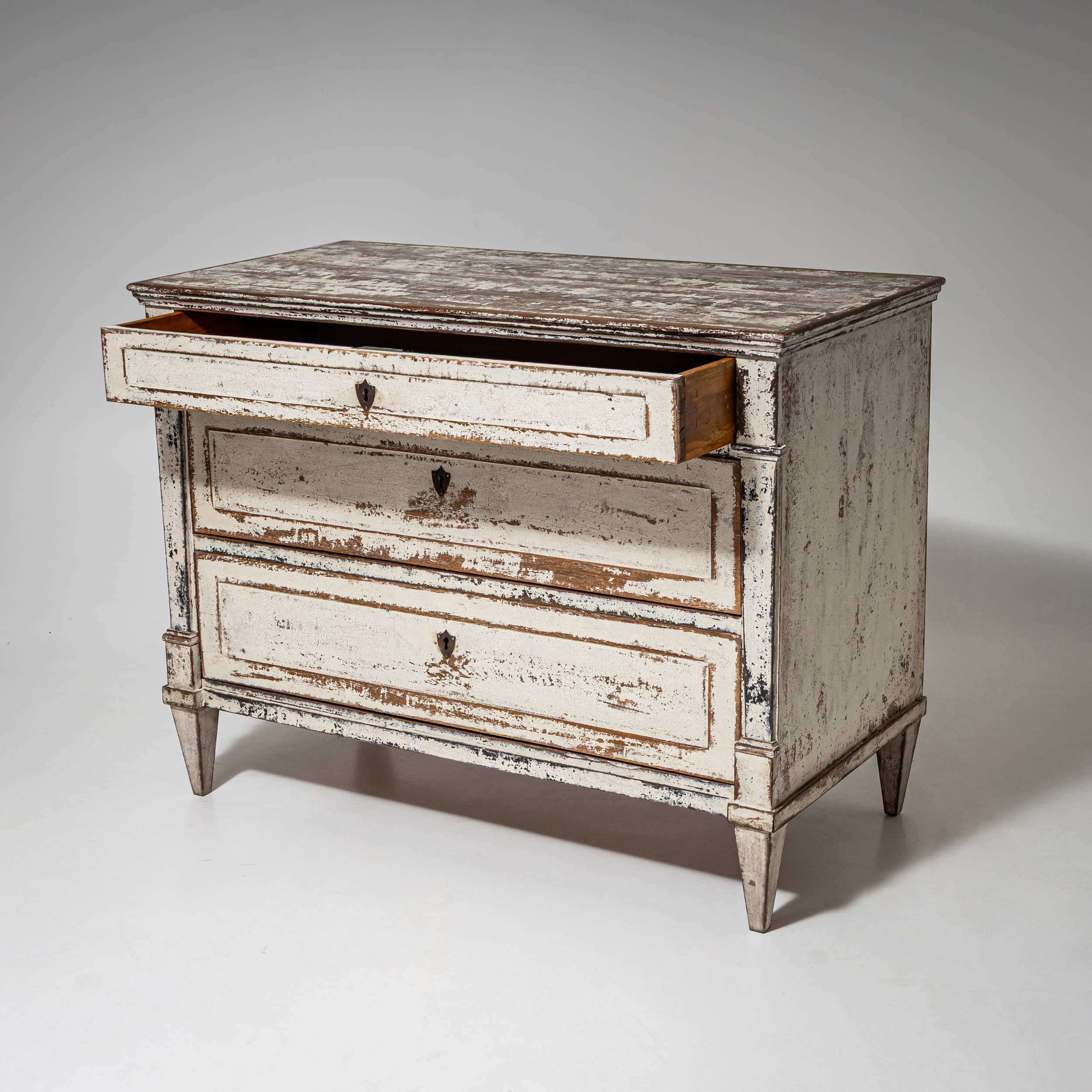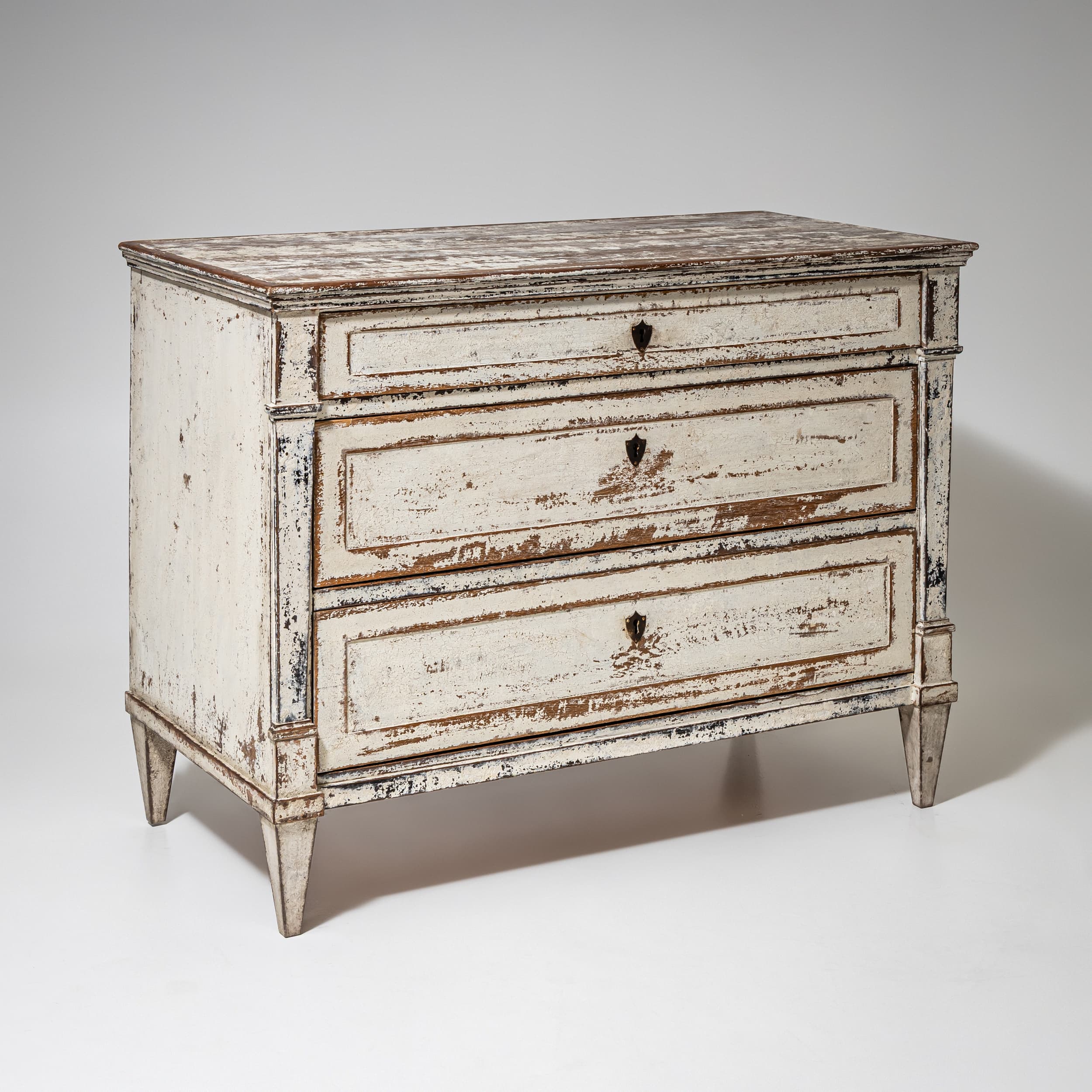 Chest of drawers with three drawers and a slightly projecting top. The front is articulated by side pilasters. The carcass and drawer fronts are light-painted and display a subtly textured surface. The piece stands on tapering legs.