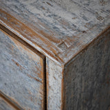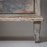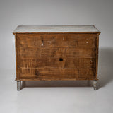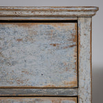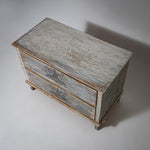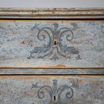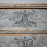 This solid pinewood chest of drawers, originating from South Germany between 1835 and 1840, features two full-width drawers and a molded top. The piece has been professionally refinished and repainted with grey-toned historical motifs over a distressed cream base.