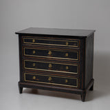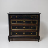 Black-painted chest of drawers with four drawers and brass ring pulls. Refined brass moldings accent the front and edges. The black stone top provides an elegant contrast and completes the piece. Newly painted and finished with an antique patina.