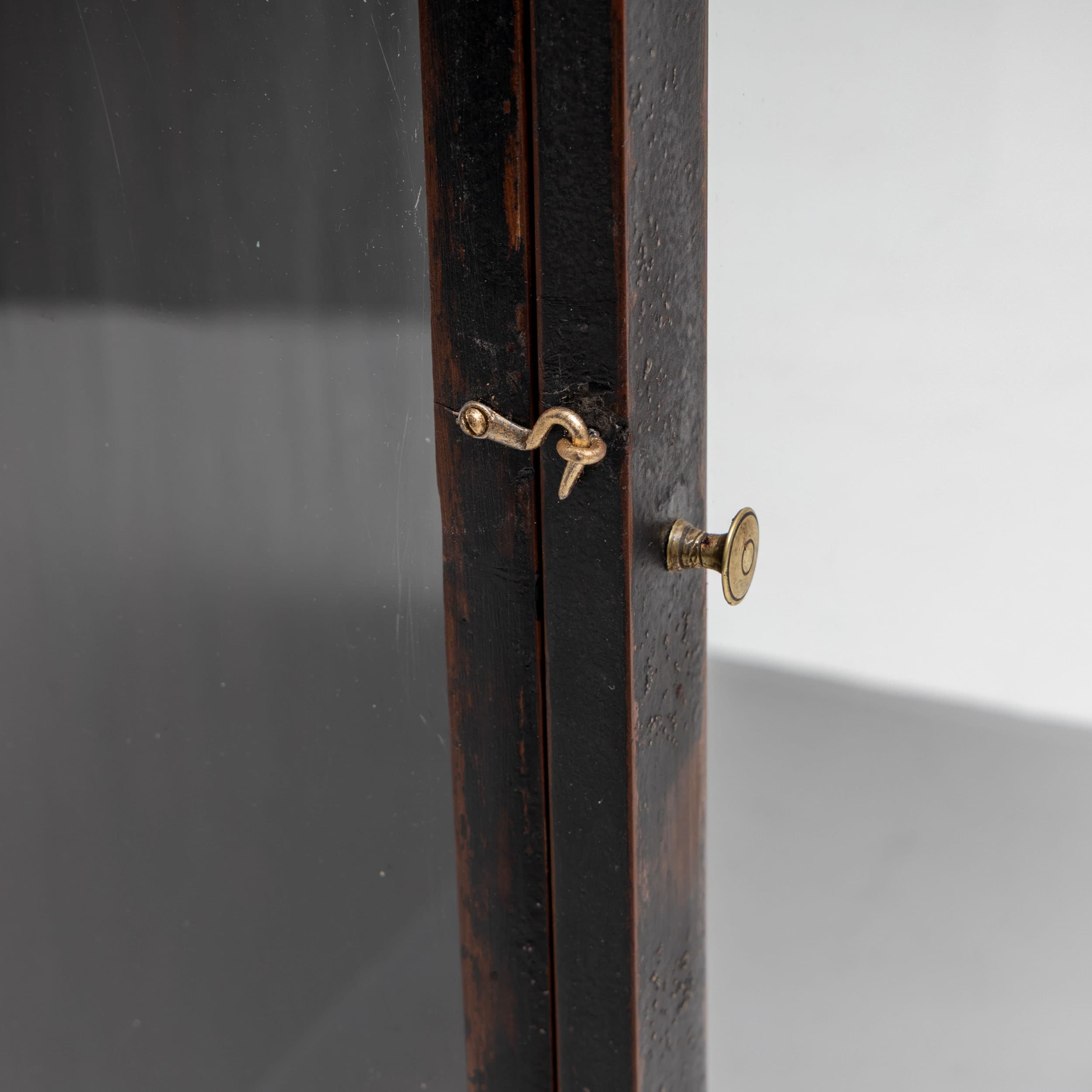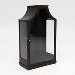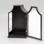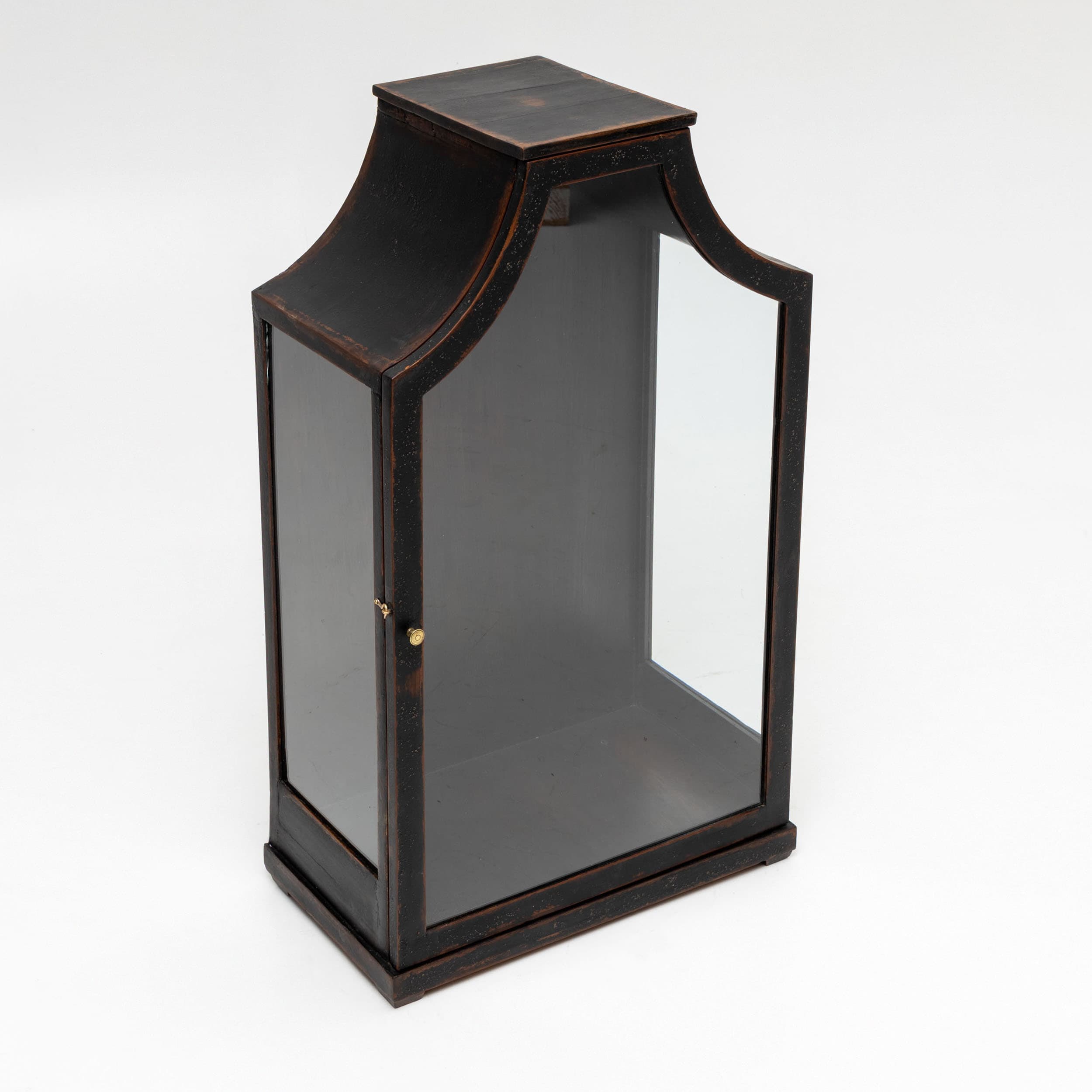 Black painted hanging display cabinet with a glazed front and side panels. The piece features a distinctive curved top and a simple base. This single-door vitrine is fitted with a small brass knob and is perfect for displaying collectibles.