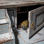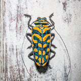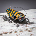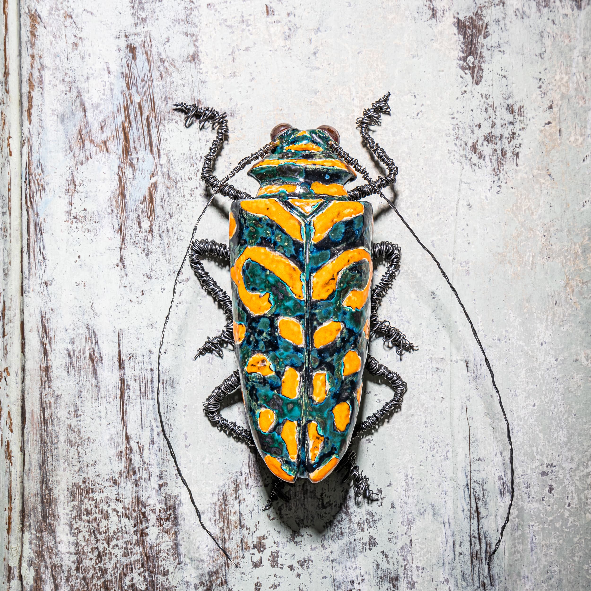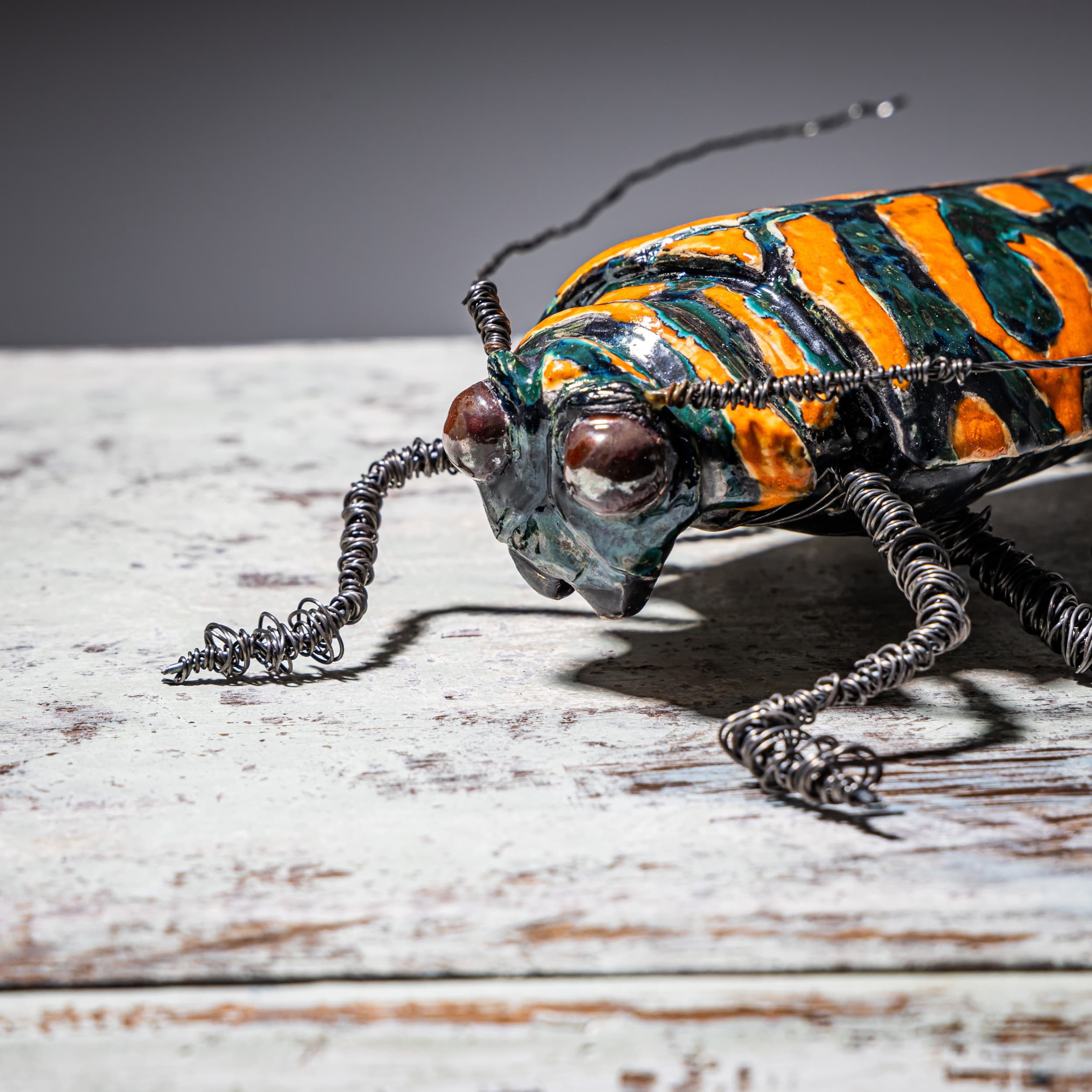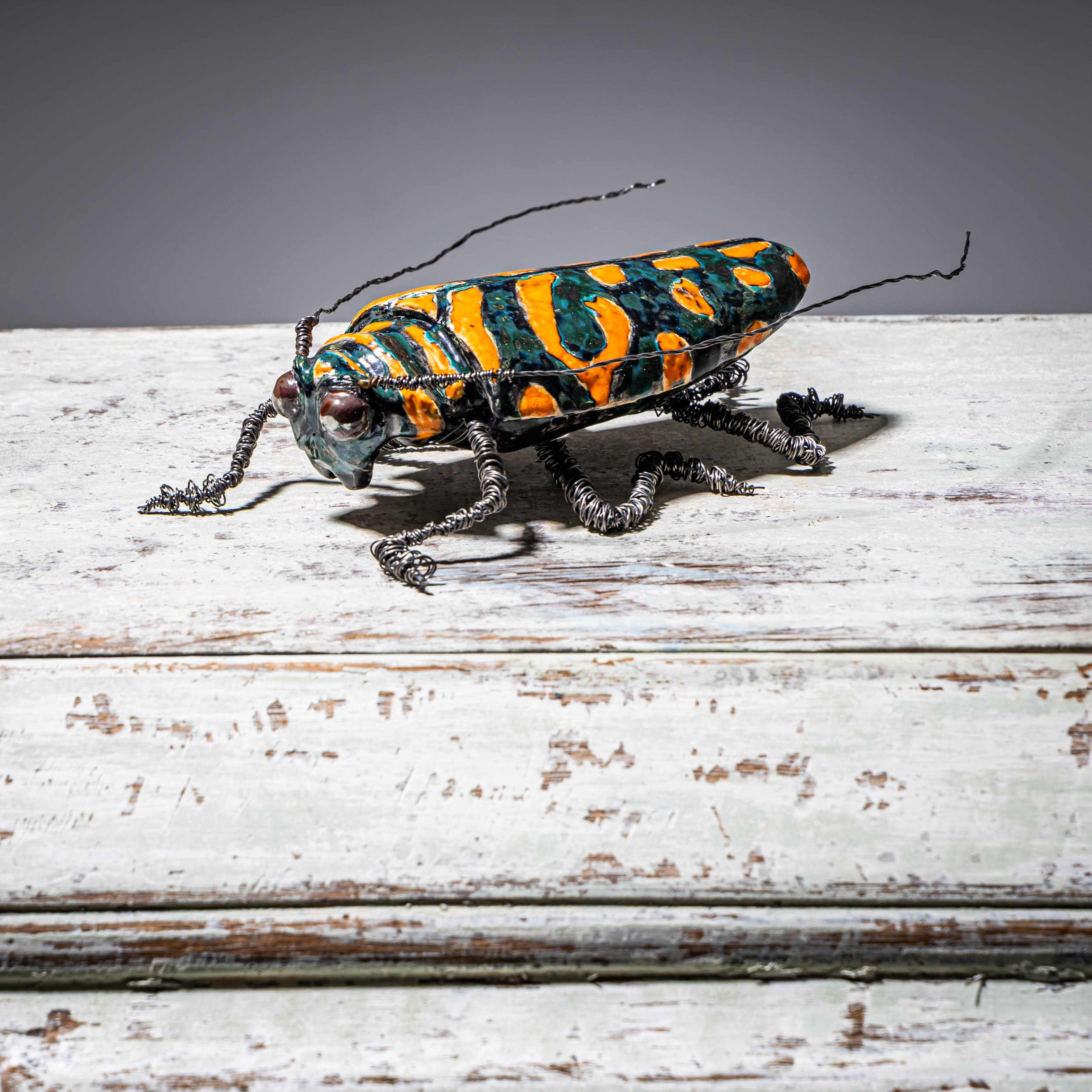 Sculptural beetle made of ceramic and wire, handcrafted in Europe, 2025. The boldly glazed body is decorated with striking graphic patterns, while the legs and antennae are formed from twisted wire. The combination of sculptural mass and linear wire elements gives the piece strong character and expression. An unusual art object with a playful spirit and strong collector appeal.