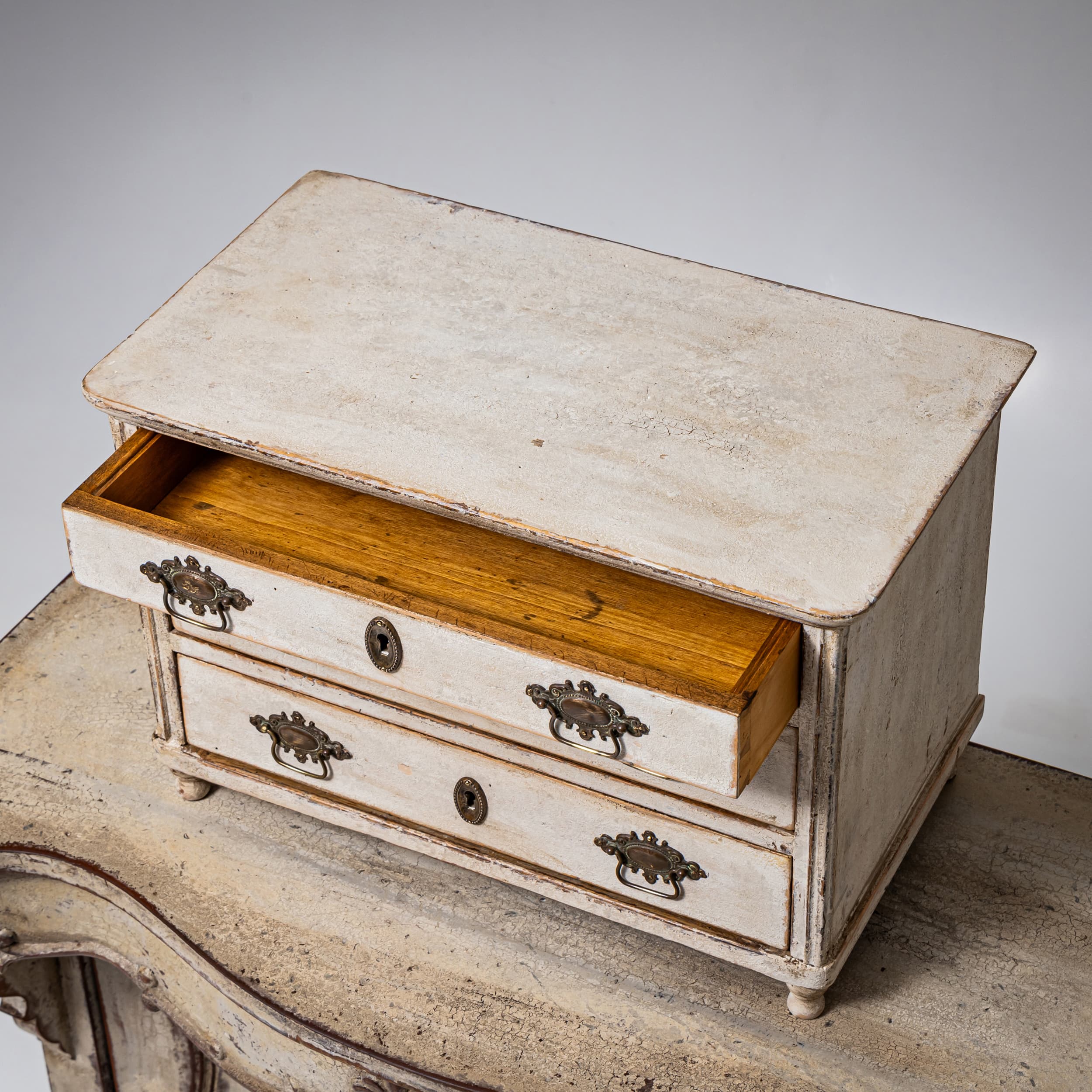 Cream-painted miniature commode with three drawers, rounded fluted corners, and small baluster feet. The bronze fittings add a refined touch. The paint finish is newly applied and given an antique patina.