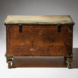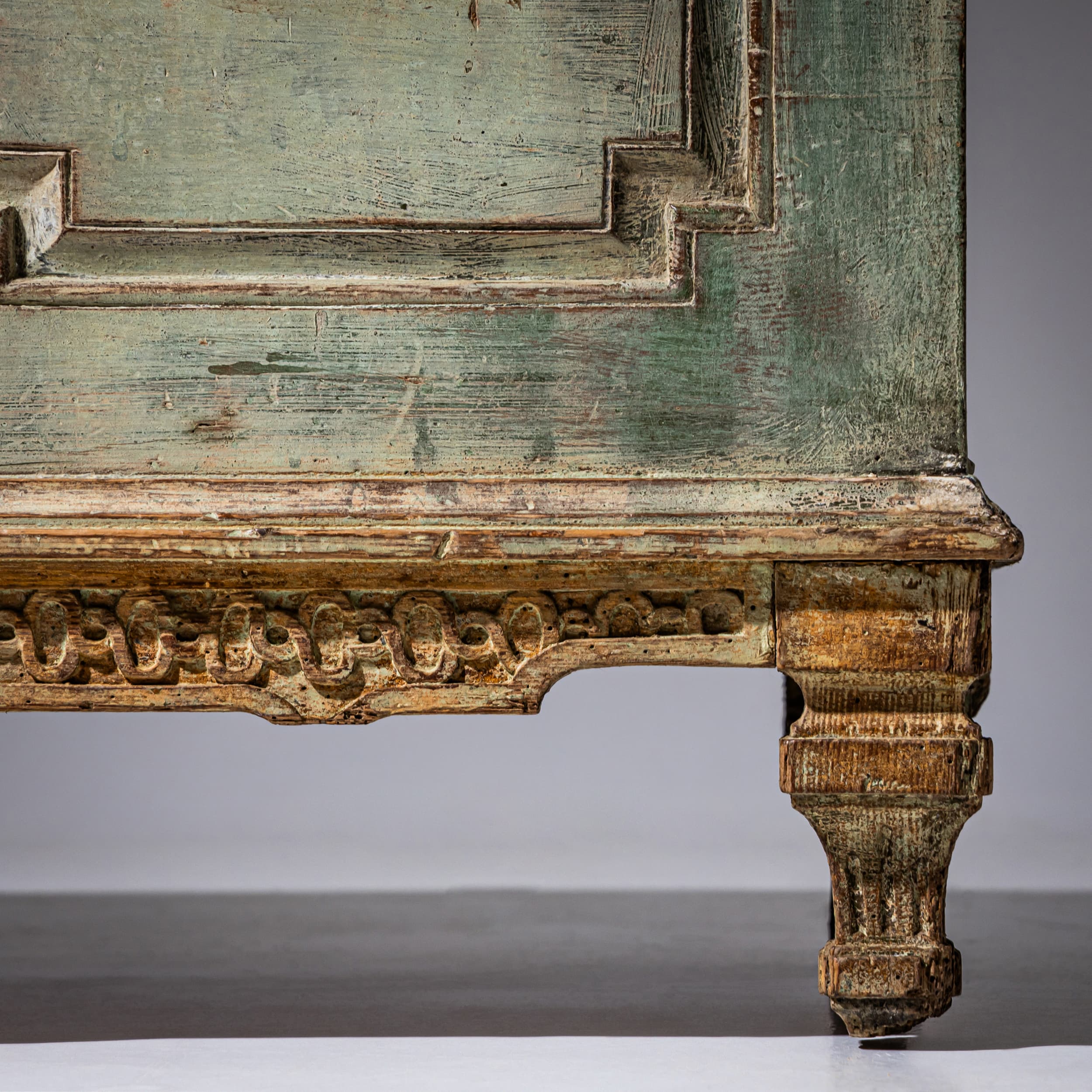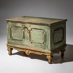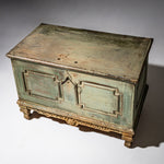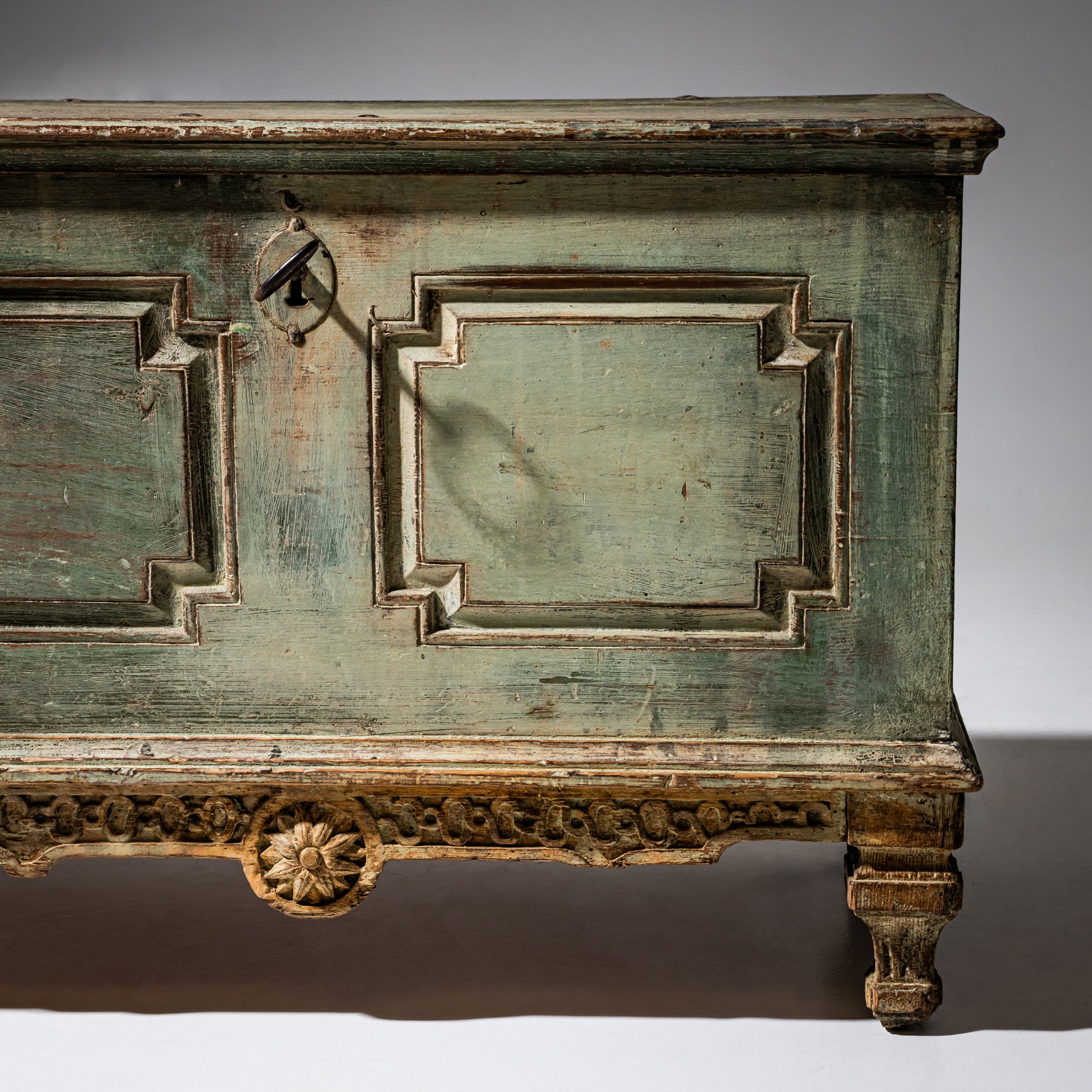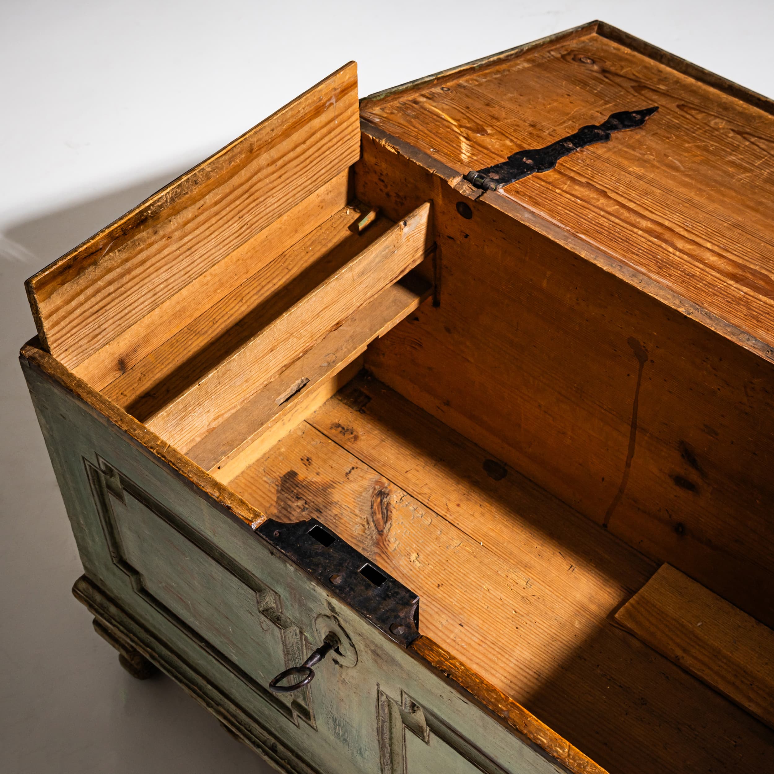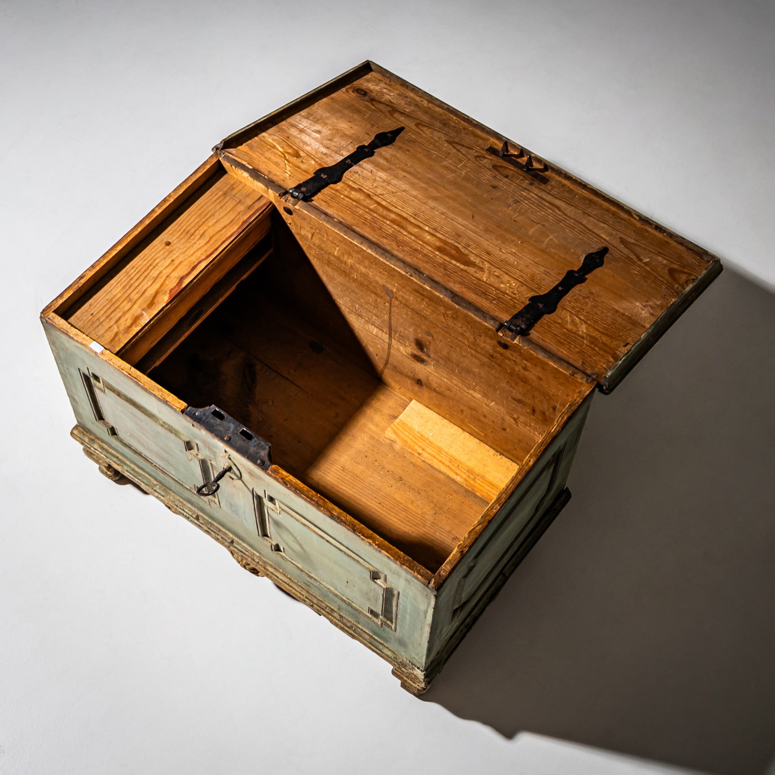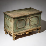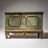 Louis XVI lid chest featuring octagonal paneled fields on the surfaces. The chest stands on fluted carved legs and is fitted with a carved apron centered by a rosette. Constructed from spruce wood, it includes an additional interior compartment. The hardware, including lock and key, is made of iron. The green painted finish is newly applied and subsequently antiqued.