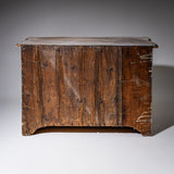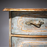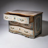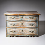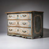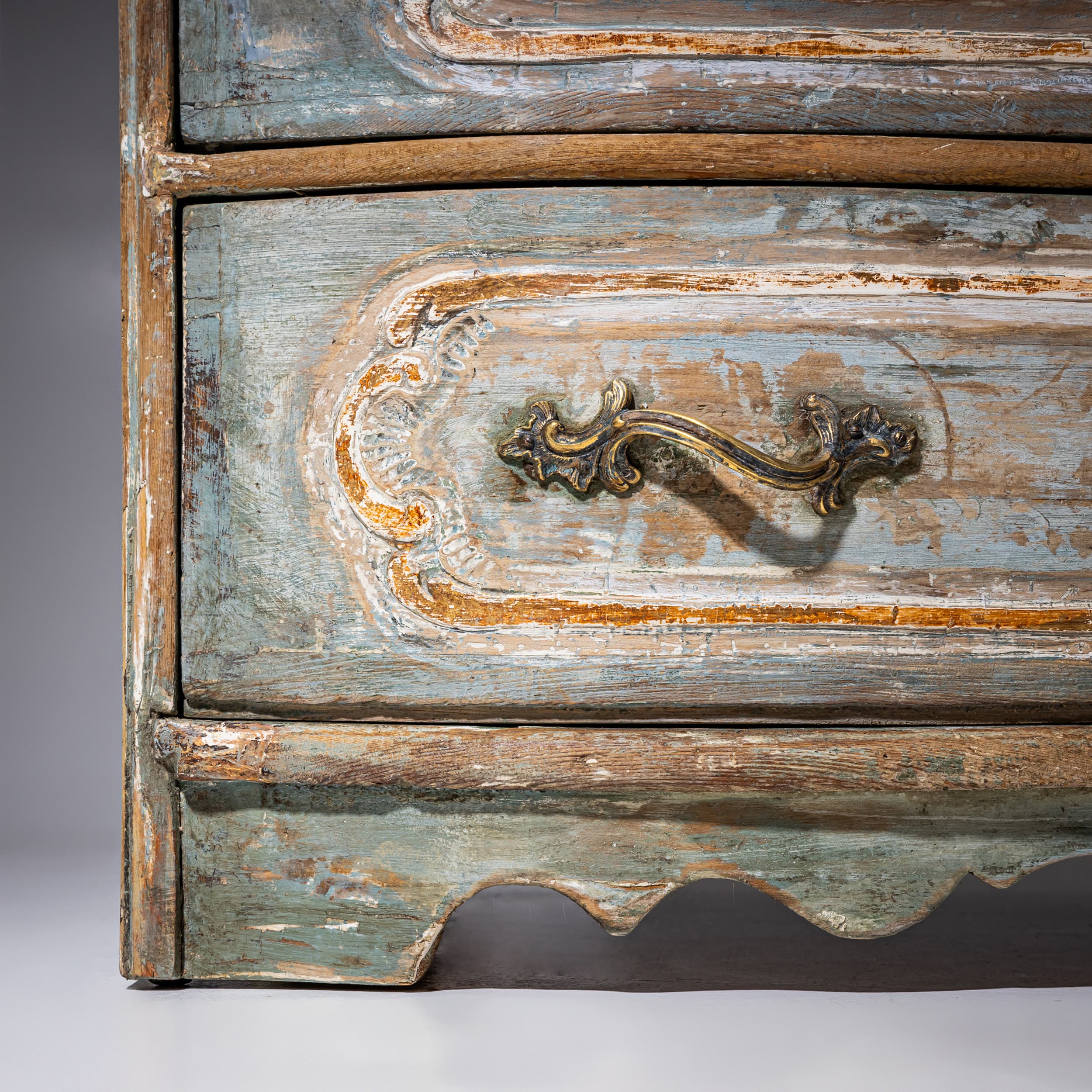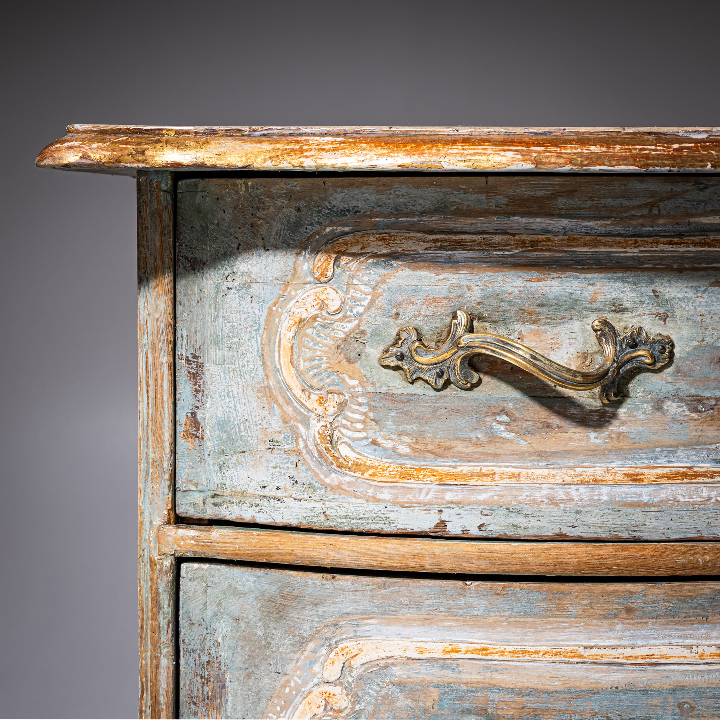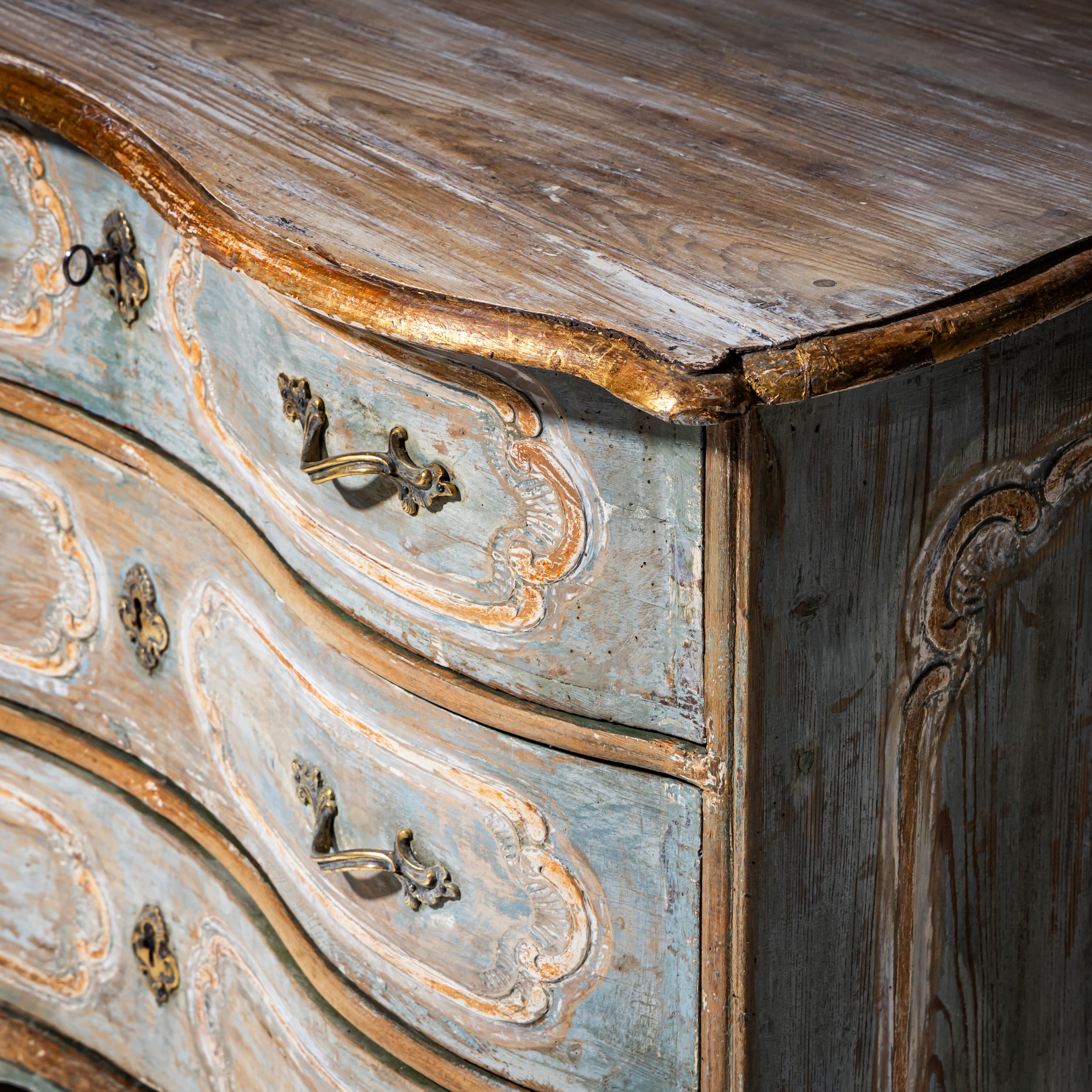 Hand-painted Baroque commode with three drawers and a shaped serpentine apron. The chest features an elegant serpentine front, a finely curved top, and traces of the original paint. The front is divided into molded panels and adorned with bronze mounts.
