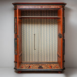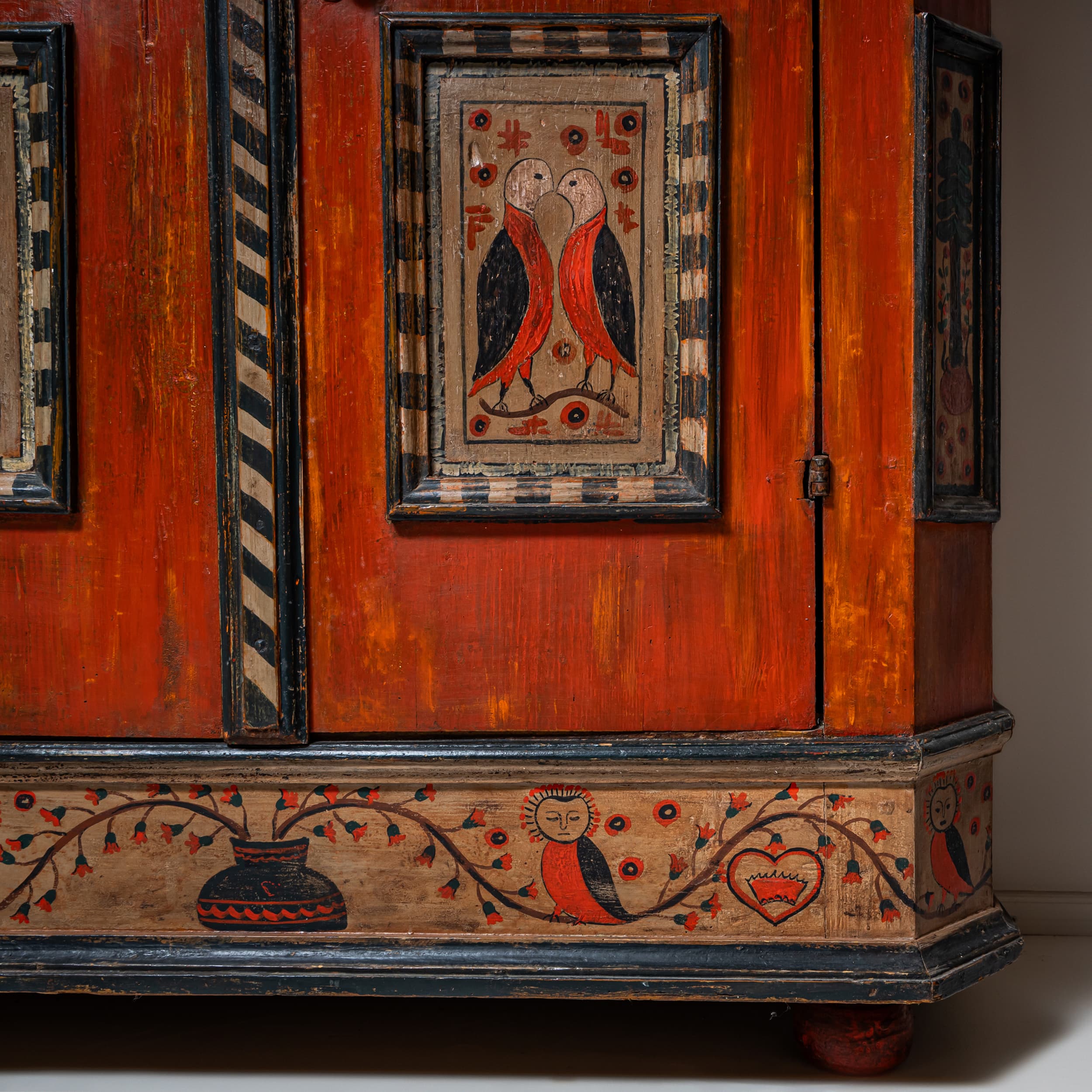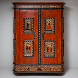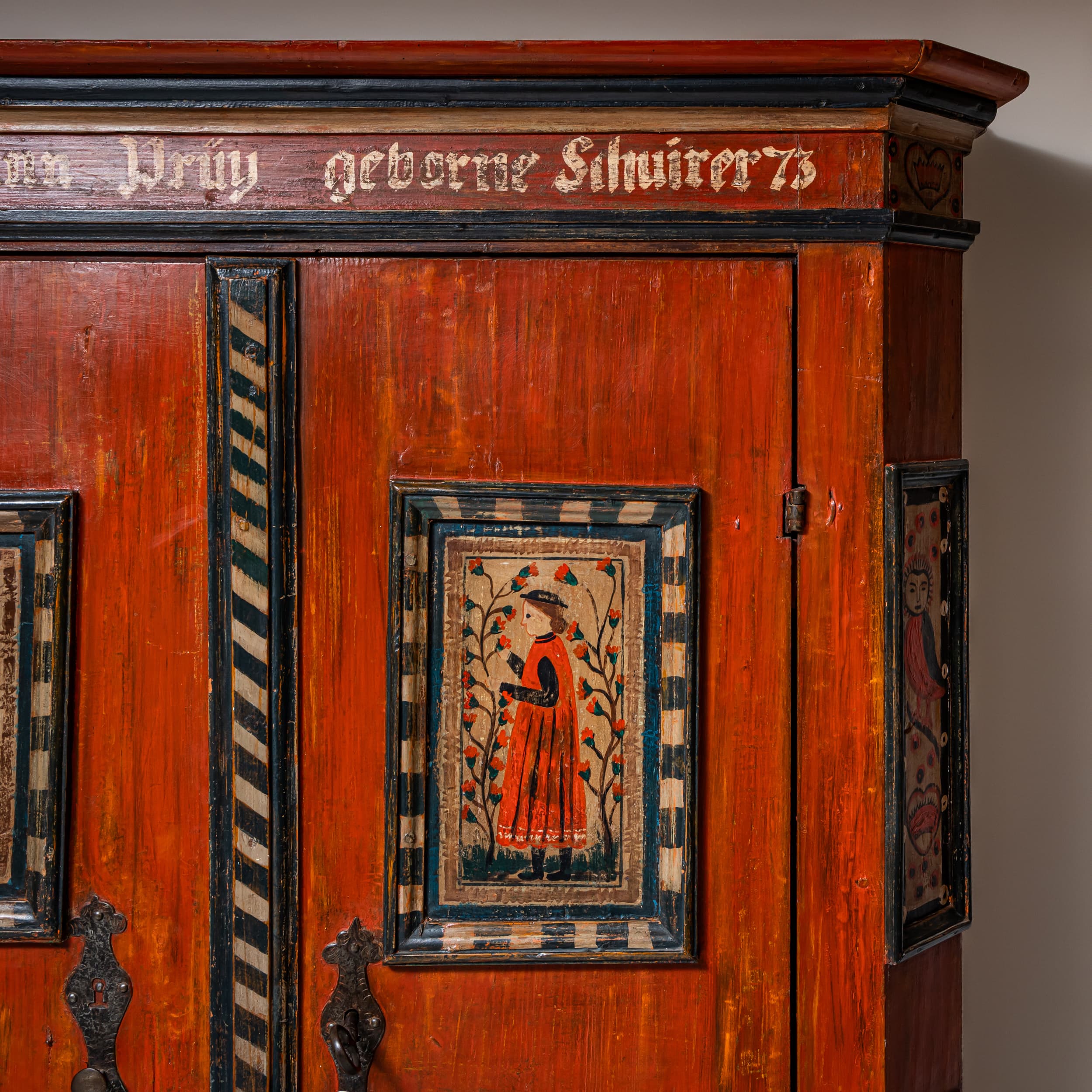 Hand-painted two-door folk armoire from Franconia, crafted in fir wood, featuring panelled doors adorned with figural scenes and birds. The piece is painted in a deep red ground with contrasting black accents. The profiled cornice bears the inscription “Maria Anna Prüy geborene Schuirer” and the date 1773. Fitted with original iron hardware. The interior is paper-lined and equipped with a clothes rail and hat shelf.