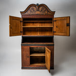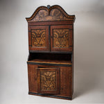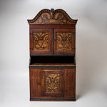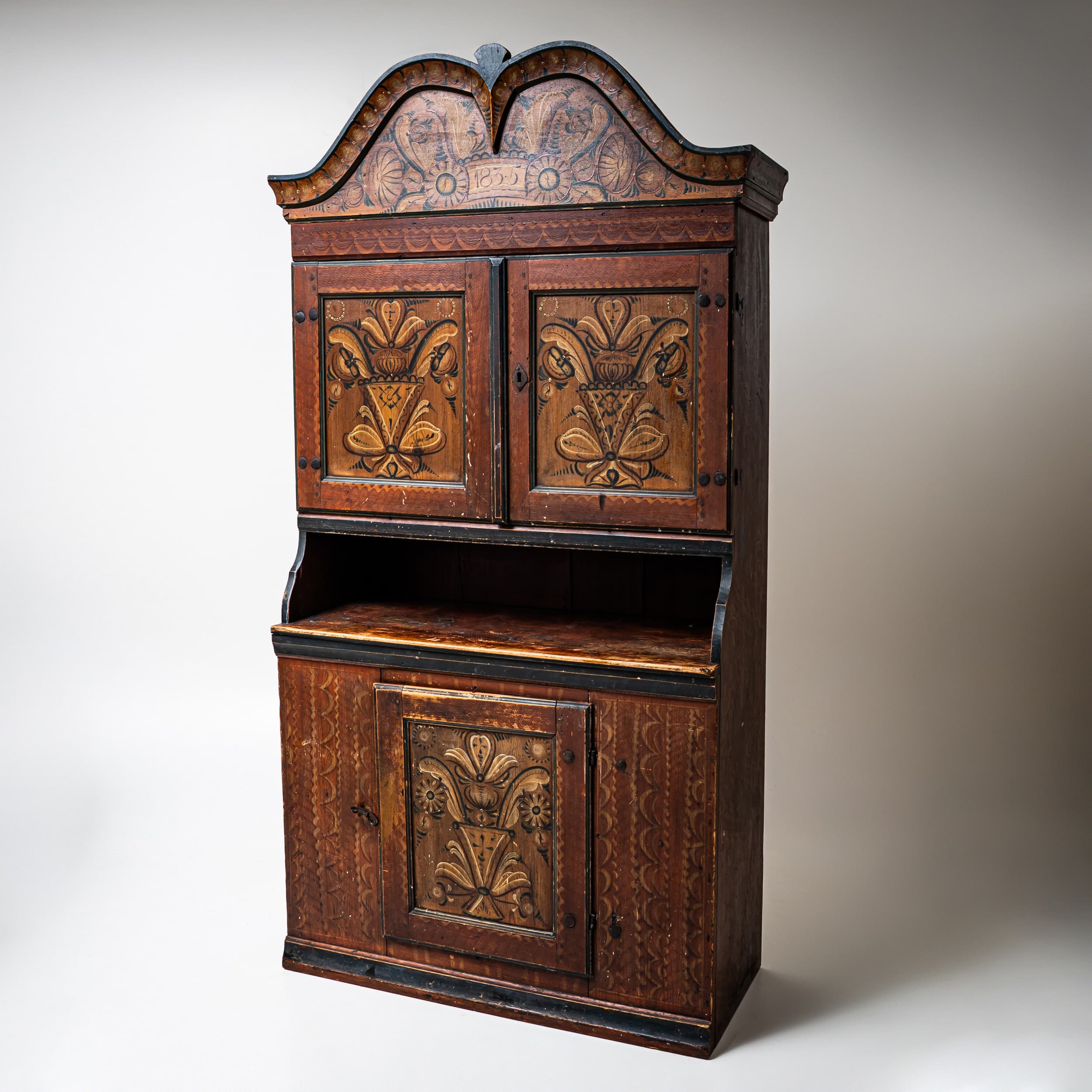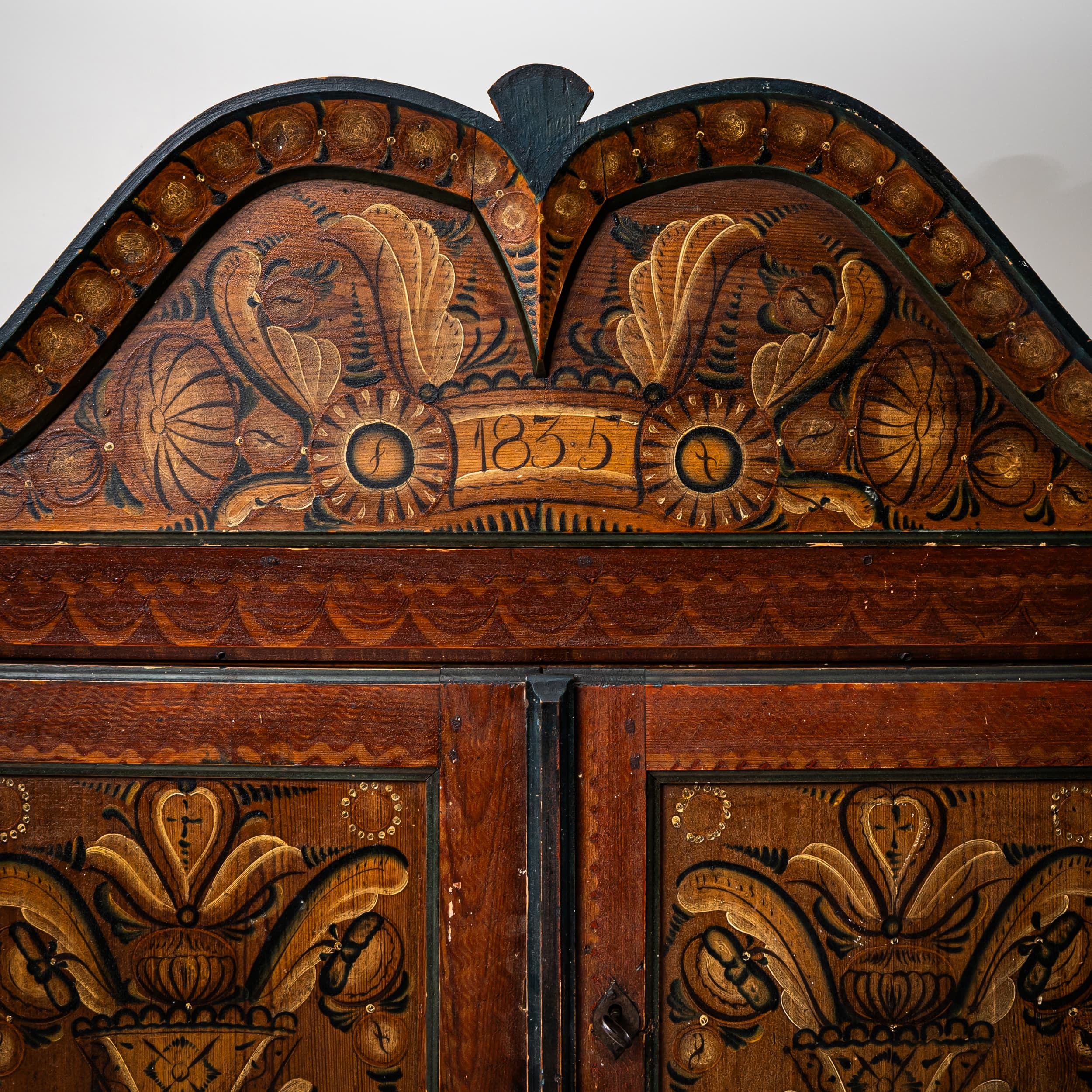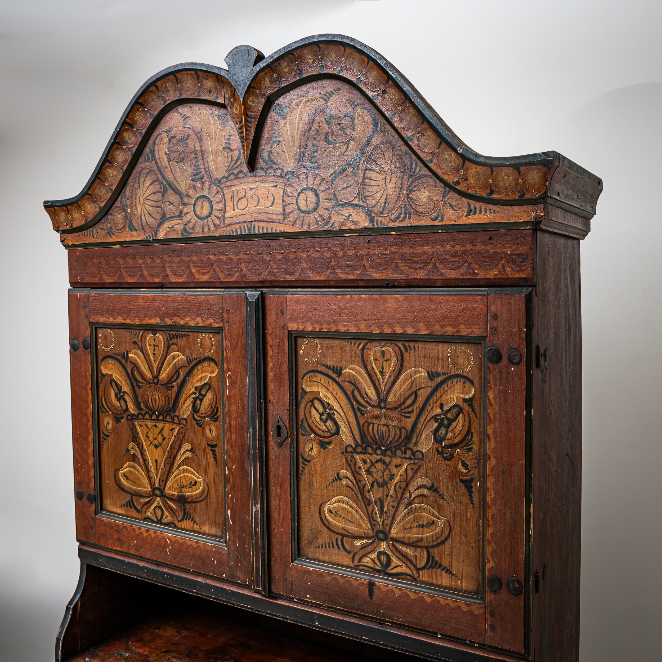 Hand-painted folk armoire in pine with two-door upper section, open shelf area, and lower door compartment. Red-ground floral decoration. Date 1835 painted in the raised cornice.