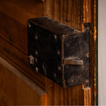 Large rural hand-painted two-door wardrobe cabinet in Baroque style, featuring a curved pediment and an apple-shaped cartouche with the monogram “EL” and dated 1860. The lower section includes two drawers, and the corners of the cabinet are chamfered. The original dark blue painted decoration displays four panels on the doors with reddish floral motifs, complemented by additional floral details on the pilasters and drawers. The carcass is made of spruce wood and fitted with iron strap hinges. The interior is fitted with rows of coat hooks, making the piece suitable for use as a wardrobe.