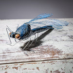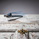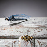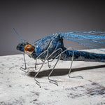 Sculptural representation of a dragonfly (Odonata), handcrafted from ceramic and wire and finished with a polychrome glaze. The elongated body is rendered in shimmering blue tones, while the delicately formed wire wings create a sense of lightness and motion. The combination of stylized form and naturalistic detail highlights the artisanal quality of this contemporary piece. A charming decorative object with strong sculptural appeal.