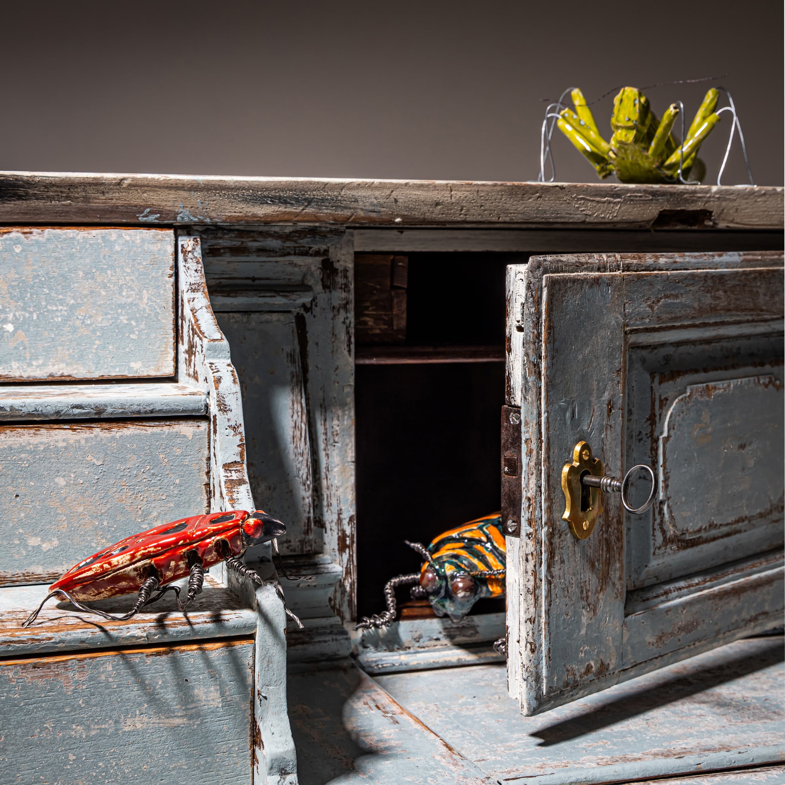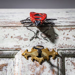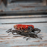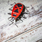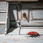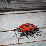 This oversized firebug (Pyrrhocoris apterus) is rendered in a naturalistic yet charmingly stylized manner, featuring the species’ distinctive red body with black markings. The compact, flat-oval form is made of glazed ceramic, while the legs and antennae are formed from wire, lending the piece a playful sense of lightness.
