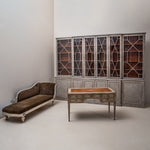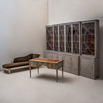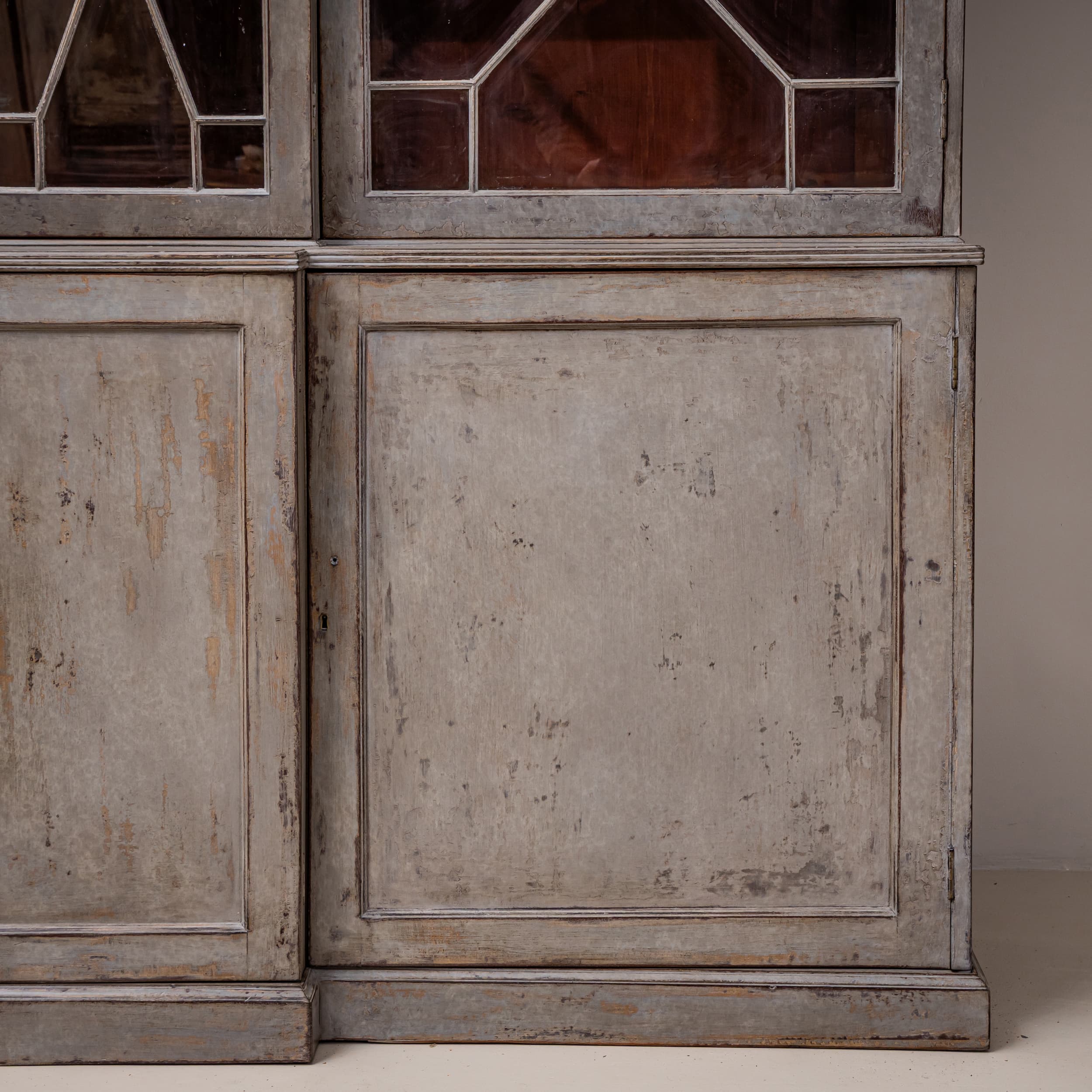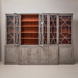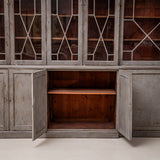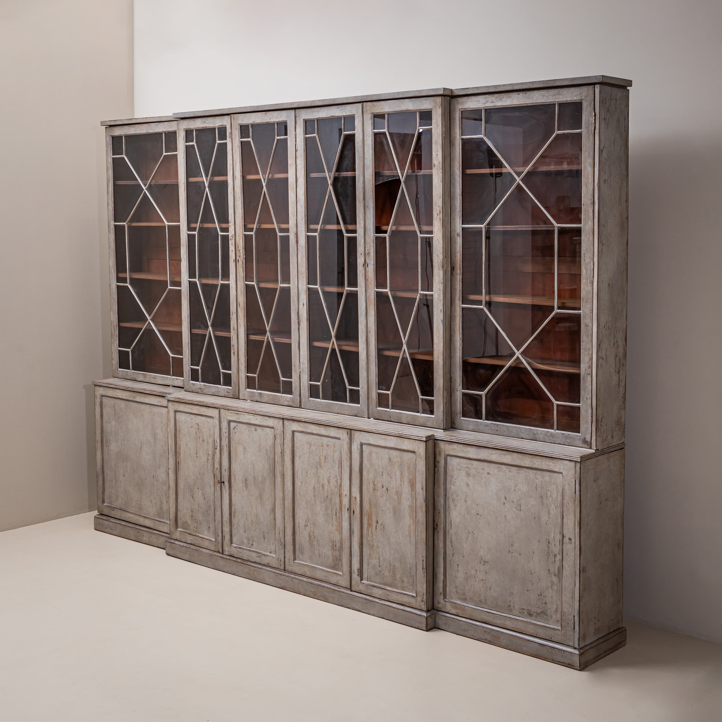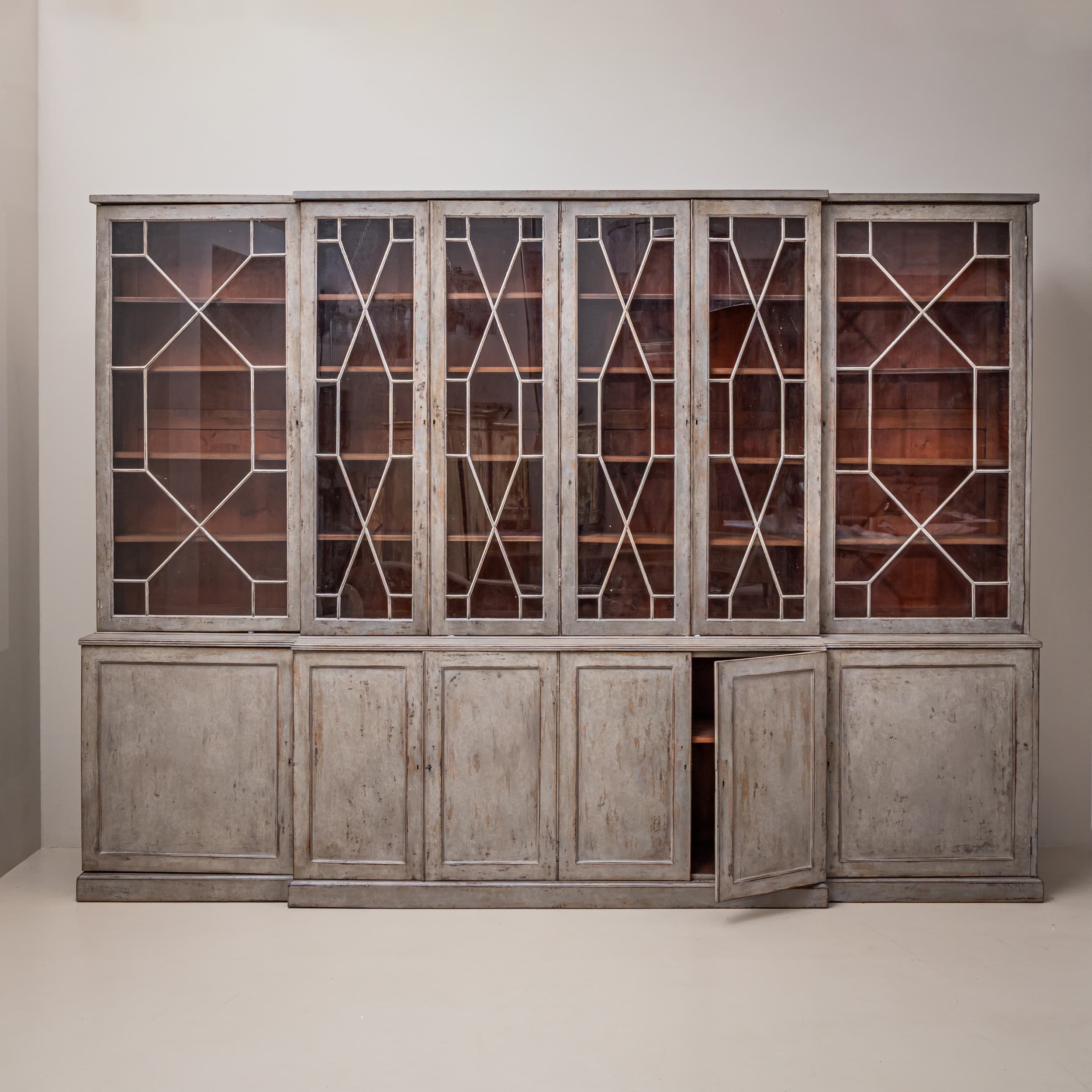 Large Chippendale library bookcase featuring a six-door lower section with central risalit and a matching six-door glazed upper cabinet. The glass doors display refined geometric muntin work, and the interior offers height-adjustable shelving. The grey-white painted finish is newly executed and completed with an antique patina.