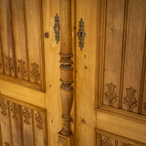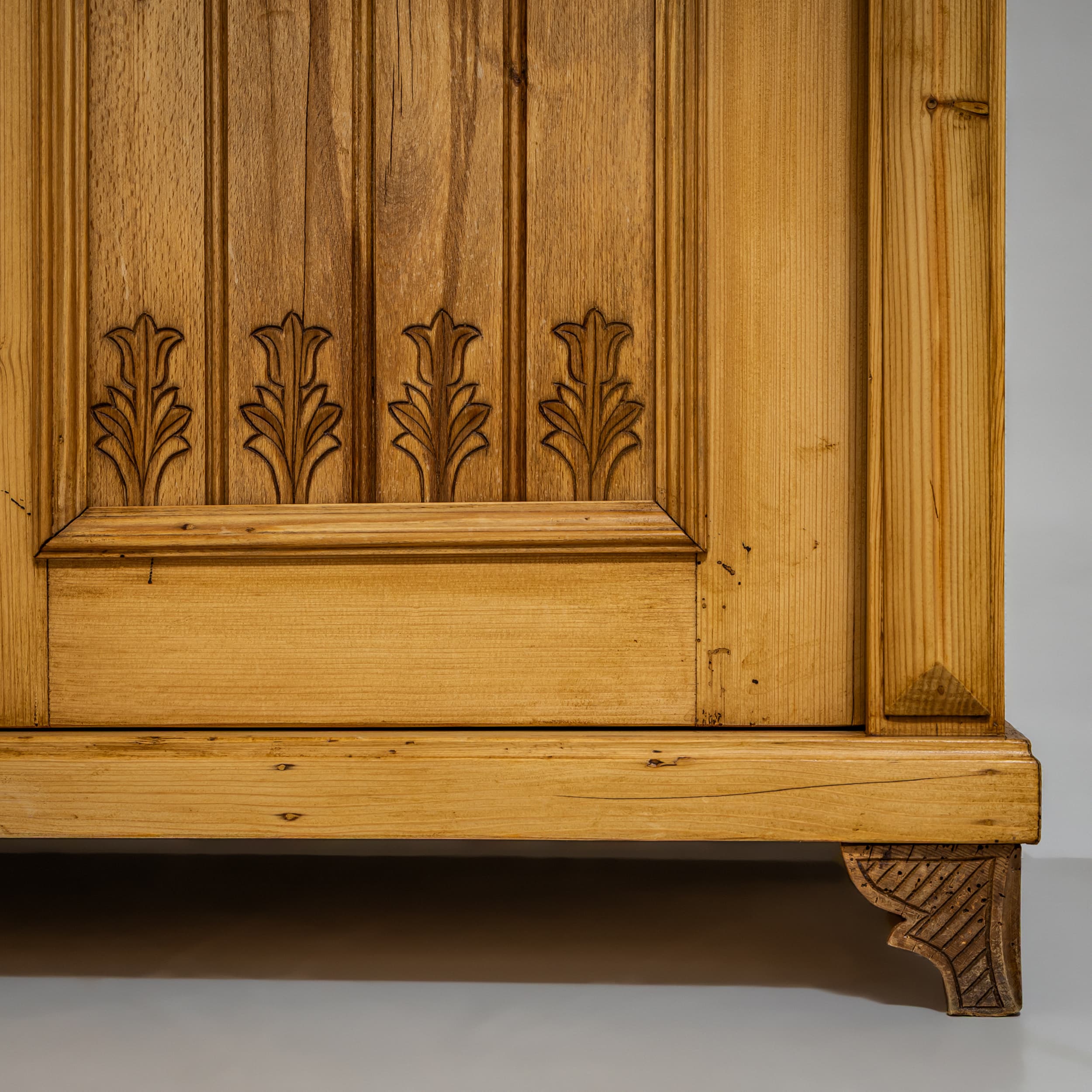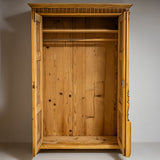 Gründerzeit softwood wardrobe featuring two doors and baluster-shaped column supports on the stiles and central divider. The doors are adorned with carved, stylized floral motifs. The cornice is richly molded and decorated with vertical fluting.