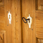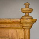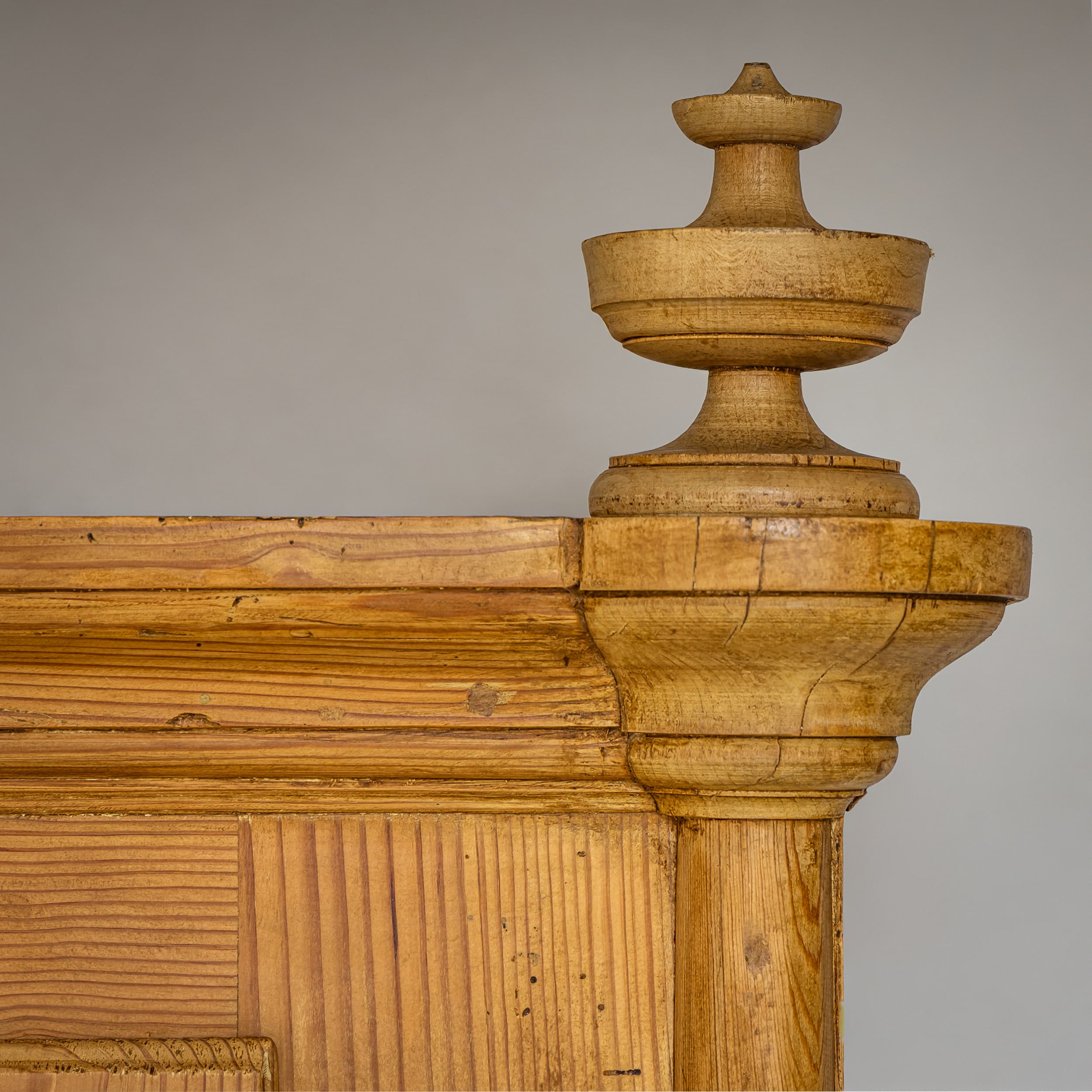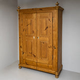 Softwood wardrobe with two doors and gracefully rounded corners, topped with decorative finials. Each door features double recessed panels, giving the piece a balanced and refined appearance. The interior includes a rail with coat hooks and can be adapted to individual needs upon request.