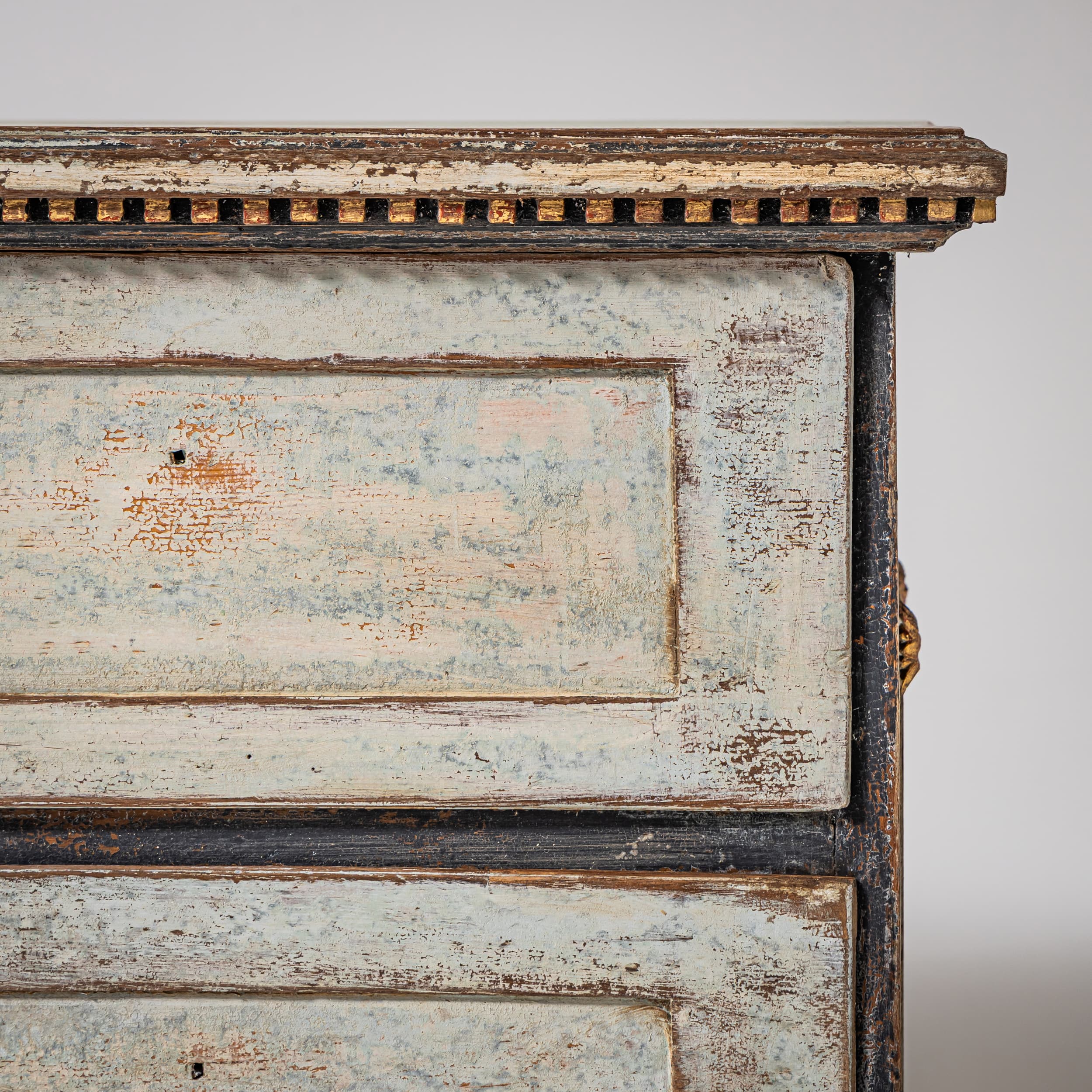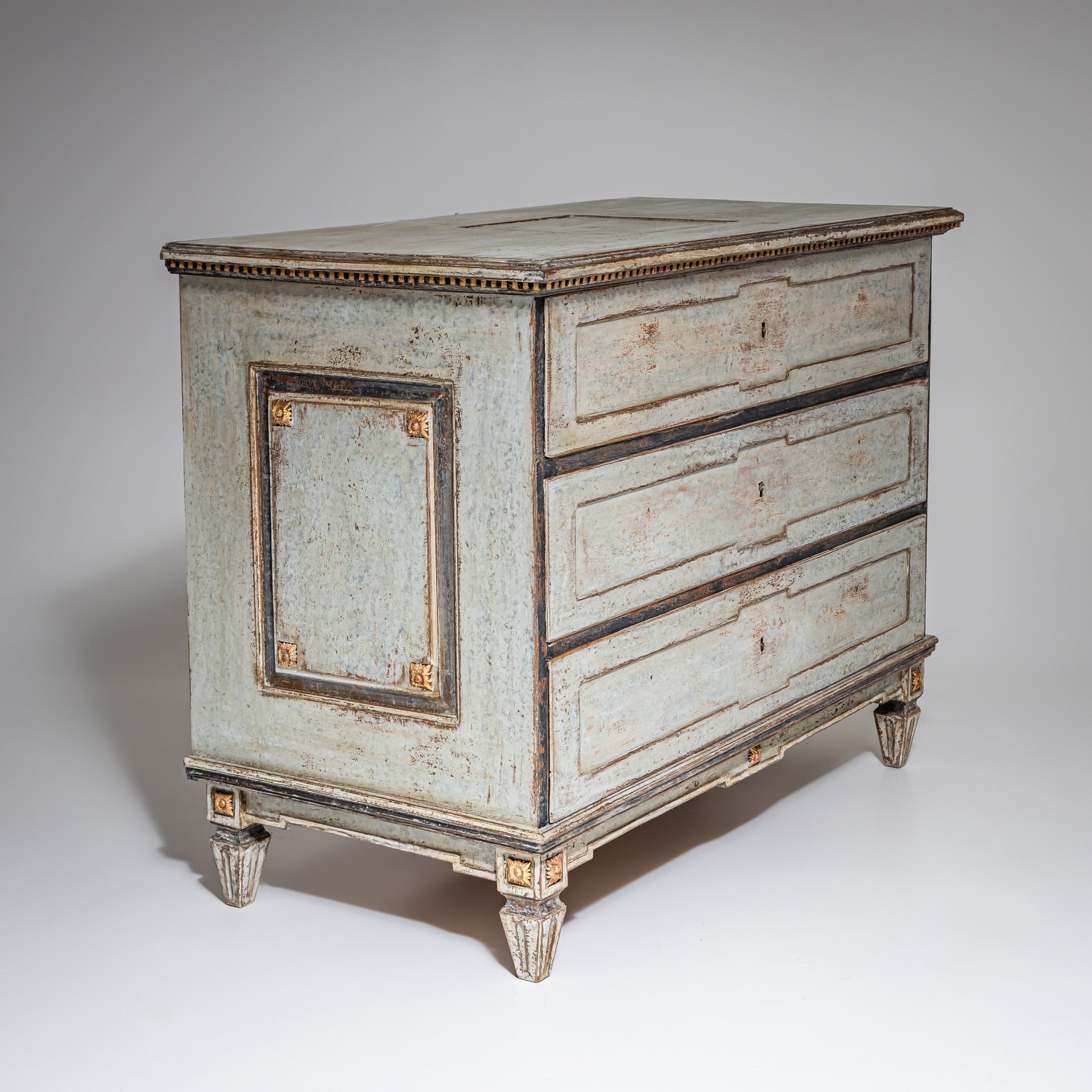 Three-drawer Louis XVI chest with newly applied light green finish and an antique patina. The top is framed by a dentil frieze. The tapered legs are highlighted with gilt accents. The sides feature paneled fields with rosettes at the corners.