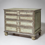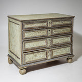 Large late-18th-century chest of drawers with four drawers and a clearly articulated rectangular case. The drawer fronts and case are defined by molded paneling. The chest stands on bun feet. The surface is finished in a light green painted ground with silvered accents. The painted decoration has been newly executed after historical models and carefully patinated to achieve an aged appearance.