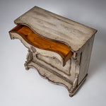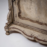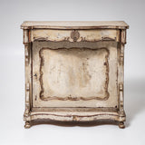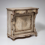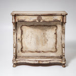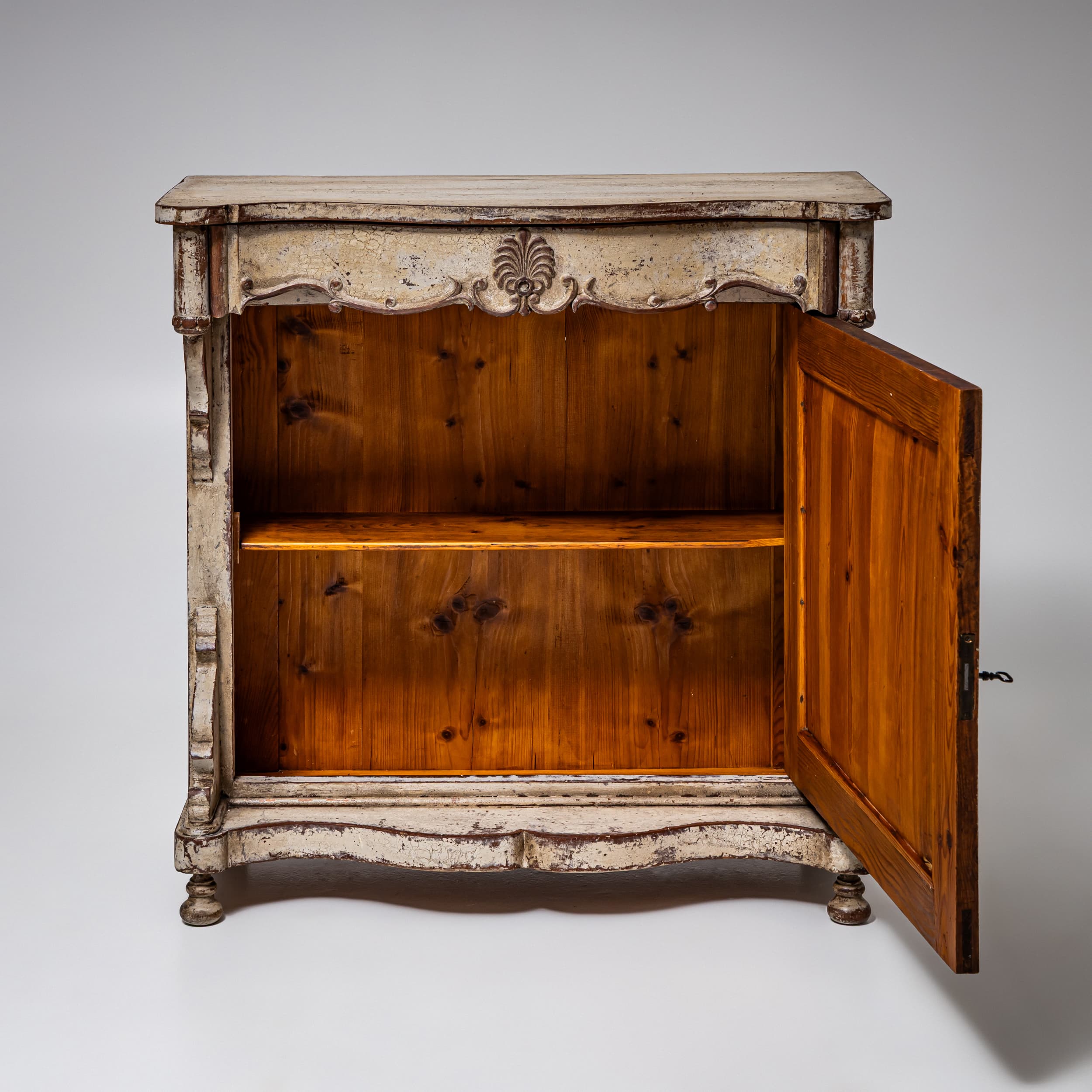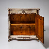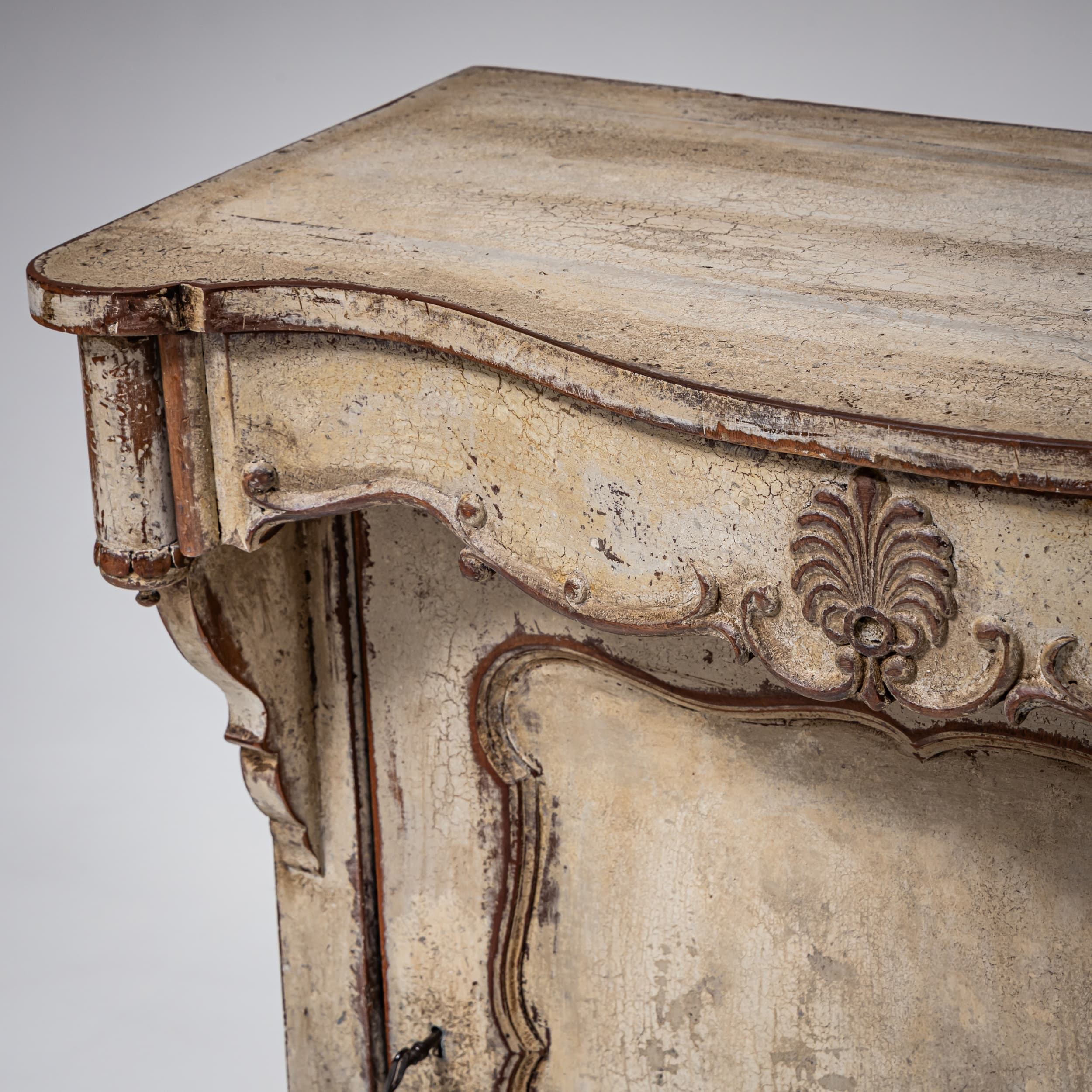 Half cabinet with a single door featuring a shaped panel, curved corner ornaments, and a drawer with carved shell decoration. The top is gently curved. The off-white paint finish is newly applied and has been given an antique patina.