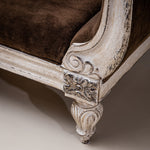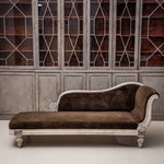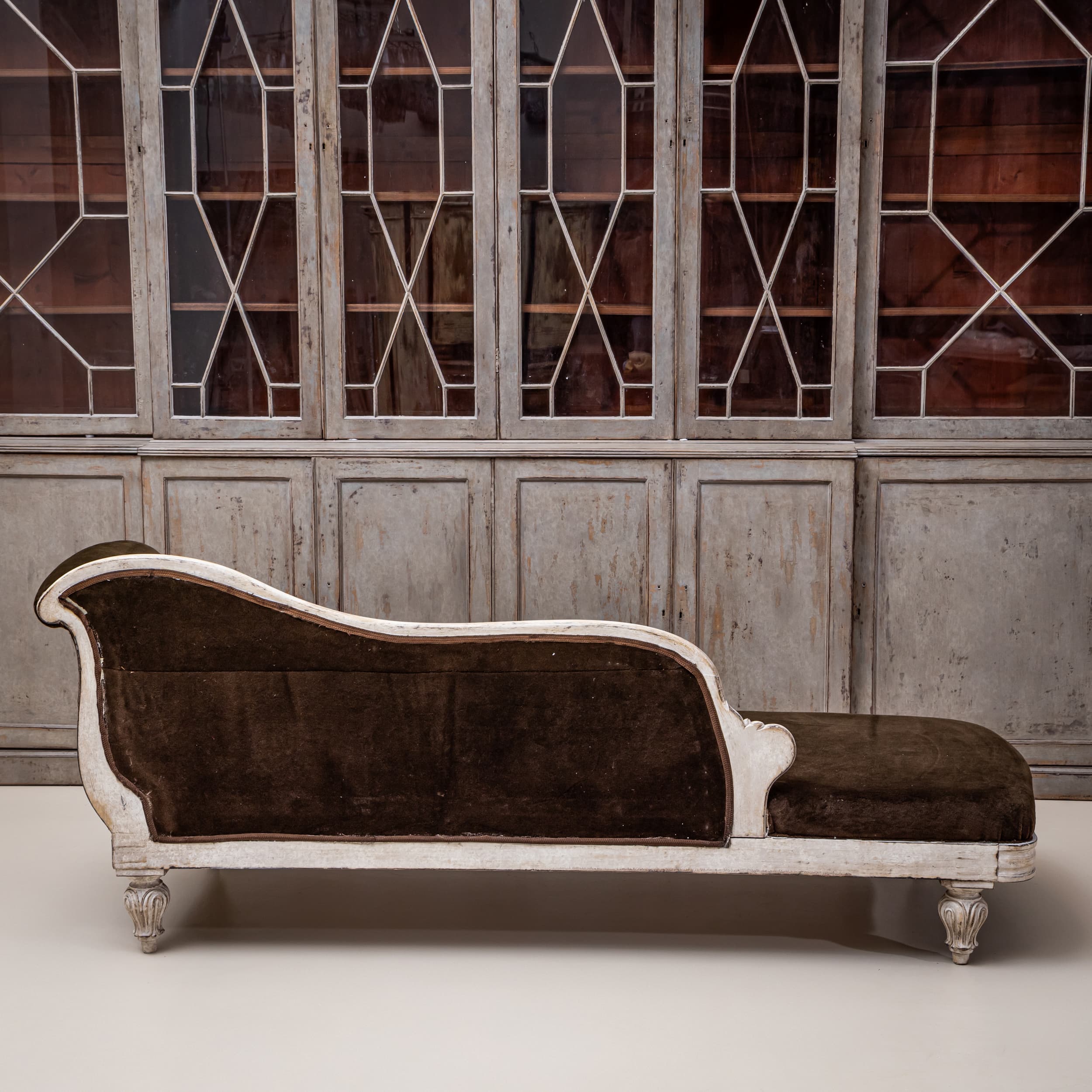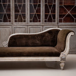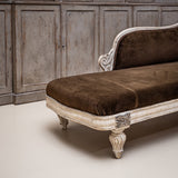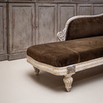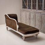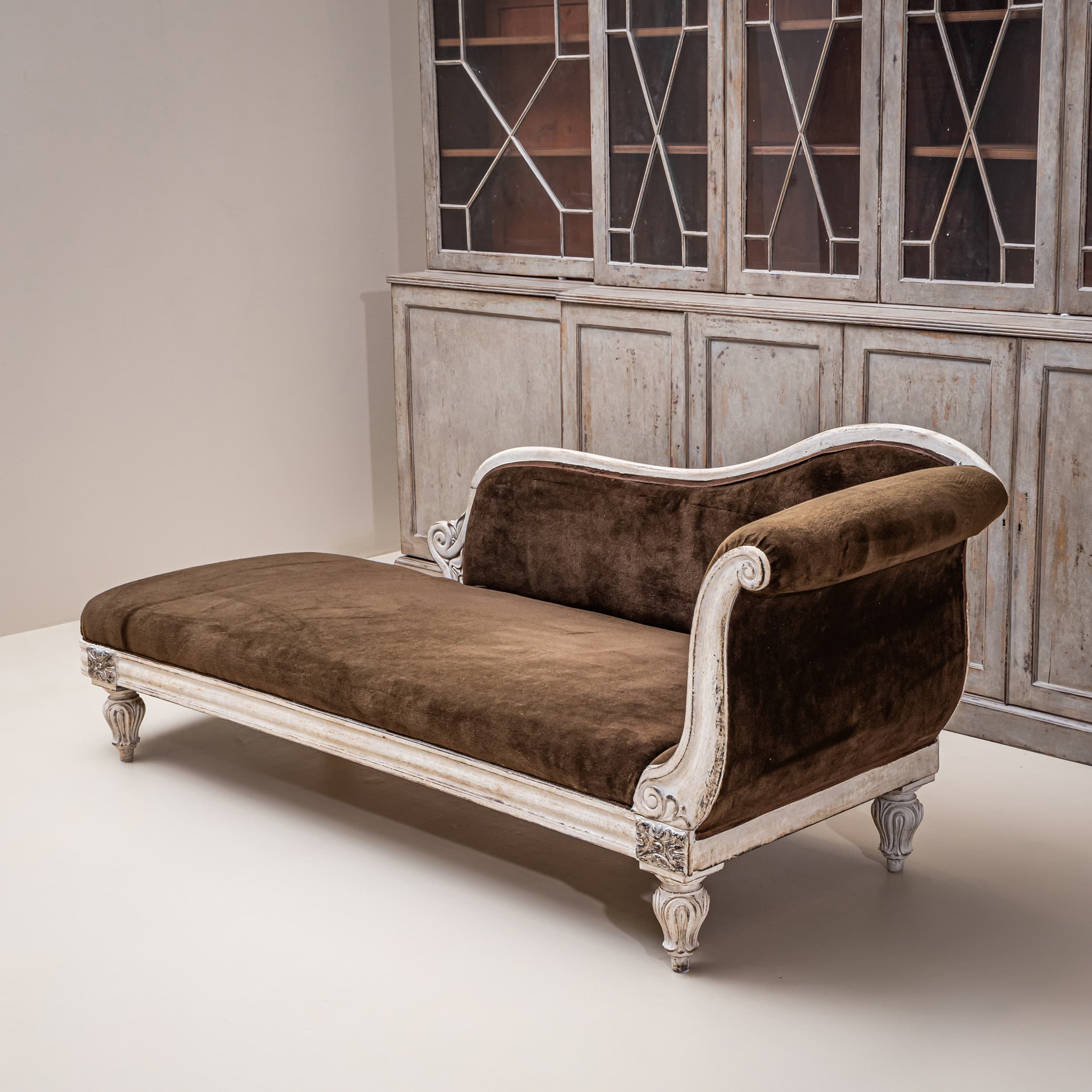 Elegant recamier in the Louis XVI style, featuring a right-aligned, gracefully curved backrest and a sleigh-shaped head section. The piece stands on baluster-shaped legs adorned with carved leaf motifs; the frame is finely profiled, and volutes accentuate the flowing lines of the back. Newly upholstered and covered in a brown velvet fabric. The cream-white finish is new and has been antique-patinated in the French Provincial manner.