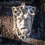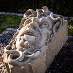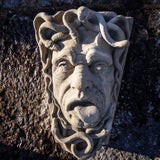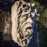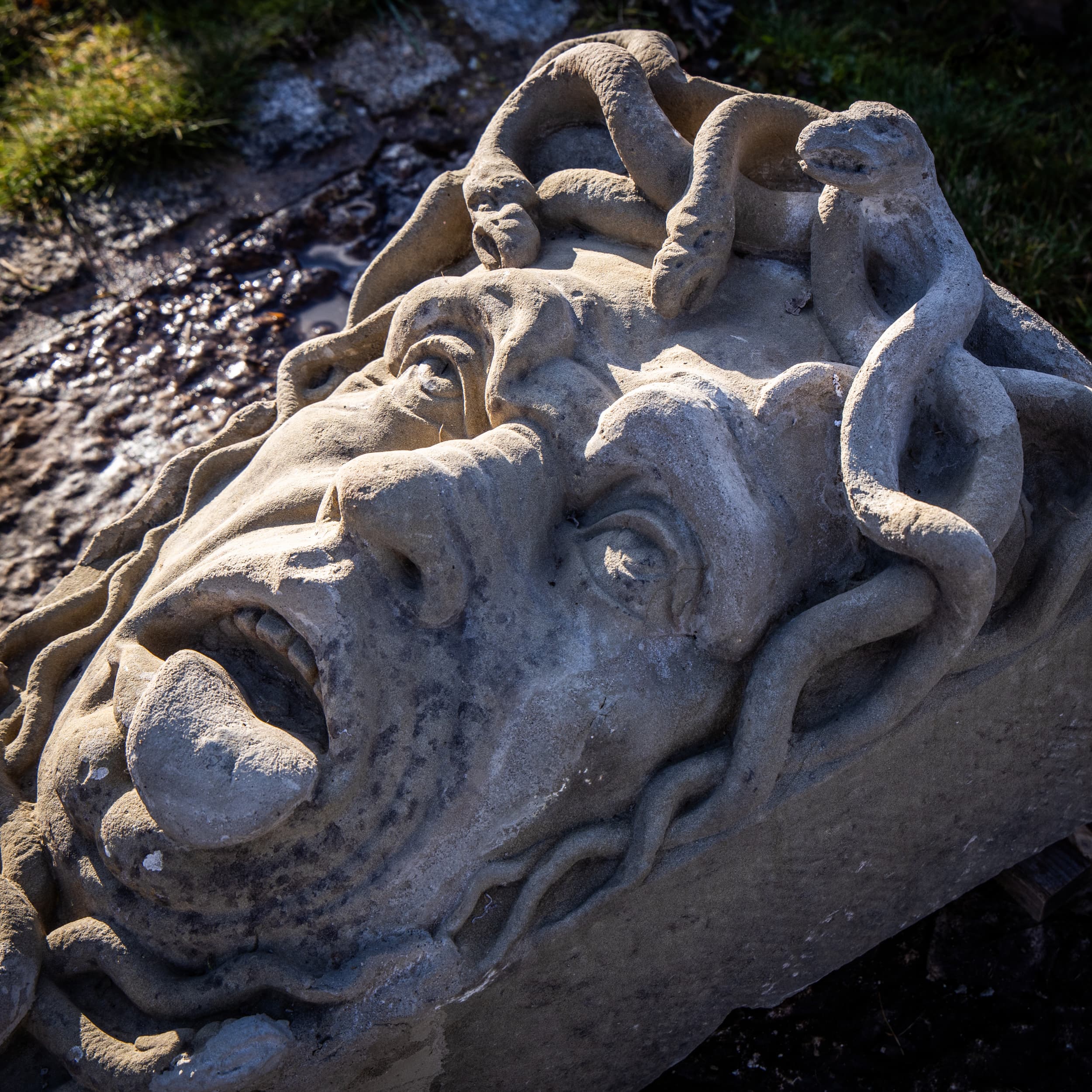 Sandstone keystone carved as a Medusa, featuring detailed snake hair and protruding tongue.