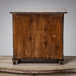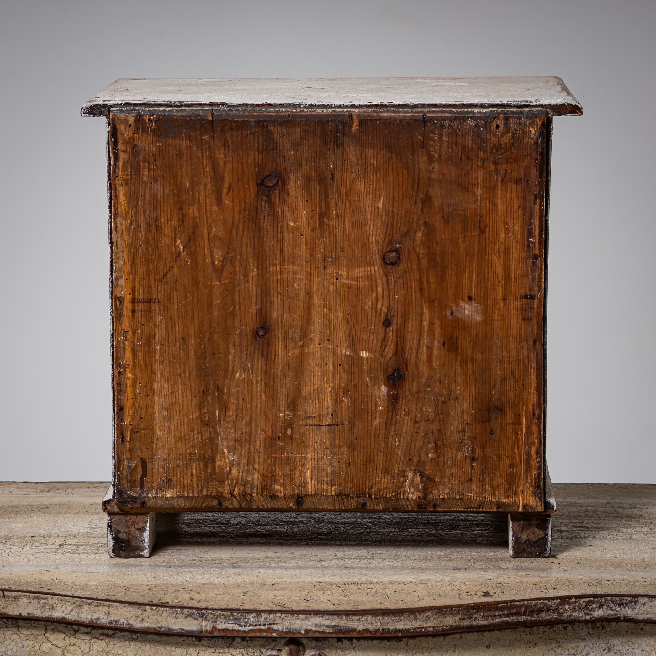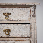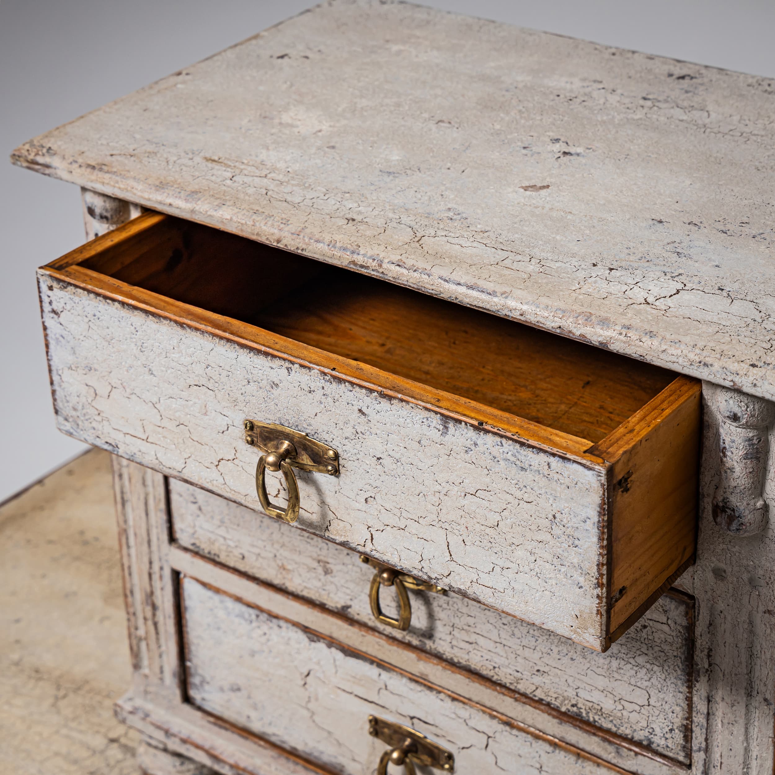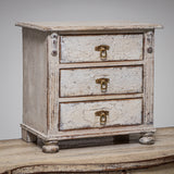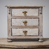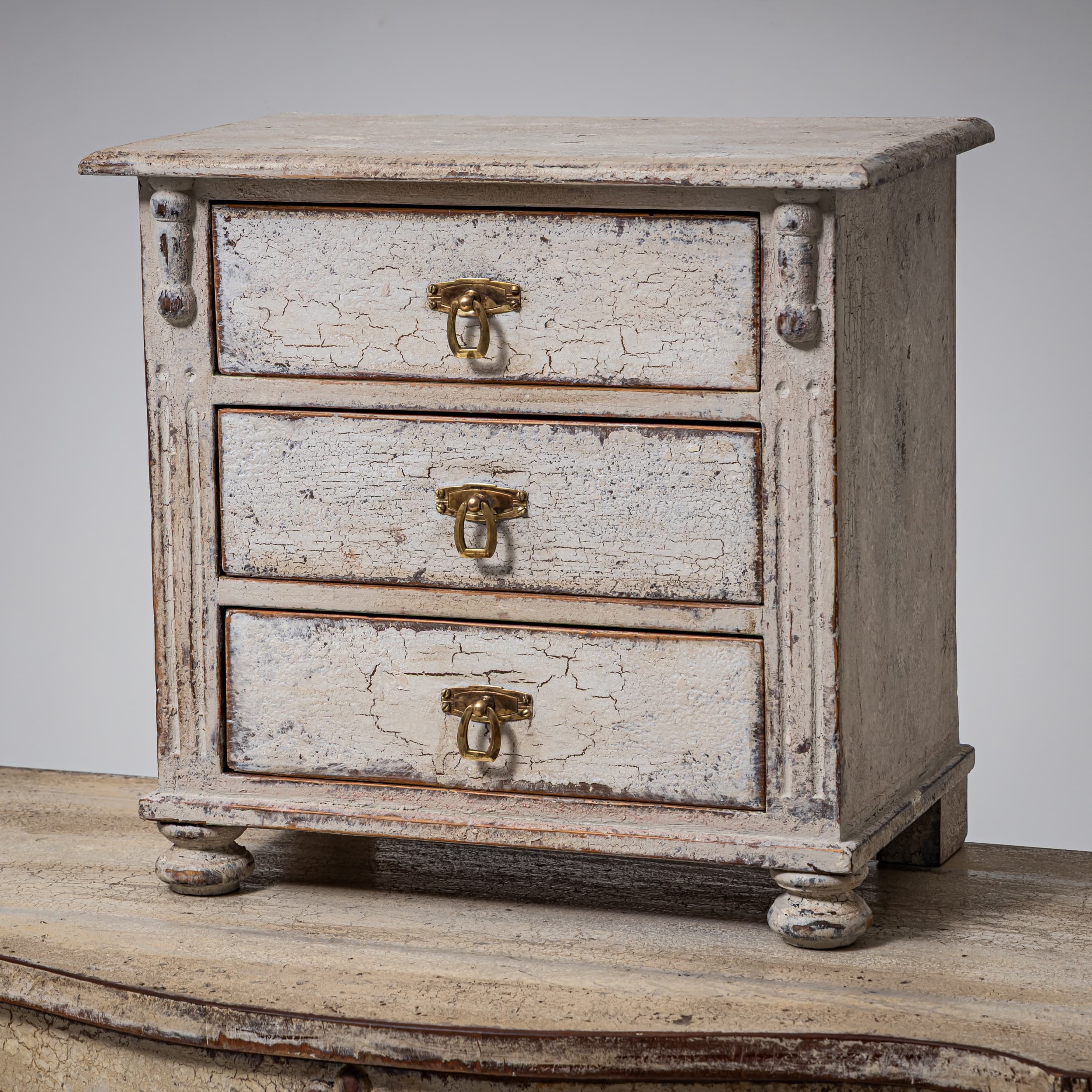 Miniature commode with three drawers, fluted pilasters, and compressed bun feet. The drawers feature brass pull handles. The light grey paint finish is newly applied and given an antique patina.