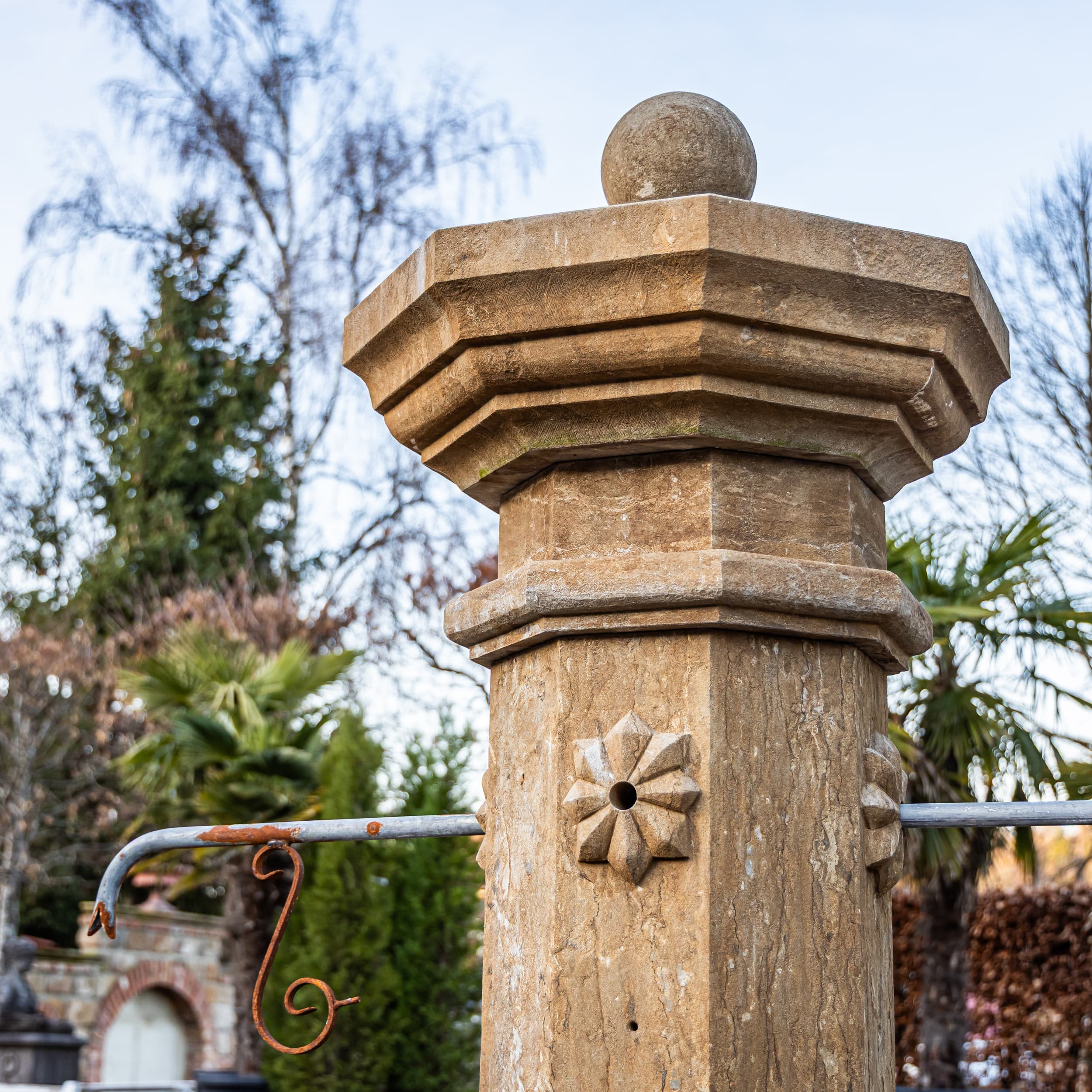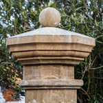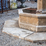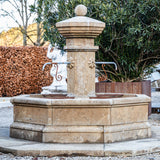 Large courtyard fountain featuring an octagonal basin (H: 63 × Ø195 cm) and a slender octagonal column (H: 195 cm) topped with a stone sphere. Four stylized rosettes mark the water spouts. The fountain is newly handcrafted from natural stone. Additional perimeter paving stones extend the overall diameter to 315 cm.